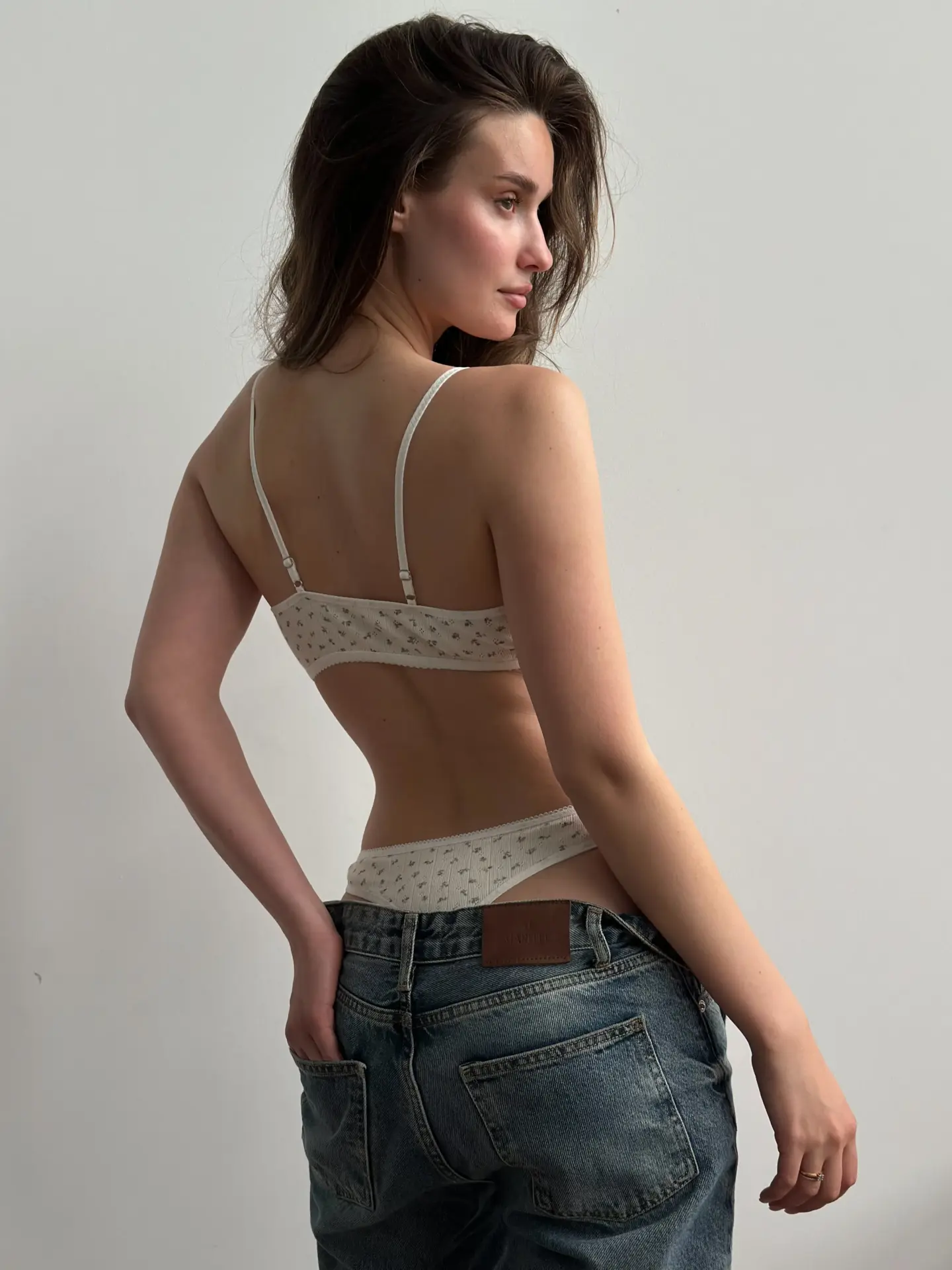 Top braletka z ribany prążkowanej, kremowy w niebieskie kwiatki
