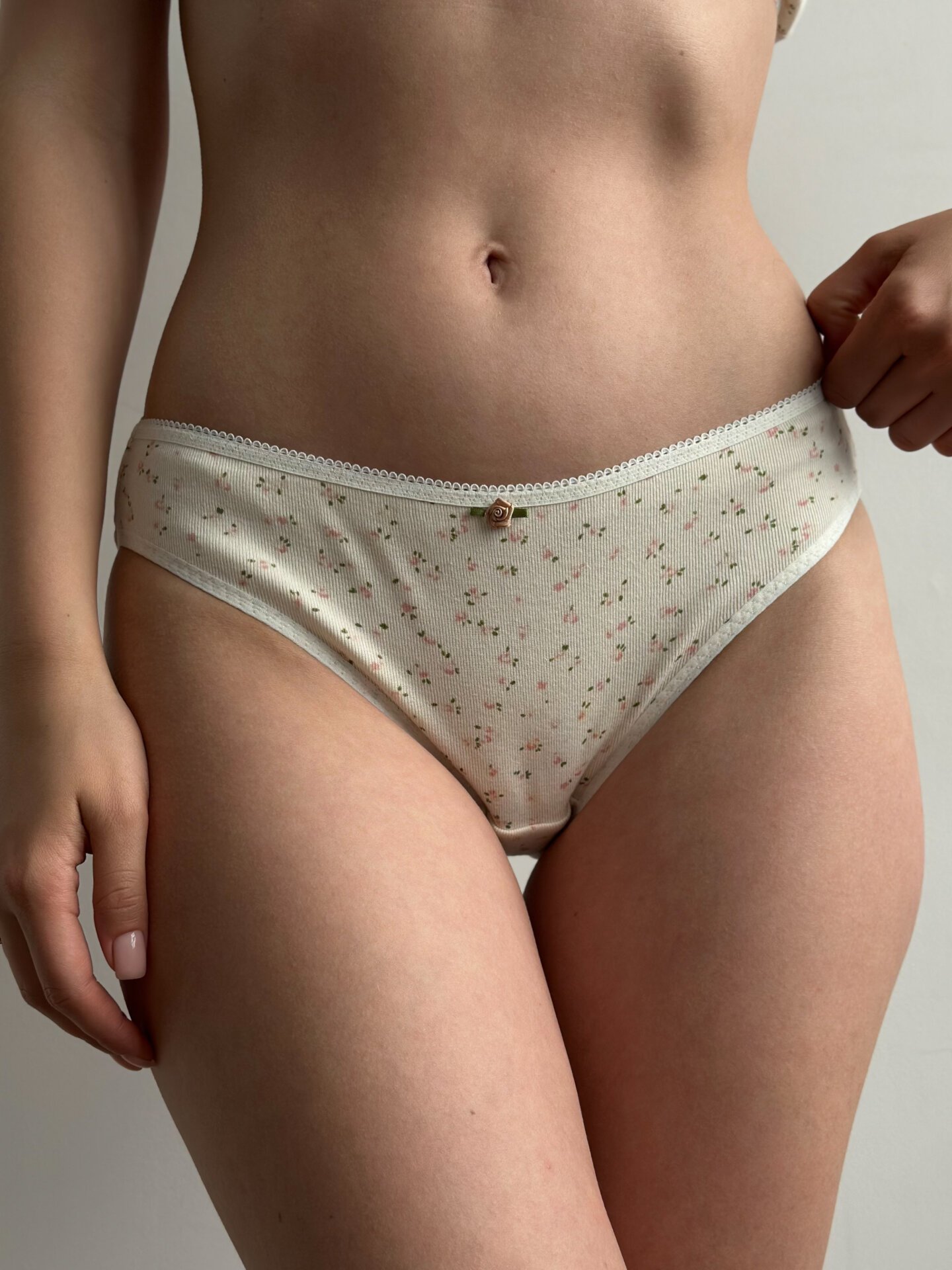 Majtki Slip z ribany gładkiej, kremowe w różowe róże