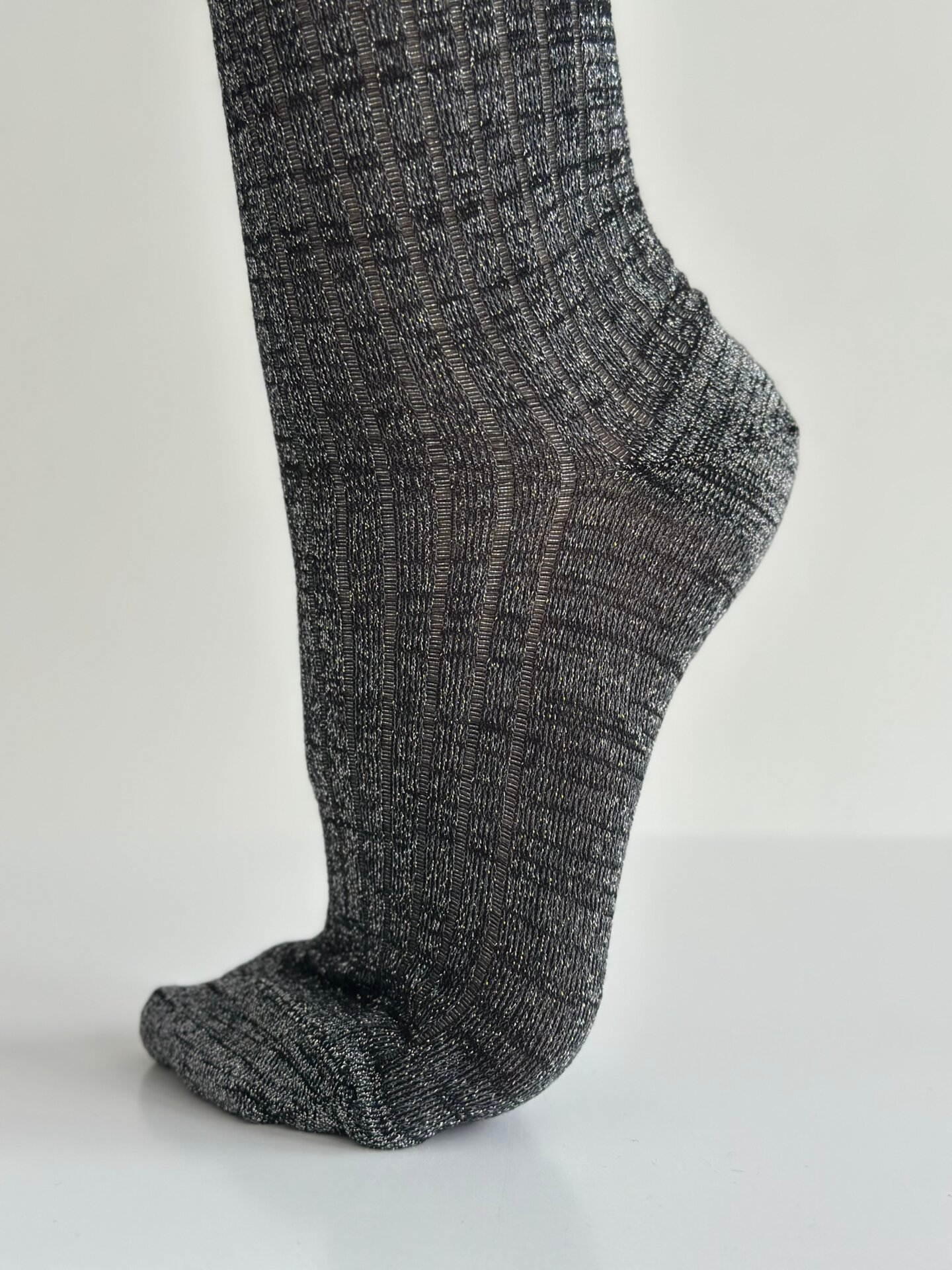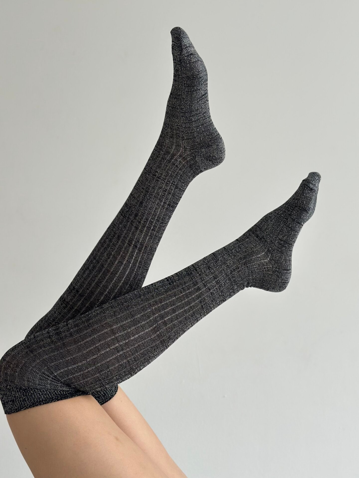 Wysokie getry z lureksem łączą styl i komfort. Miękki, połyskujący materiał tworzy efektowny wygląd i dodaje stylizacji odświętnego charakteru.