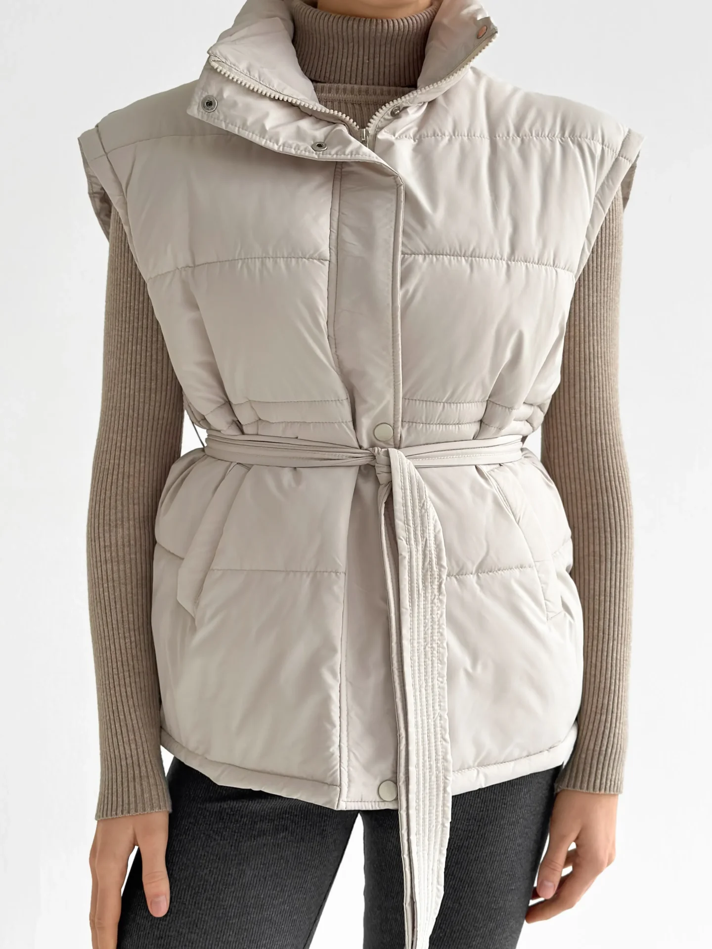 Kamizelka pikowana, puchowa, z paskiem, jasnobeżowa