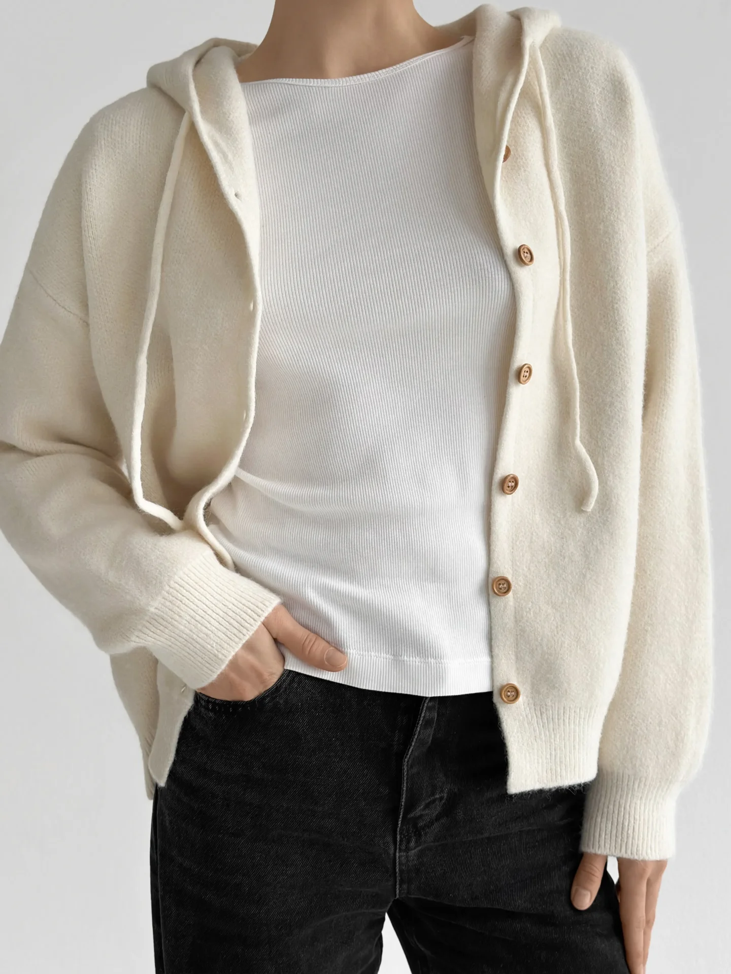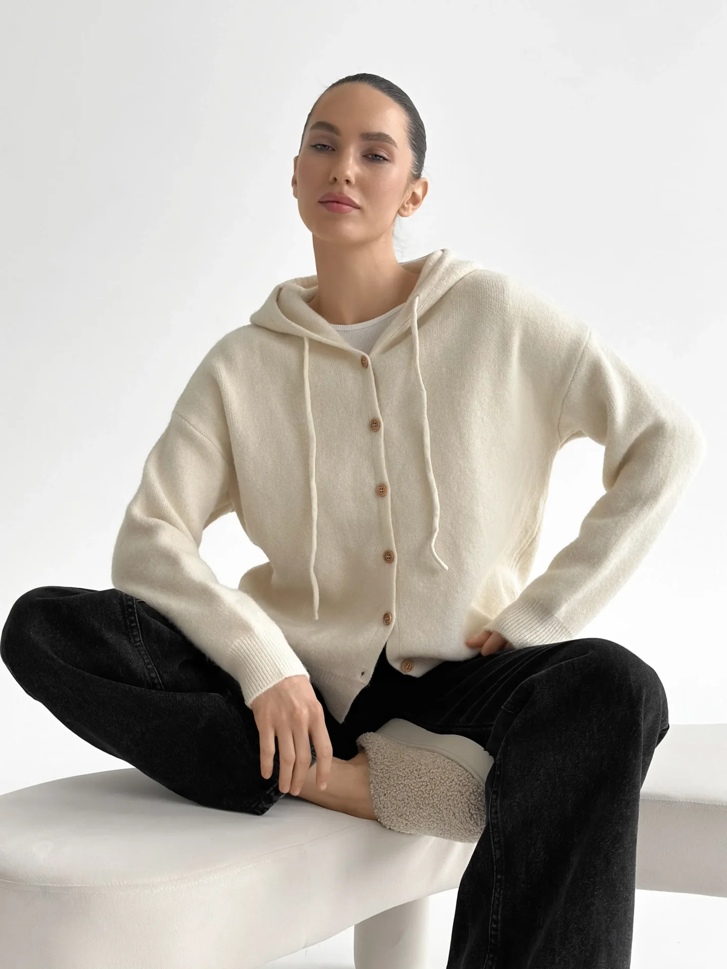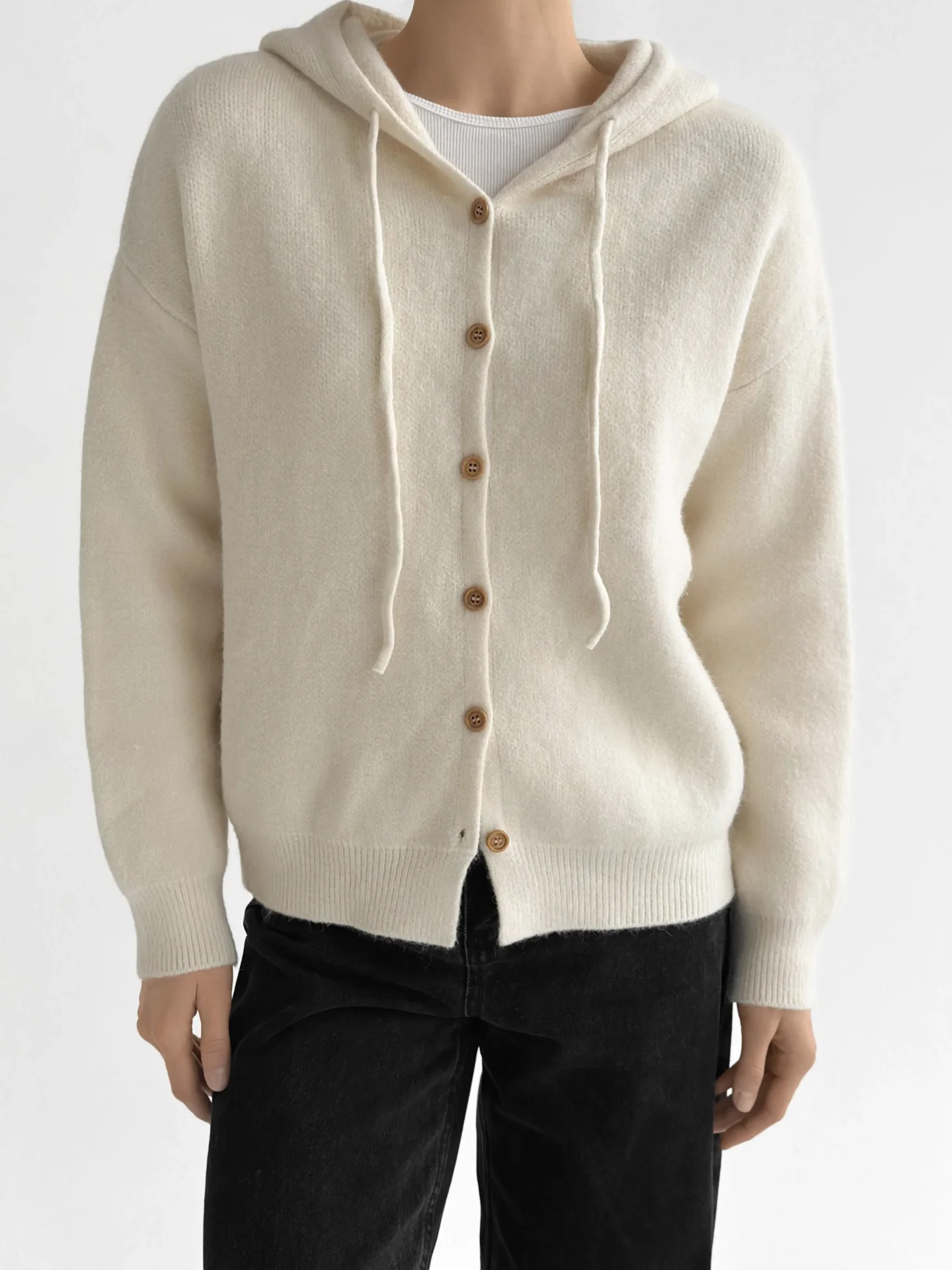 Miękki, ciepły i wygodny kardigan, wyposażony w kaptur i klasyczne guziki. Przyjemny w dotyku, dobrze utrzymuje kształt i ogrzewa w chłodniejsze dni. Łatwo łączy się z podstawowymi elementami garderoby i nadaje stylizacji nowoczesnej przytulności.
