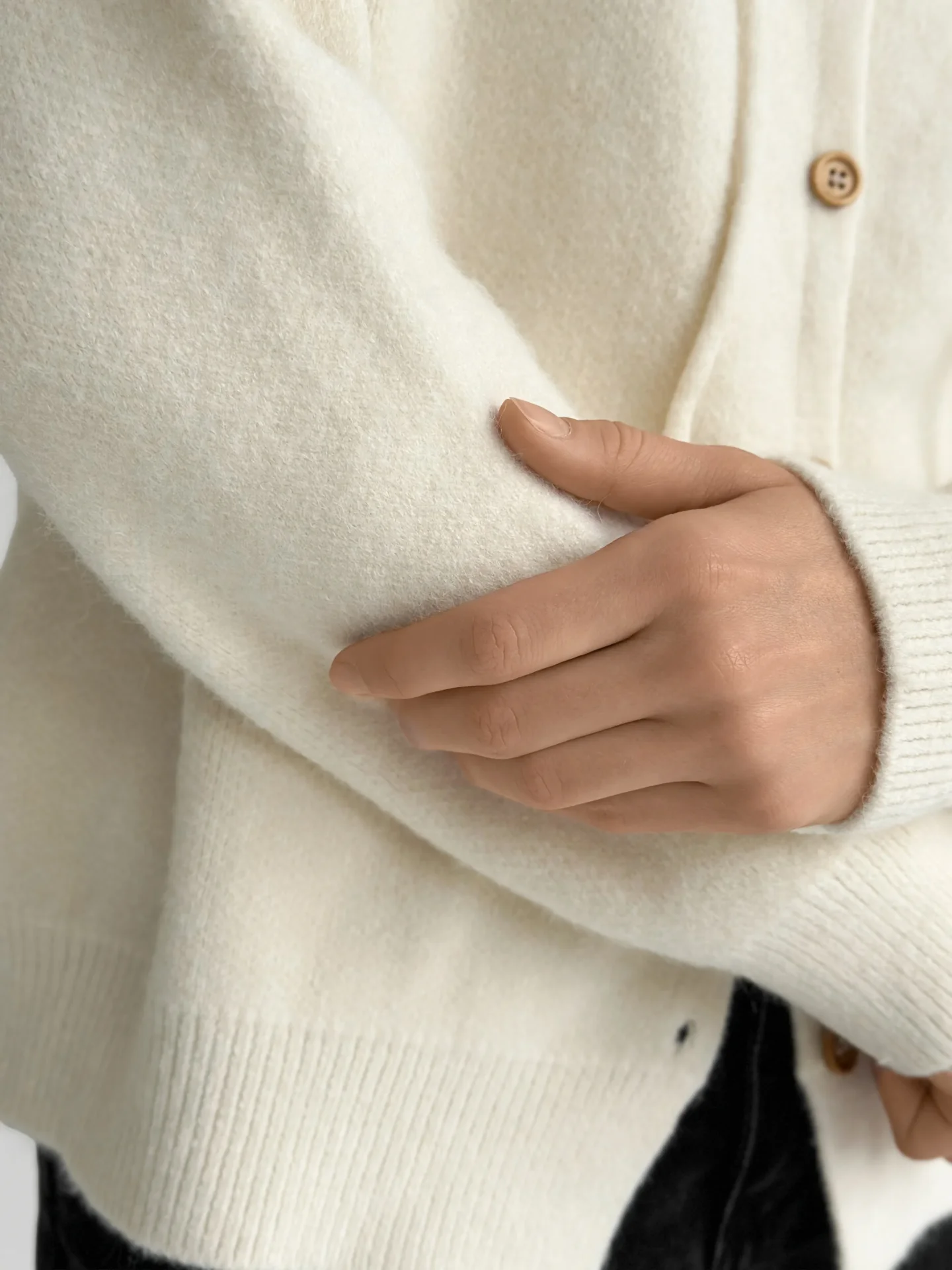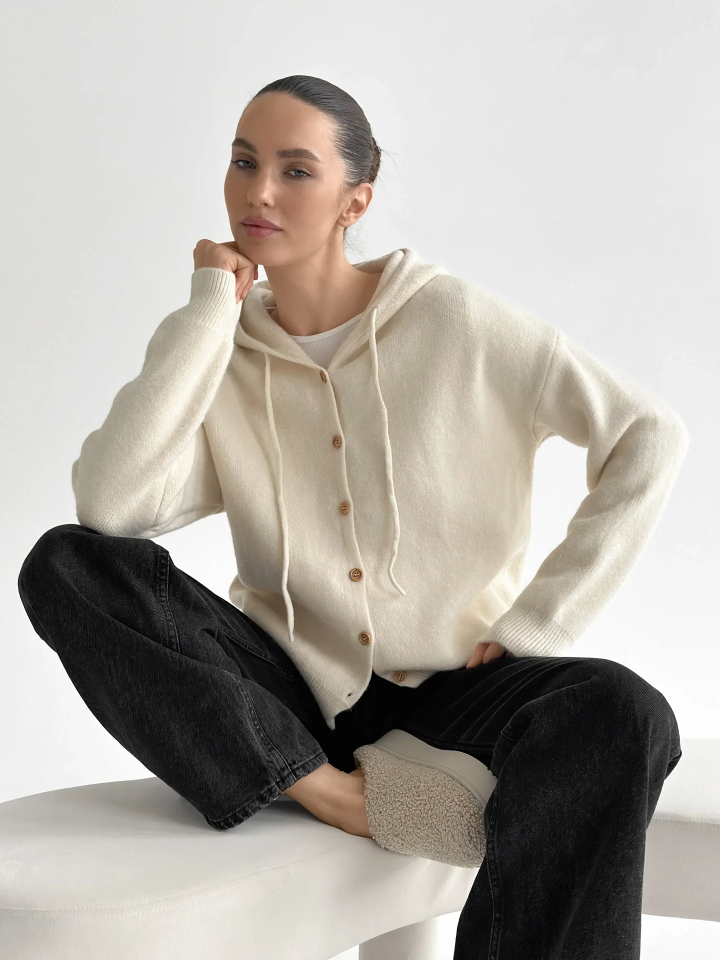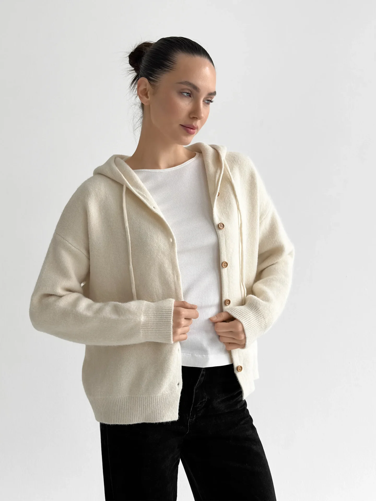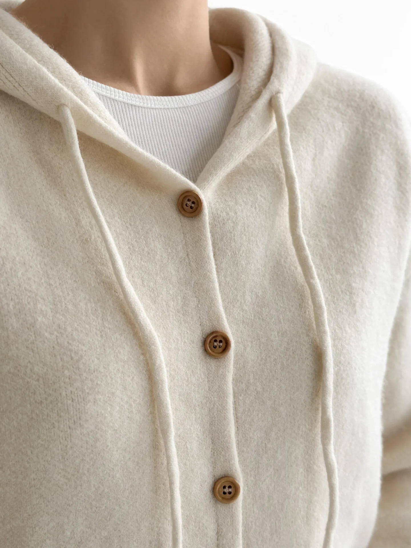 Miękki, ciepły i wygodny kardigan, wyposażony w kaptur i klasyczne guziki. Przyjemny w dotyku, dobrze utrzymuje kształt i ogrzewa w chłodniejsze dni. Łatwo łączy się z podstawowymi elementami garderoby i nadaje stylizacji nowoczesnej przytulności.