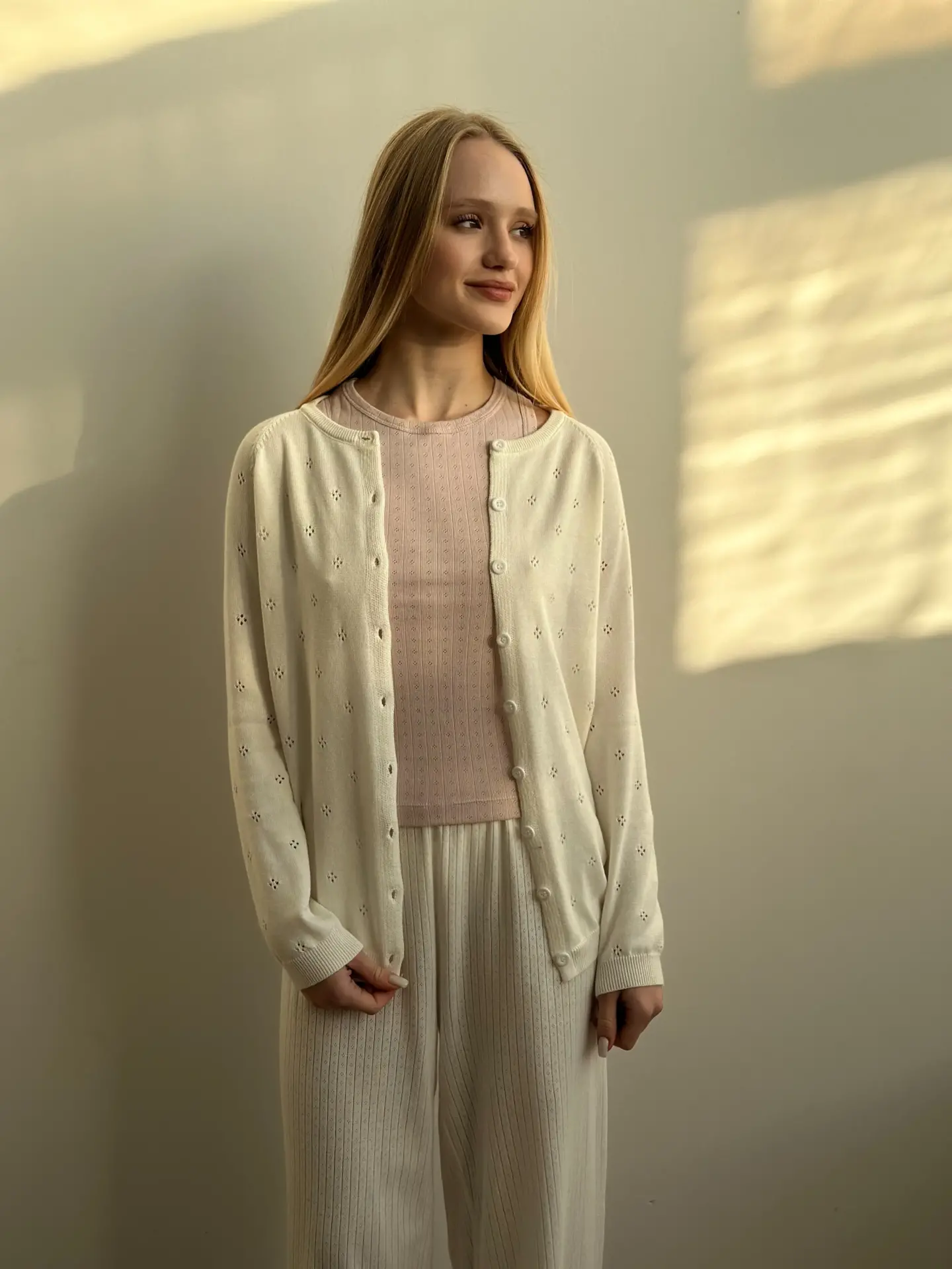 Bawełniany kardigan zapinany na guziki to uniwersalny wybór dla stylowego i wygodnego wyglądu. Naturalny materiał zapewnia komfort, a klasyczny design z guzikami dodaje elegancji i praktyczności.