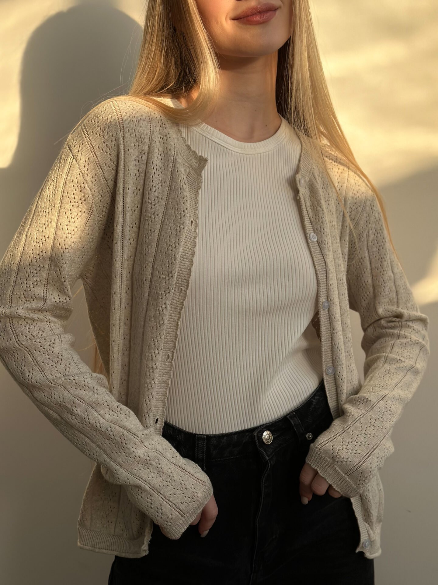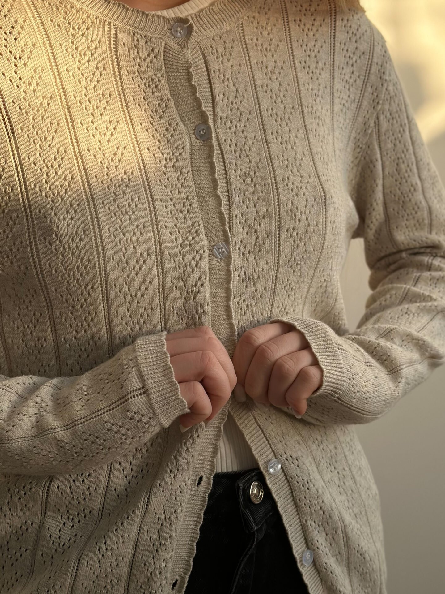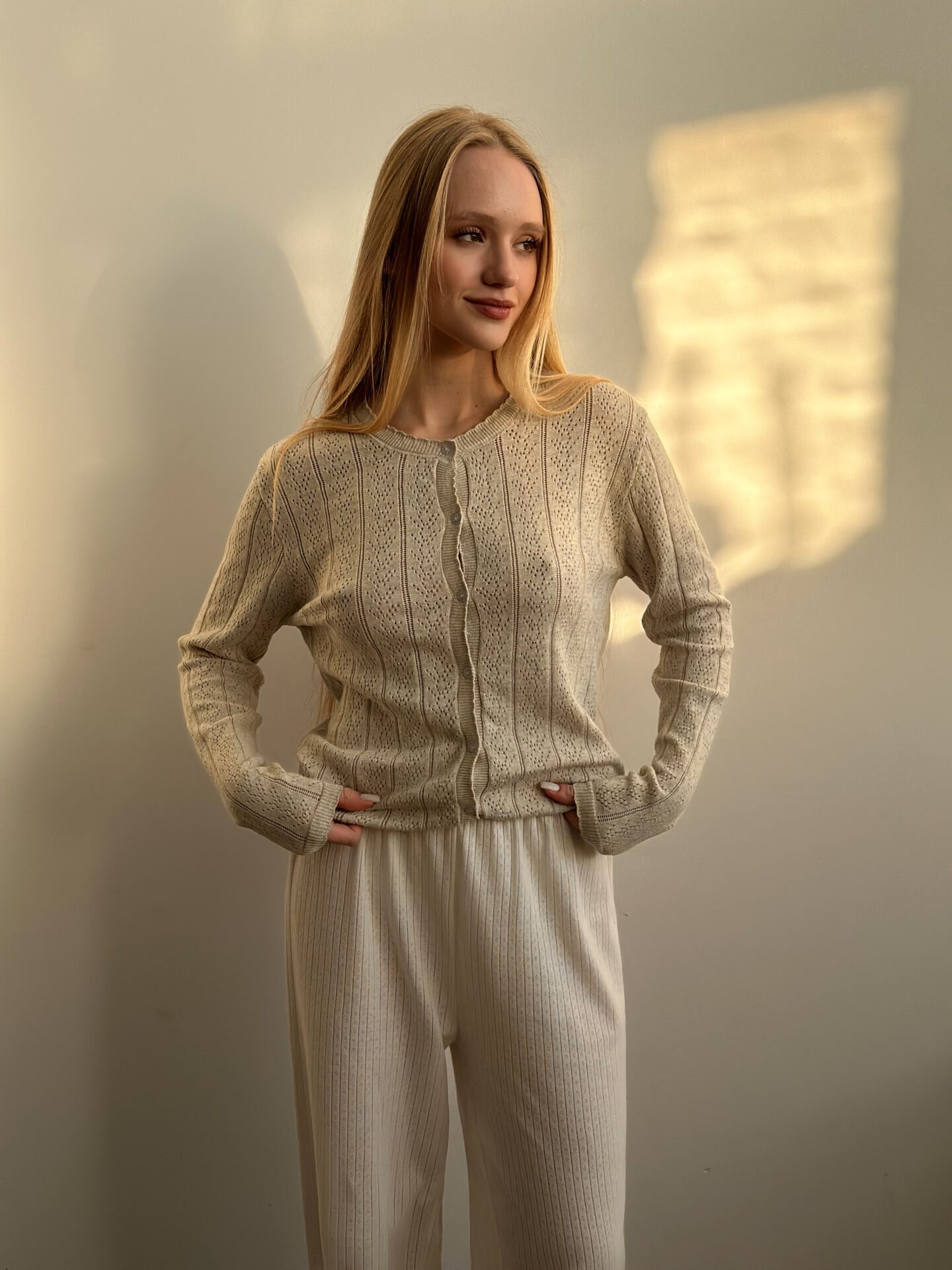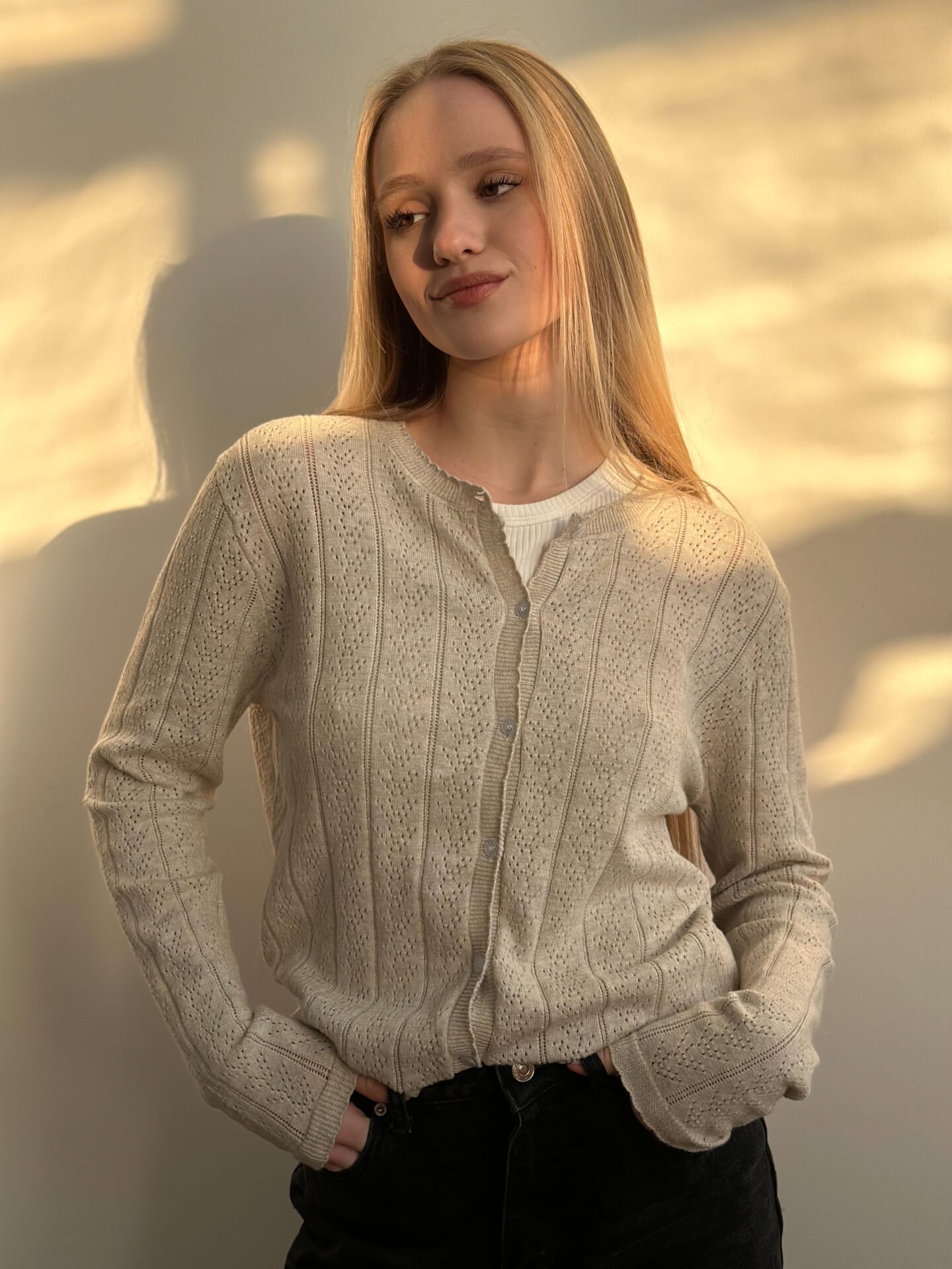 Bawełniany kardigan zapinany na guziki to uniwersalny wybór dla stylowego i wygodnego wyglądu. Naturalny materiał zapewnia komfort, a klasyczny design z guzikami dodaje elegancji i praktyczności.