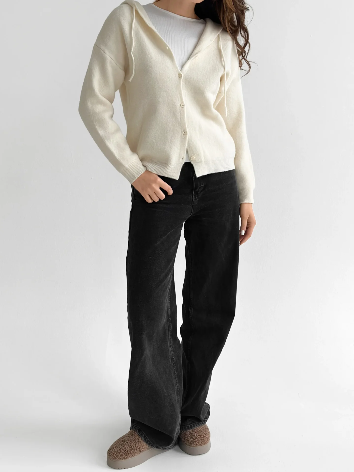 Miękki, ciepły i wygodny kardigan, wyposażony w kaptur i klasyczne guziki. Przyjemny w dotyku, dobrze utrzymuje kształt i ogrzewa w chłodniejsze dni. Łatwo łączy się z podstawowymi elementami garderoby i nadaje stylizacji nowoczesnej przytulności.