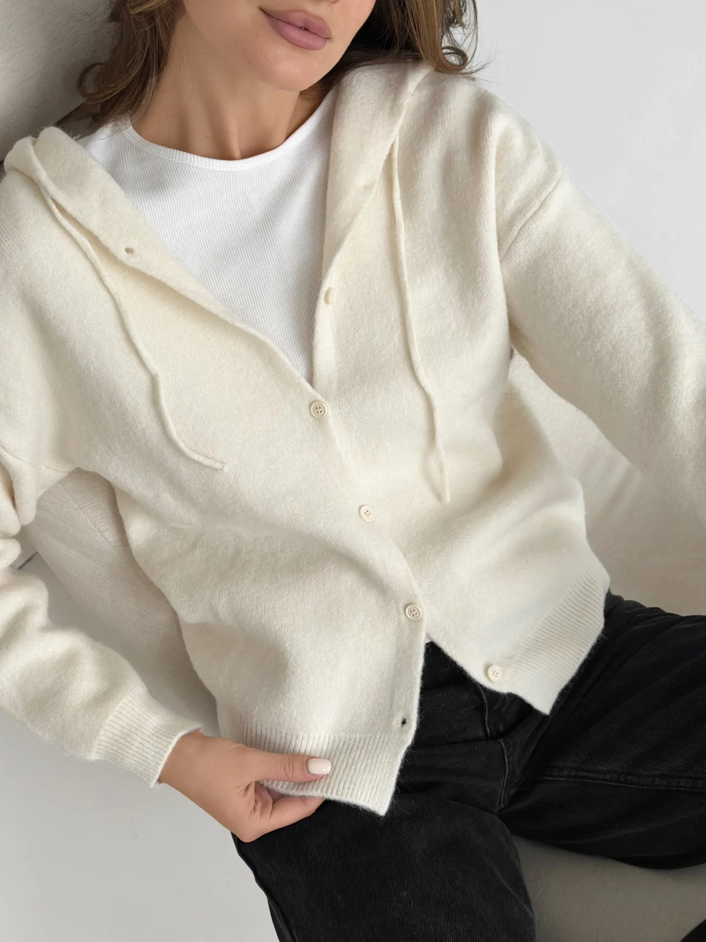 Kardigan na guziki z kapturem, kremowy