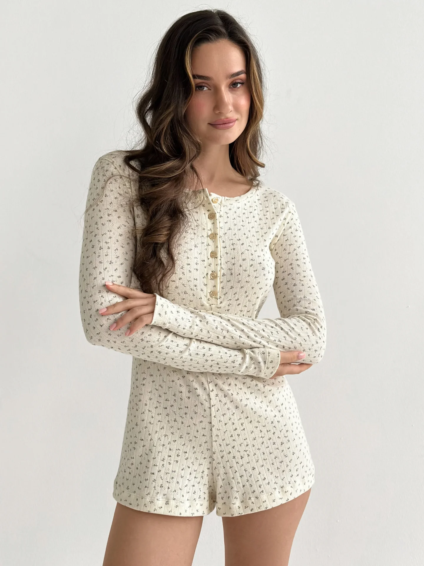 Kombinezon z dzianiny prążkowanej z długim rękawem łączy komfort z elegancką prostotą. Elastyczny, miękki materiał przyjemnie przylega do ciała, zapewniając swobodę ruchów. Prosty krój podkreśla sylwetkę, a długie rękawy dodają przytulności. Idealny wybór na domowy relaks lub stylowe codzienne stylizacje.
