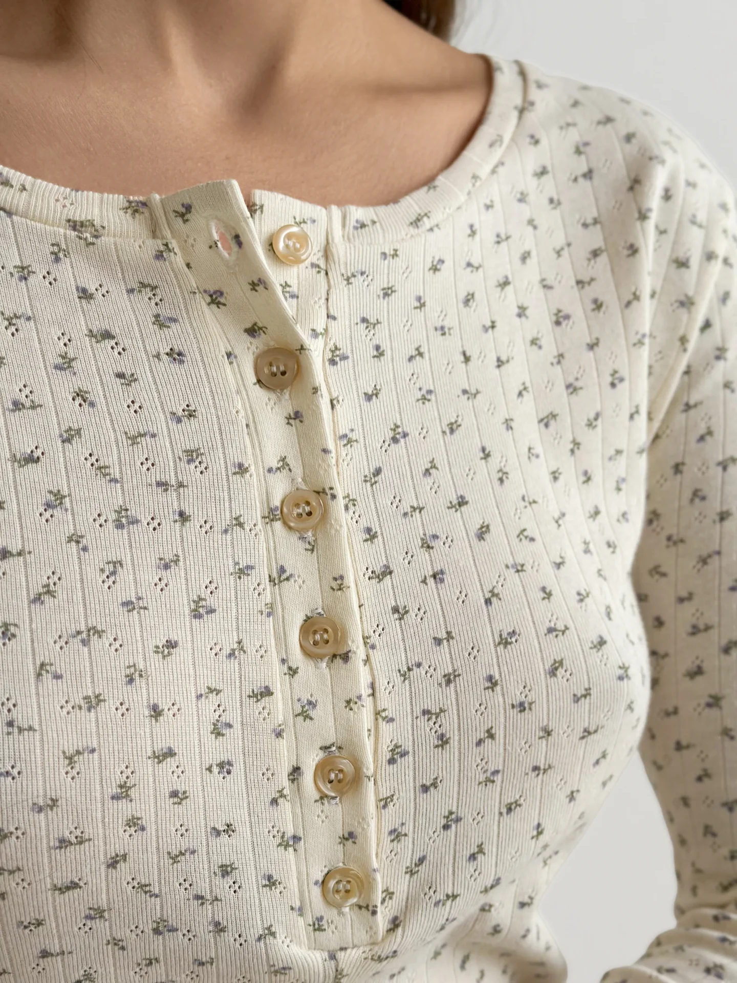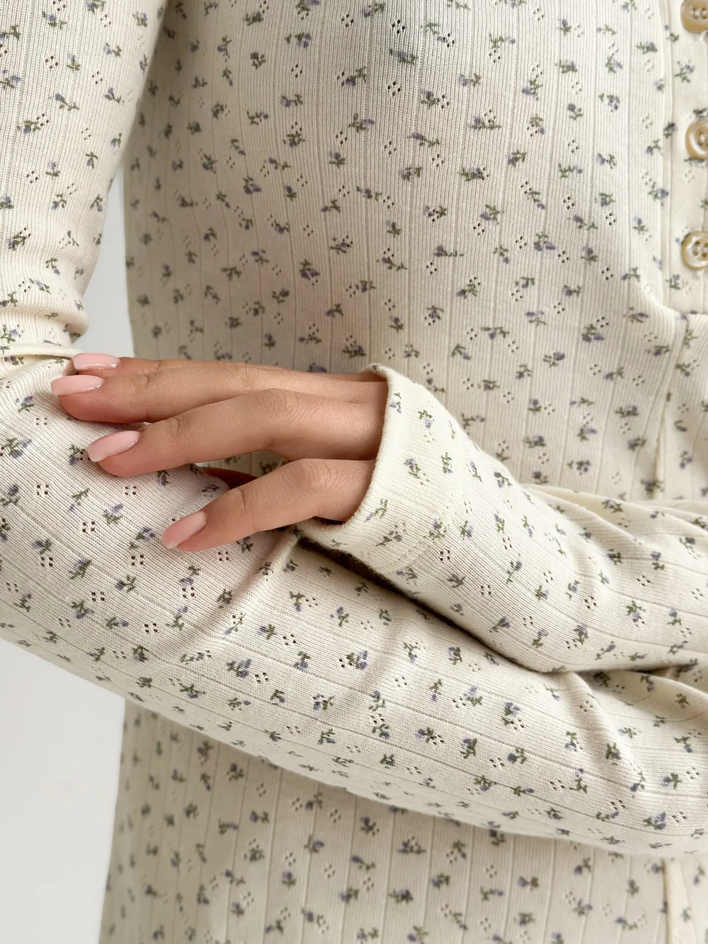Kombinezon z długim rękawem, z ribany prążkowanej, kremowy w niebieskie kwiatki