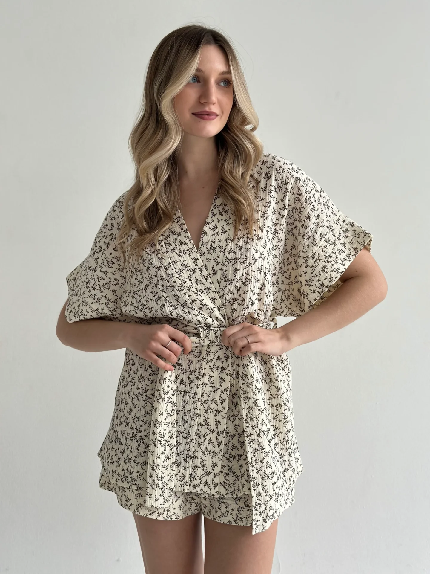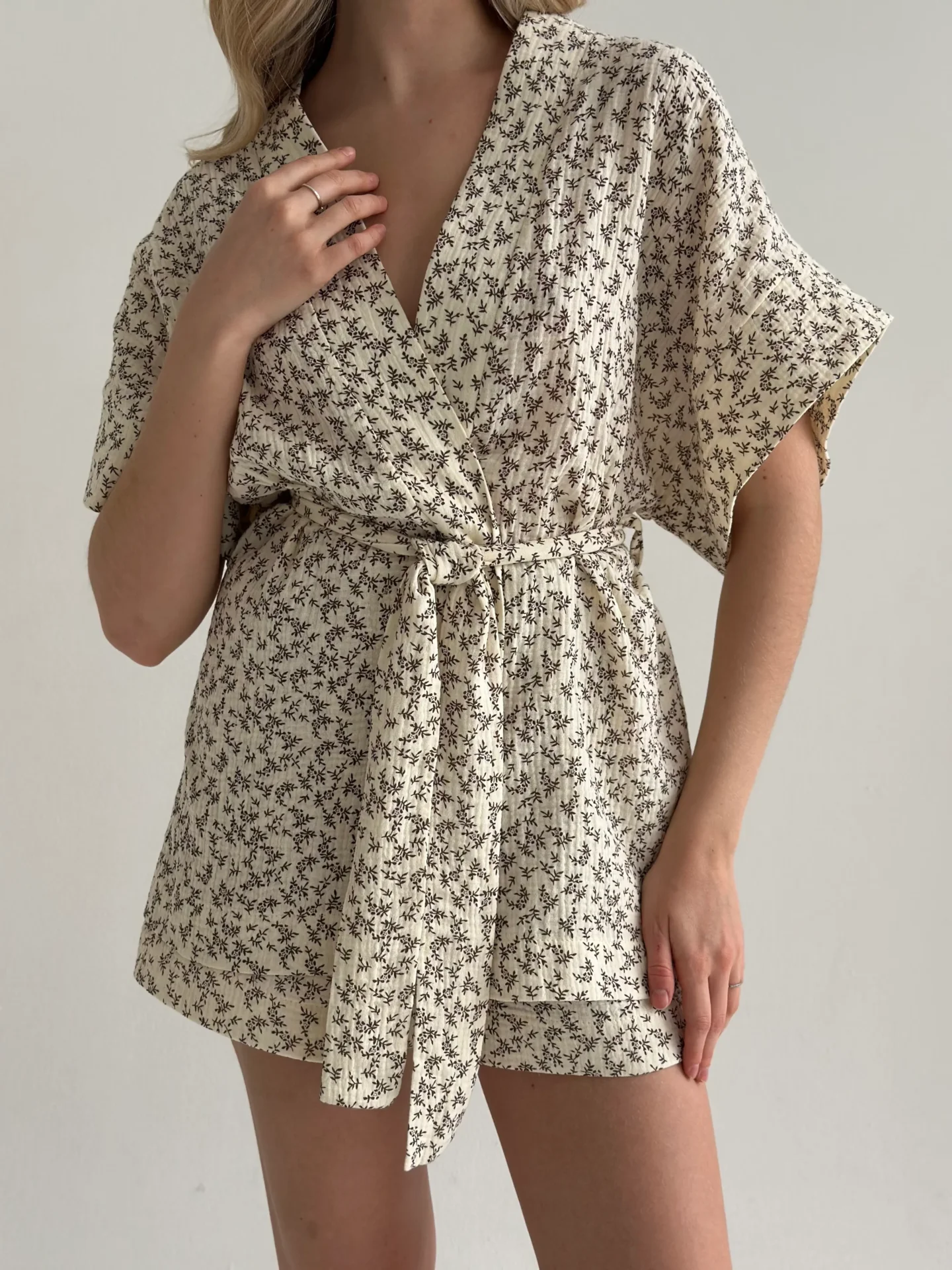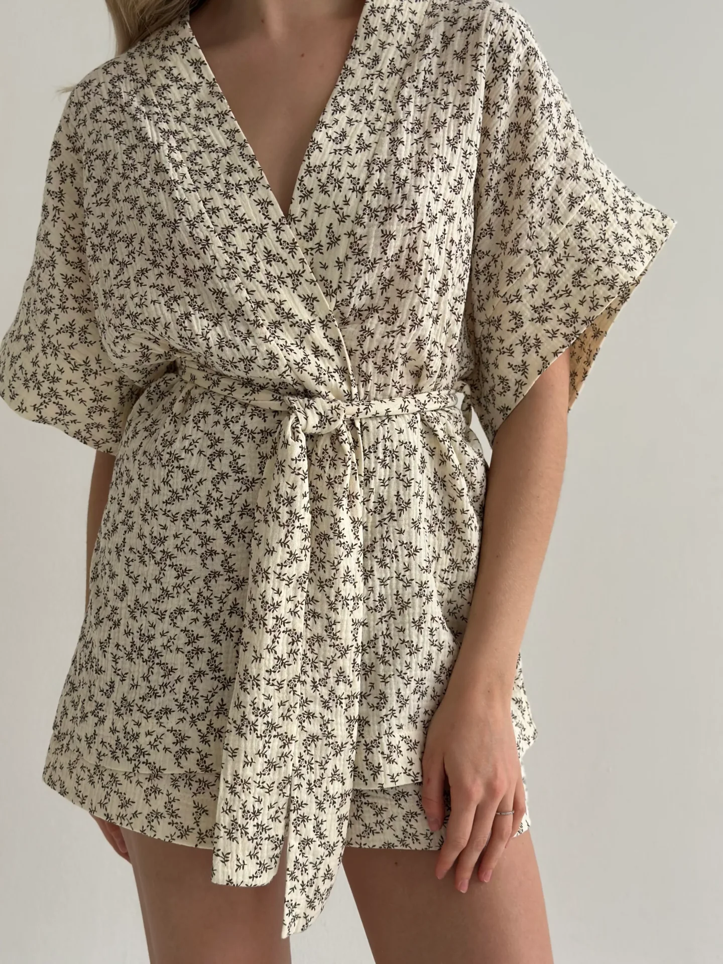 Lekki zestaw z muślinu: kimono i szorty z dwuwarstwowej tkaniny. Naturalny materiał zapewnia komfort i swobodę ruchów, idealny wybór na przytulne dni.
