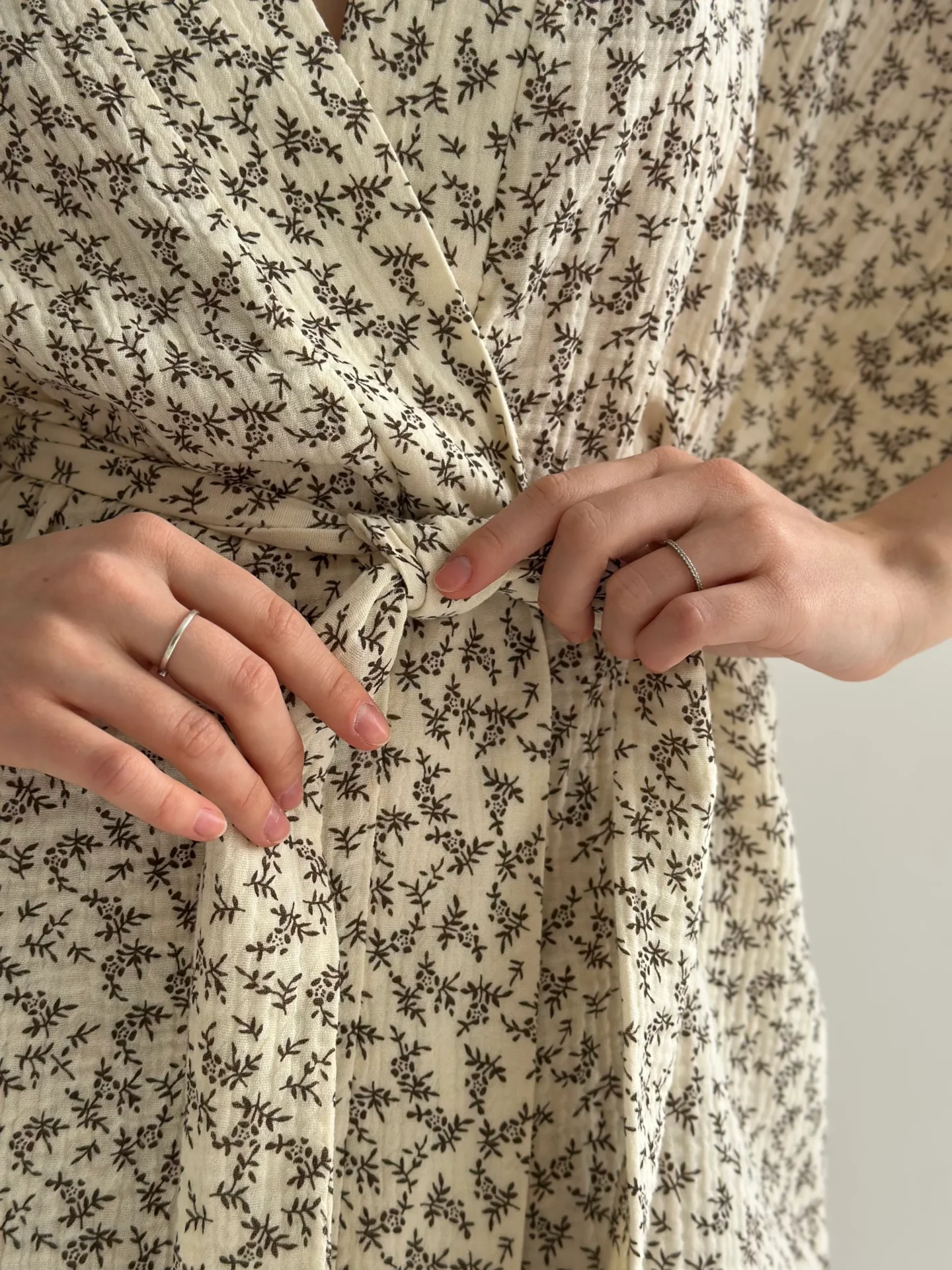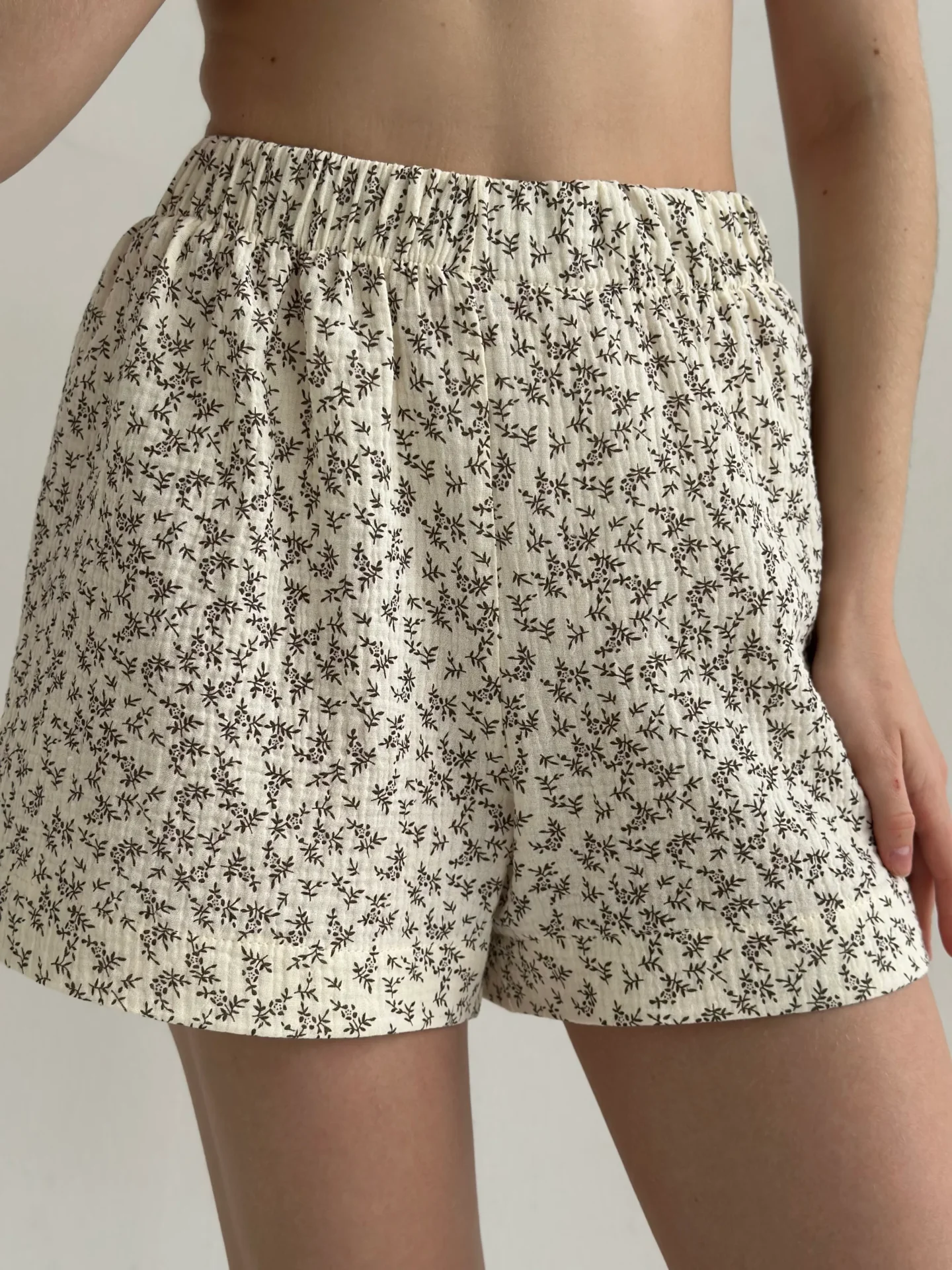 Komplet kimono i szorty z muślinu dwuwarstwowego, ecru w ciemnobrązowe gałązki