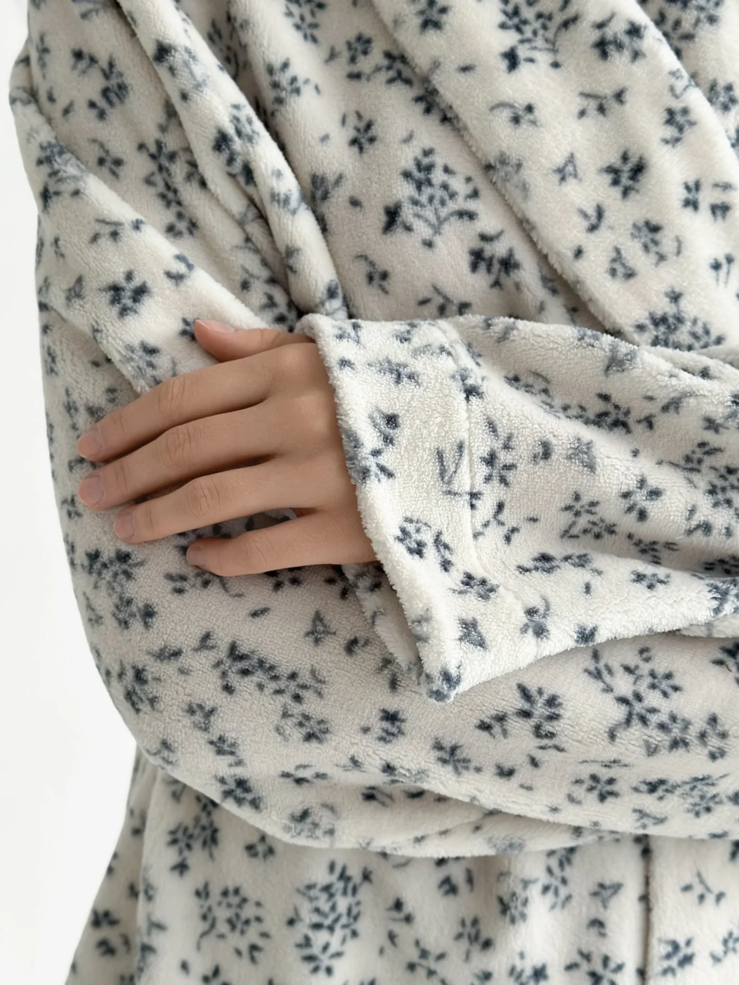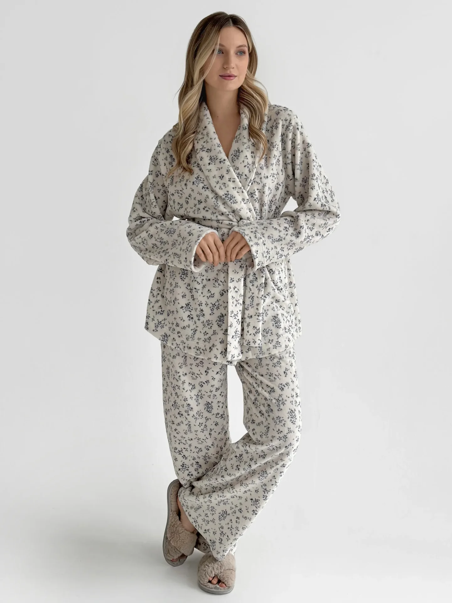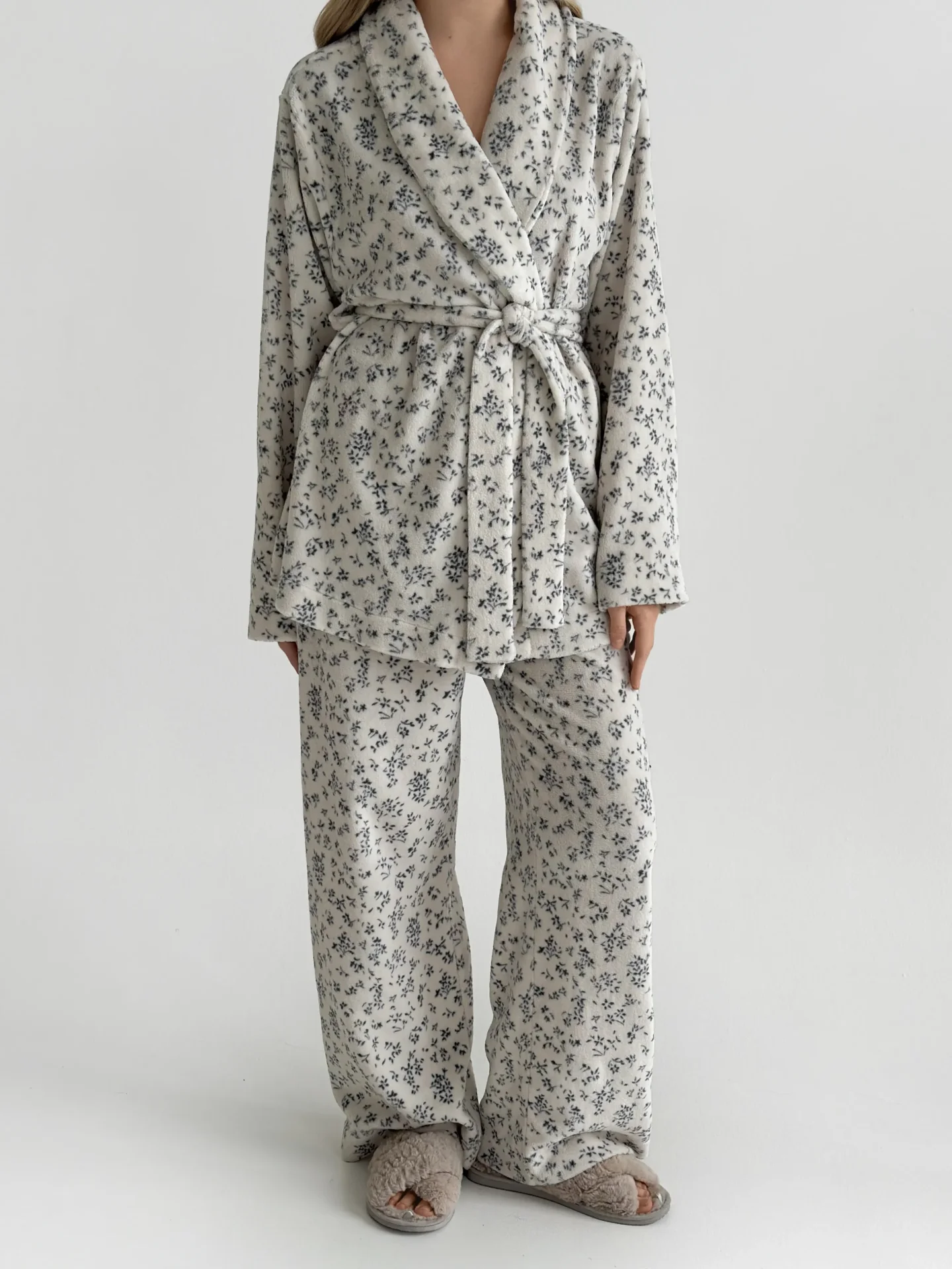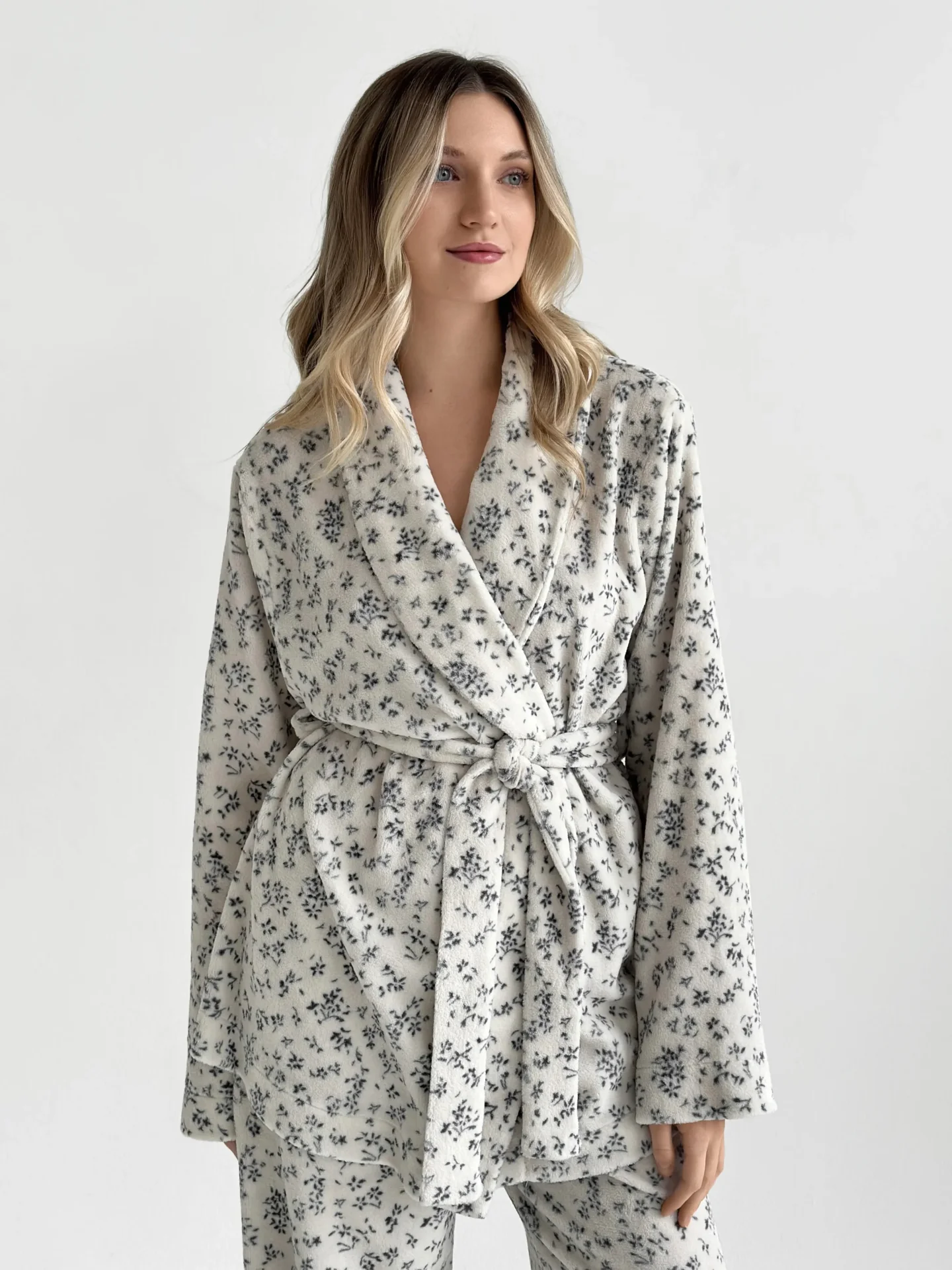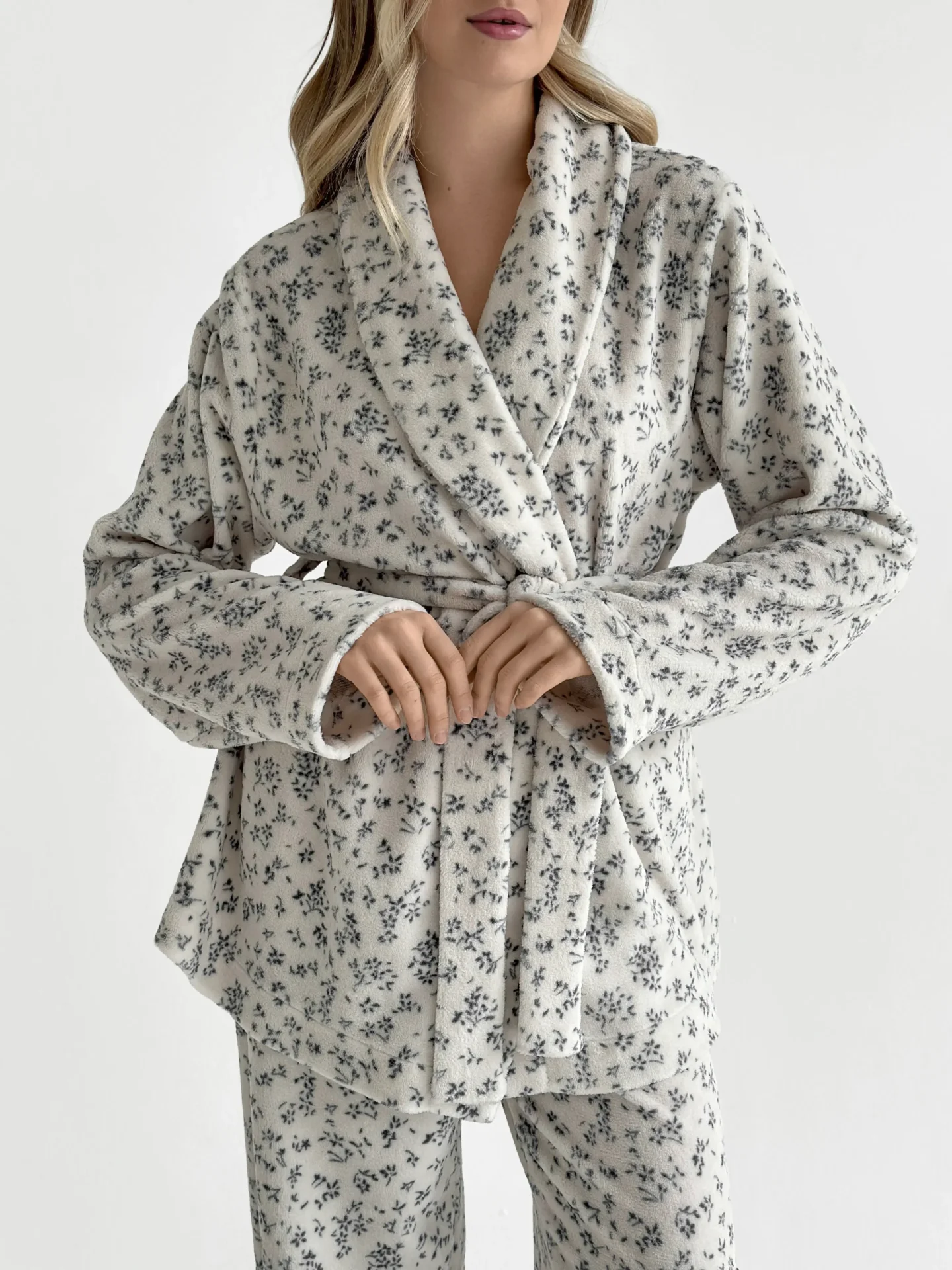 Komplet Koral bluza kopertowa z kołnierzem szalowym i spodnie, z weluru, biały w granatowe kwiatki