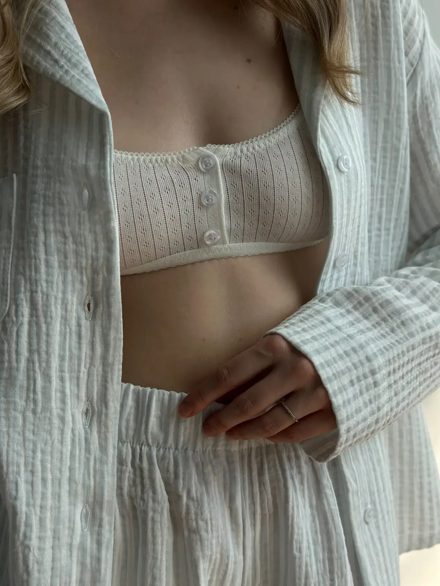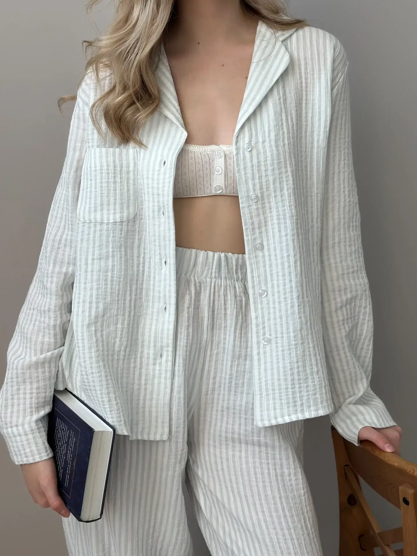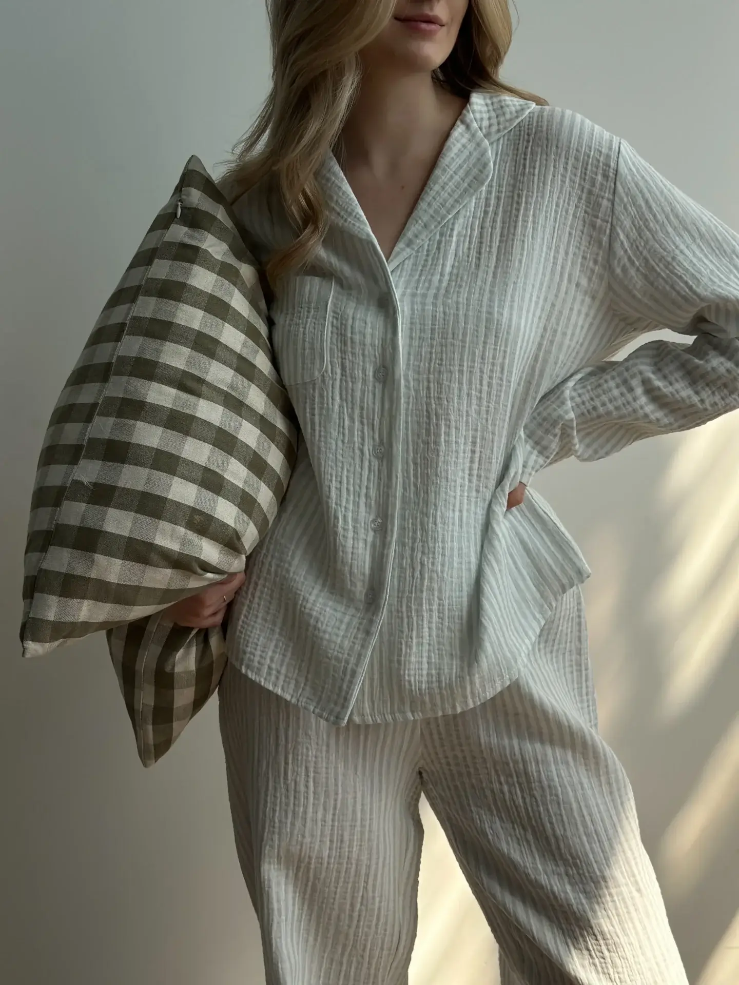 Komplet koszula i spodnie z muślinu to lekka wersja domowa, zapewniająca komfort noszenia na co dzień. Naturalny, miękki materiał jest przyjemny w dotyku i dobrze przepuszcza powietrze.
