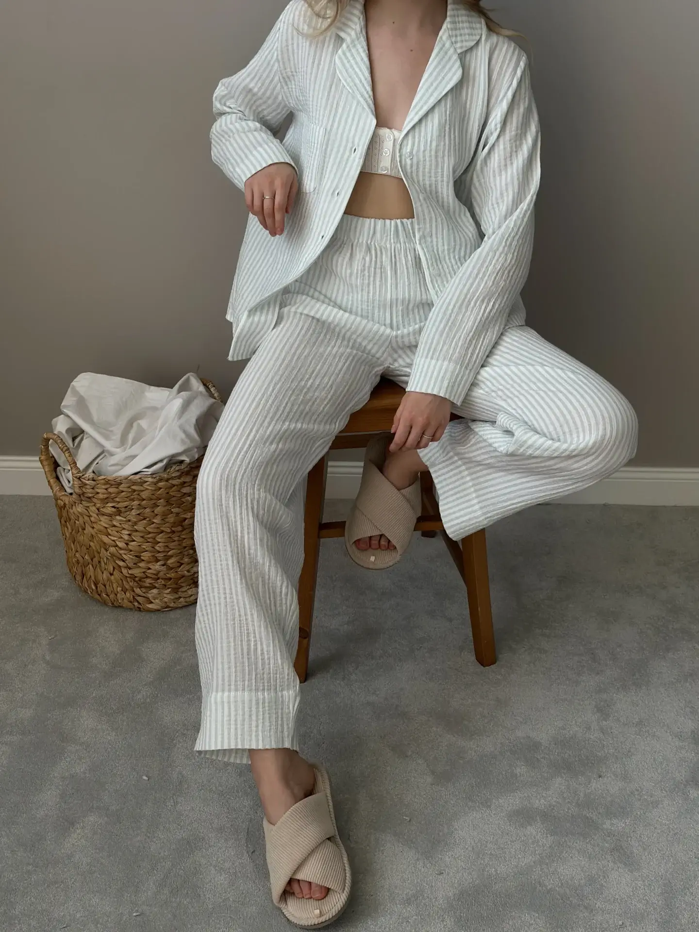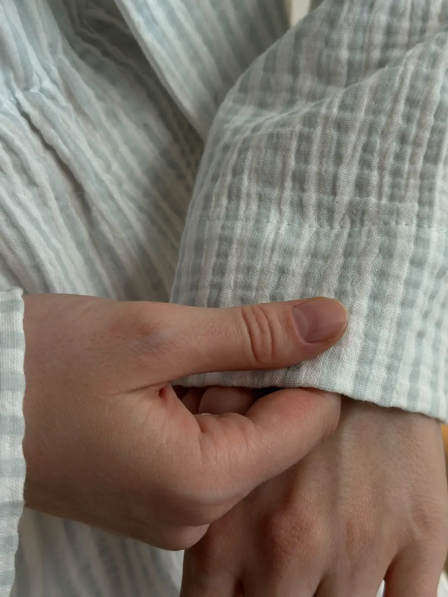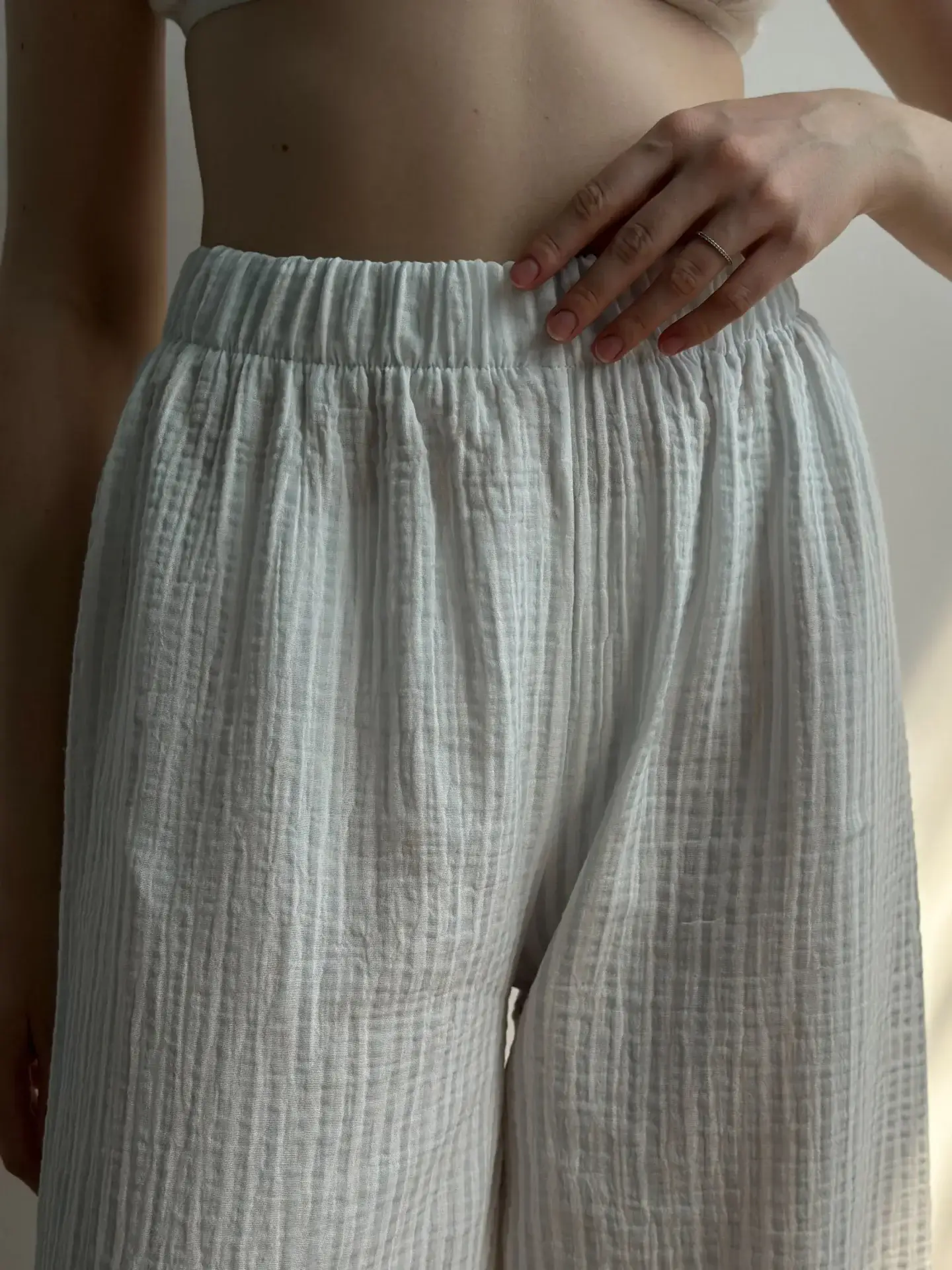Komplet koszula i spodnie z muślinu to lekka wersja domowa, zapewniająca komfort noszenia na co dzień. Naturalny, miękki materiał jest przyjemny w dotyku i dobrze przepuszcza powietrze.