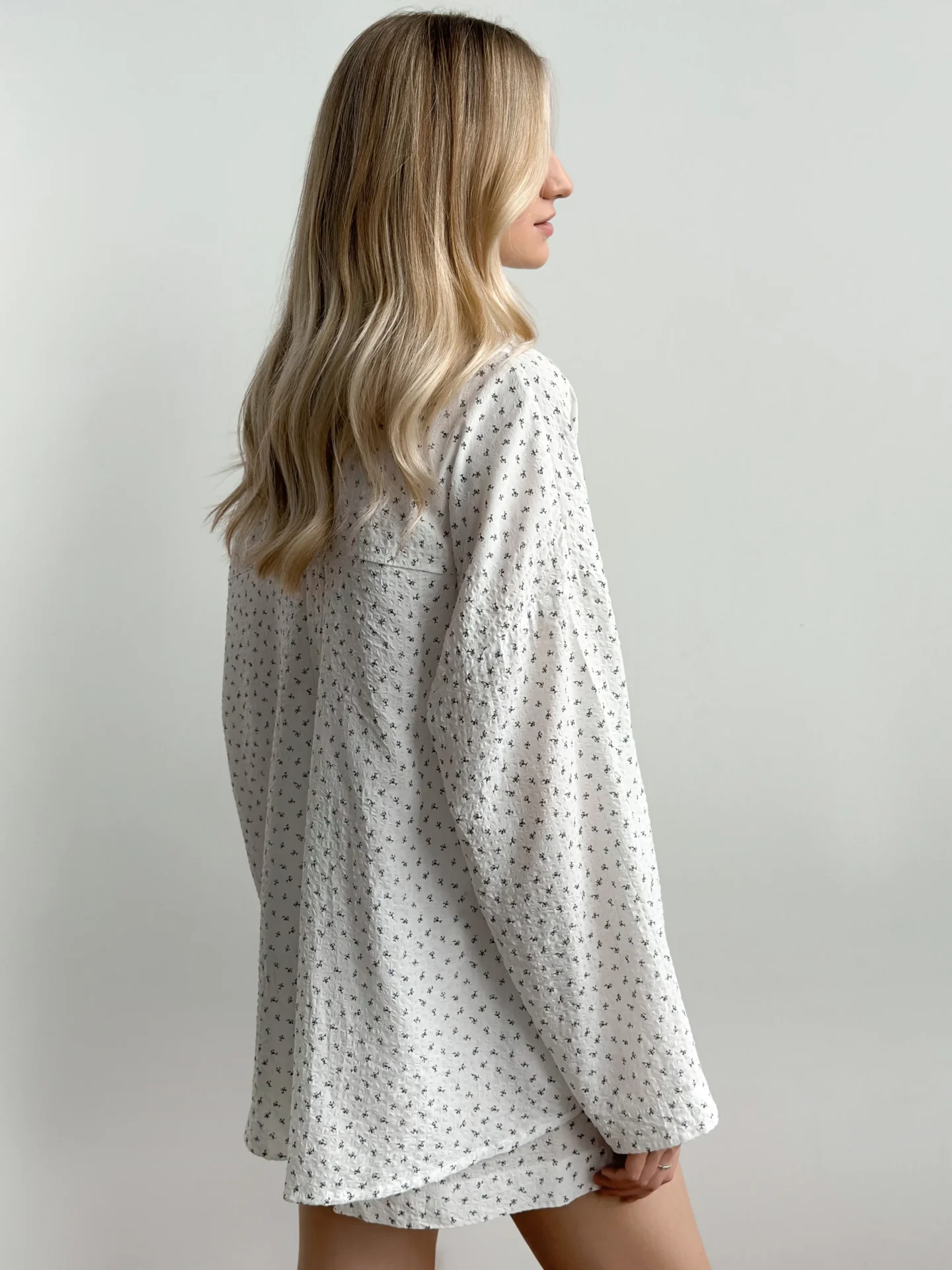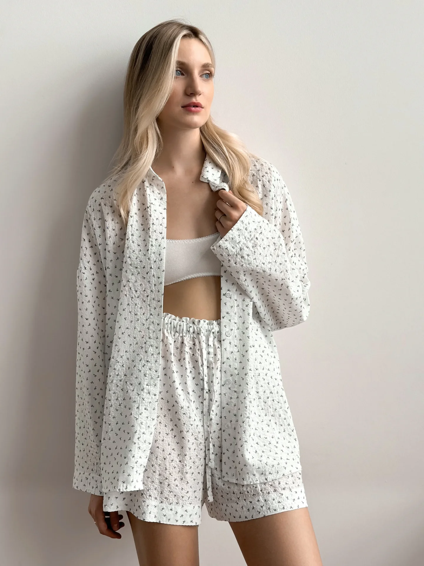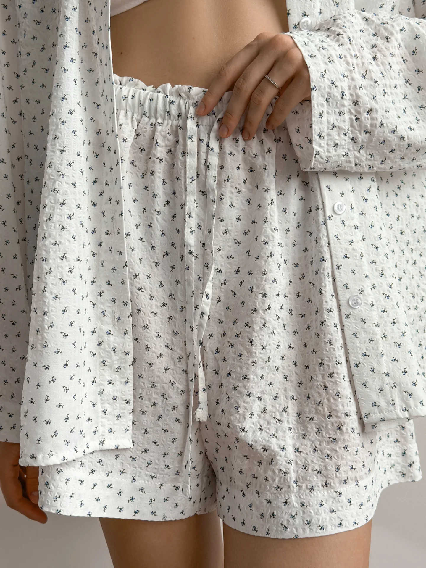 Komplet z batystu żakardowego, składający się z koszuli i szortów. Lekki i przewiewny materiał zapewnia komfort przez cały dzień. Prosty design podkreśla naturalną lekkość i styl.