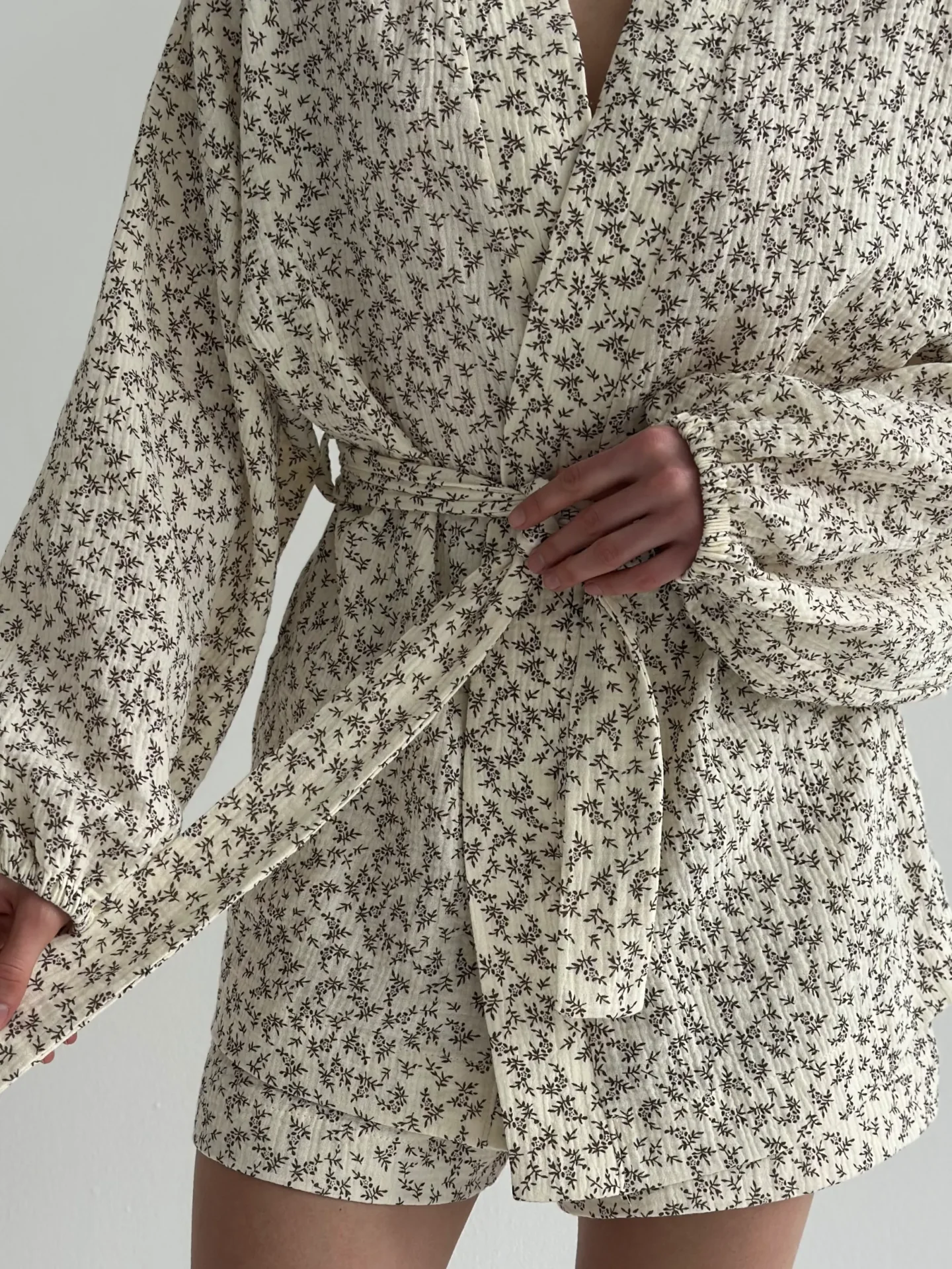 Komplet z muślinu składający się z koszuli i szortów. Lekki, przewiewny i przyjemny w dotyku, zapewnia komfort w codziennym noszeniu. Minimalistyczny krój nadaje stylizacji delikatności i elegancji.