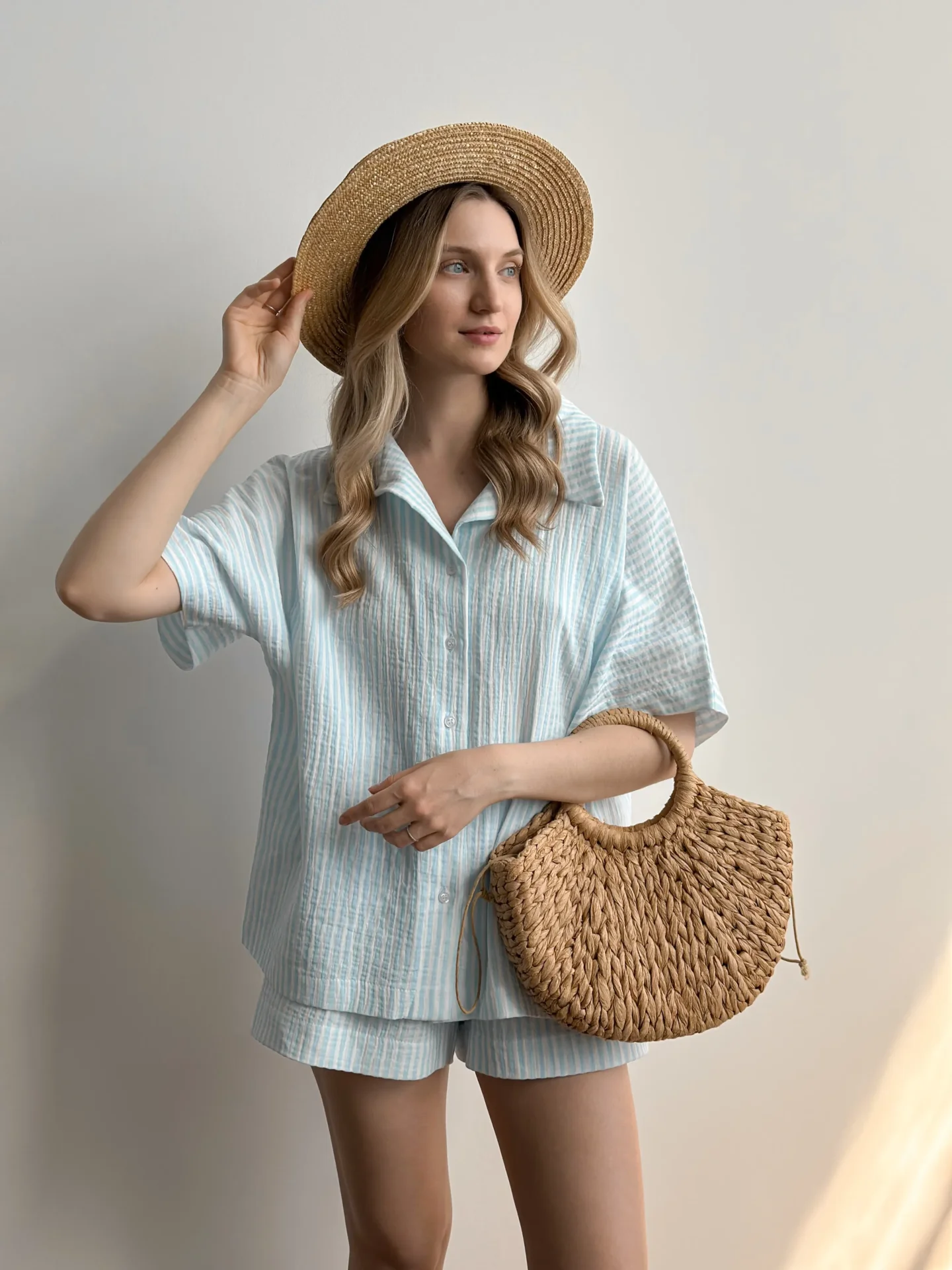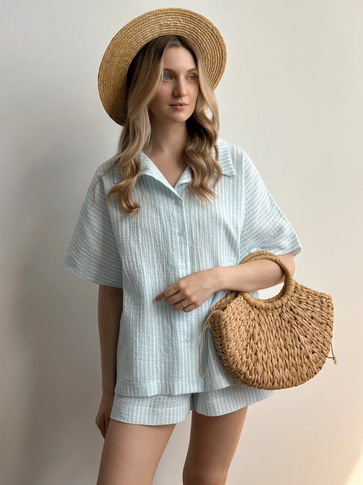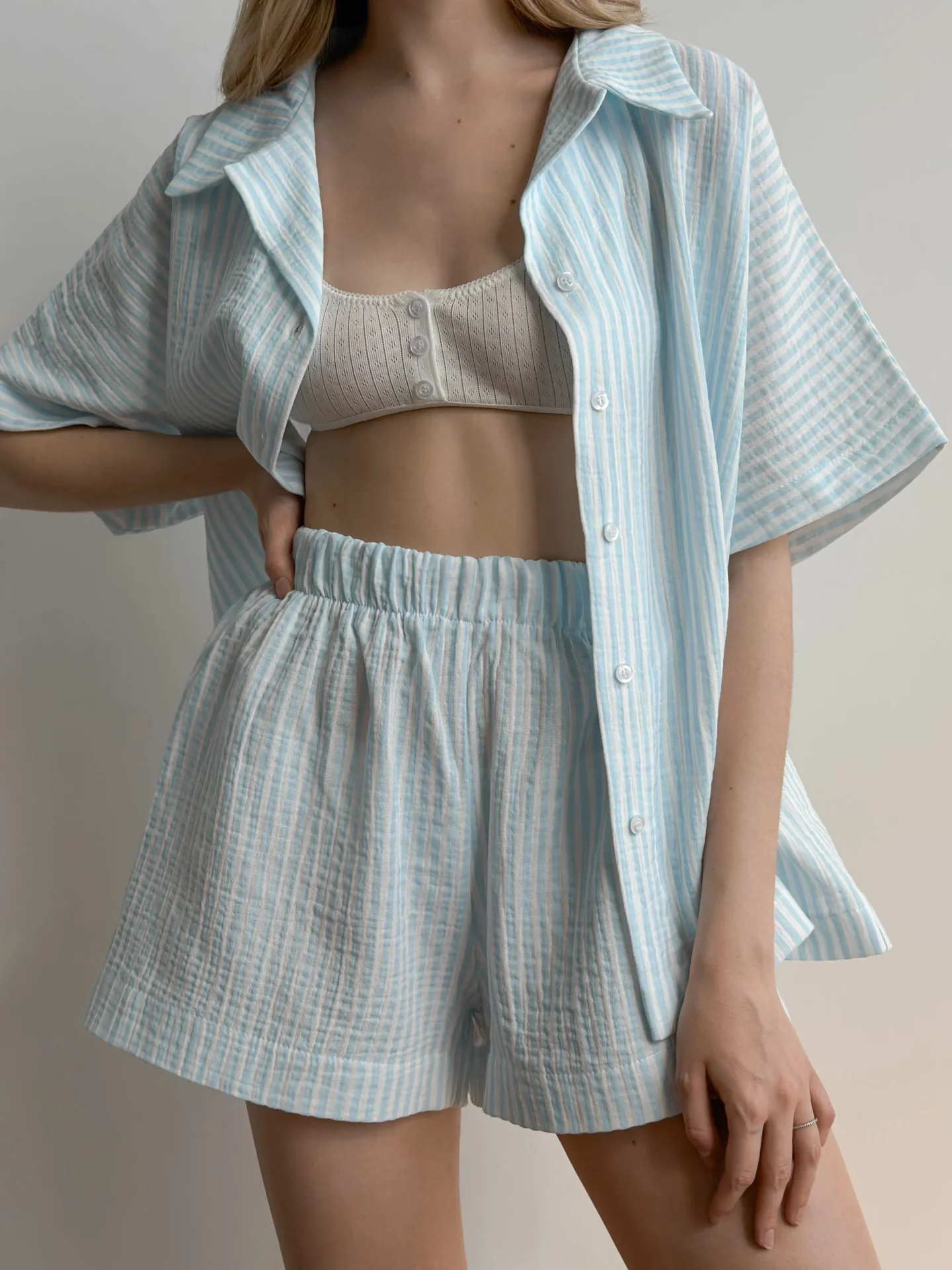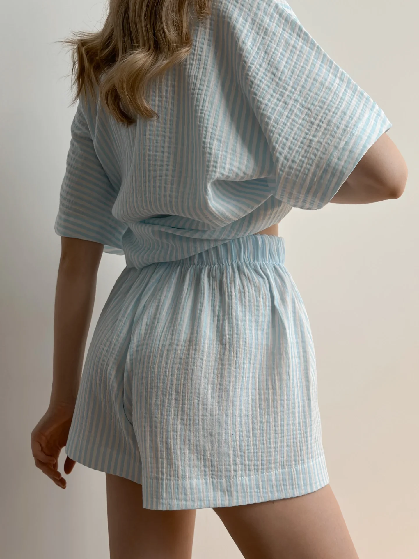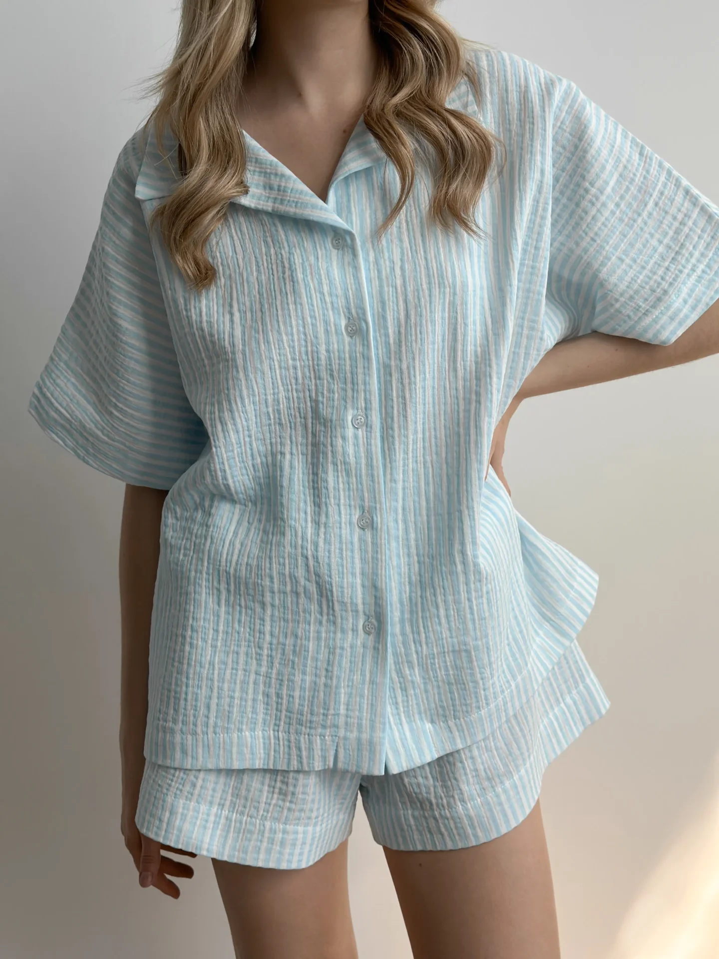 Zestaw muślinowy składający się z koszuli i szortów – idealny wybór dla wygodnego i stylowego wyglądu! Dzięki naturalnej teksturze muślinu doskonale przepuszcza powietrze, co sprawia, że jest wygodny w ciepłe dni.