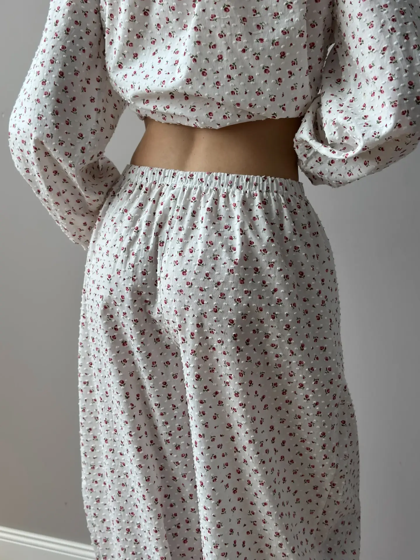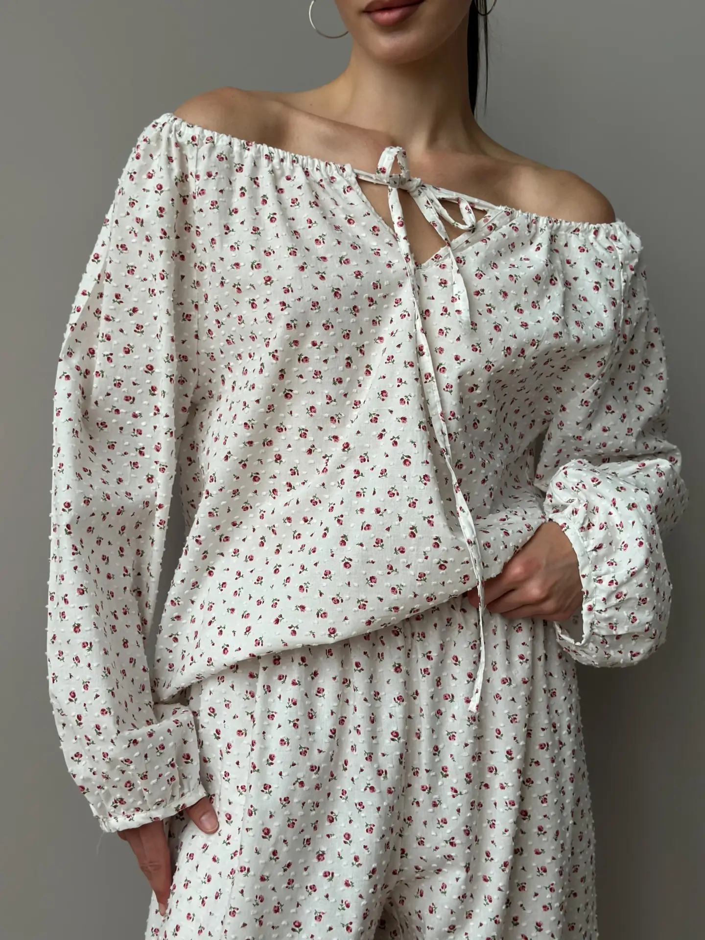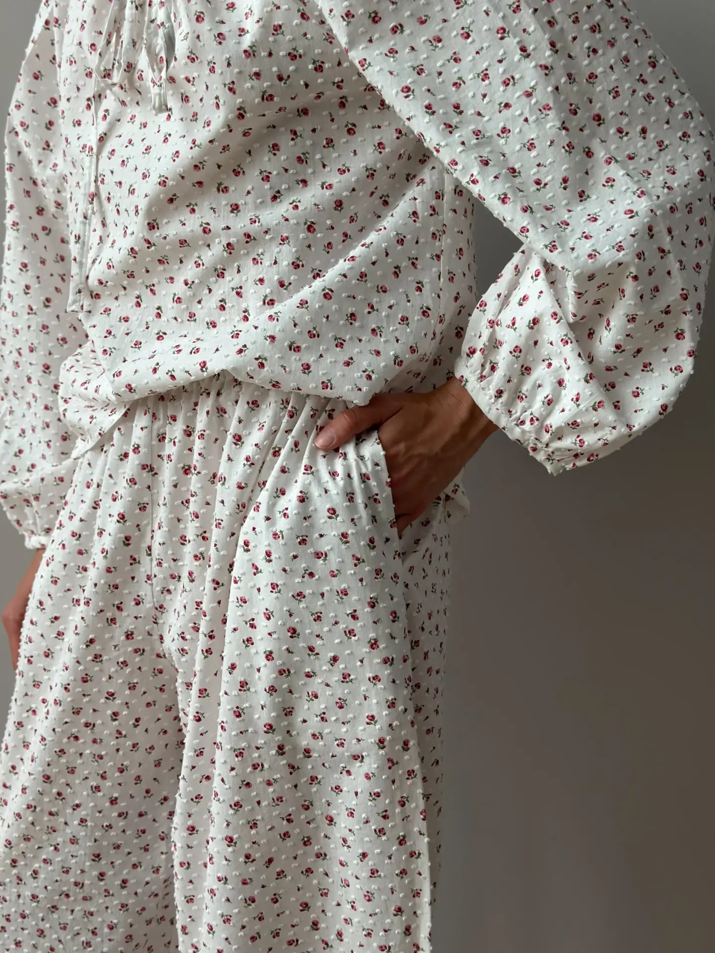 Komplet koszula na troczek i spodnie szarawary, z batystu, biały w kropki i czerwone róże - Miso