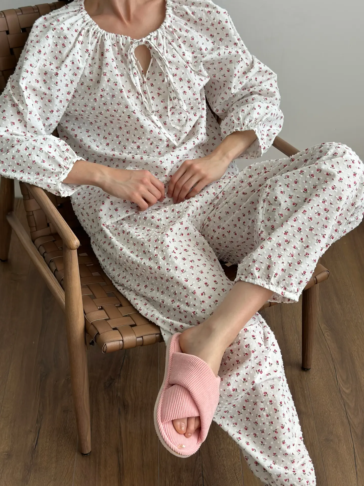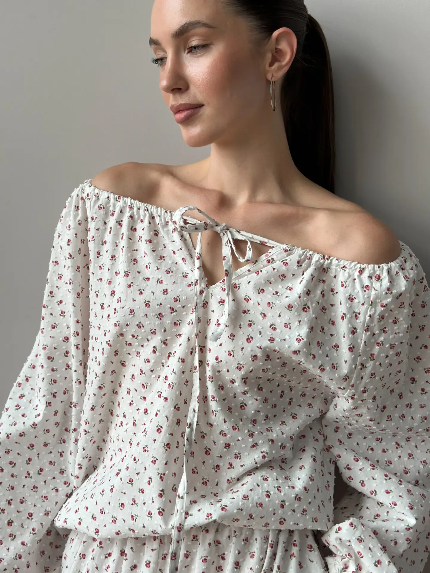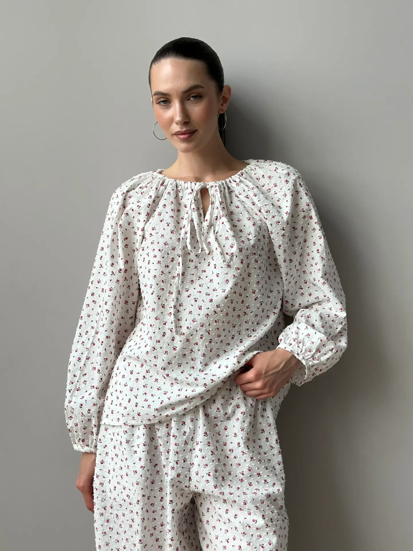 Komplet koszula na troczek i spodnie szarawary, z batystu, biały w kropki i czerwone róże - Miso