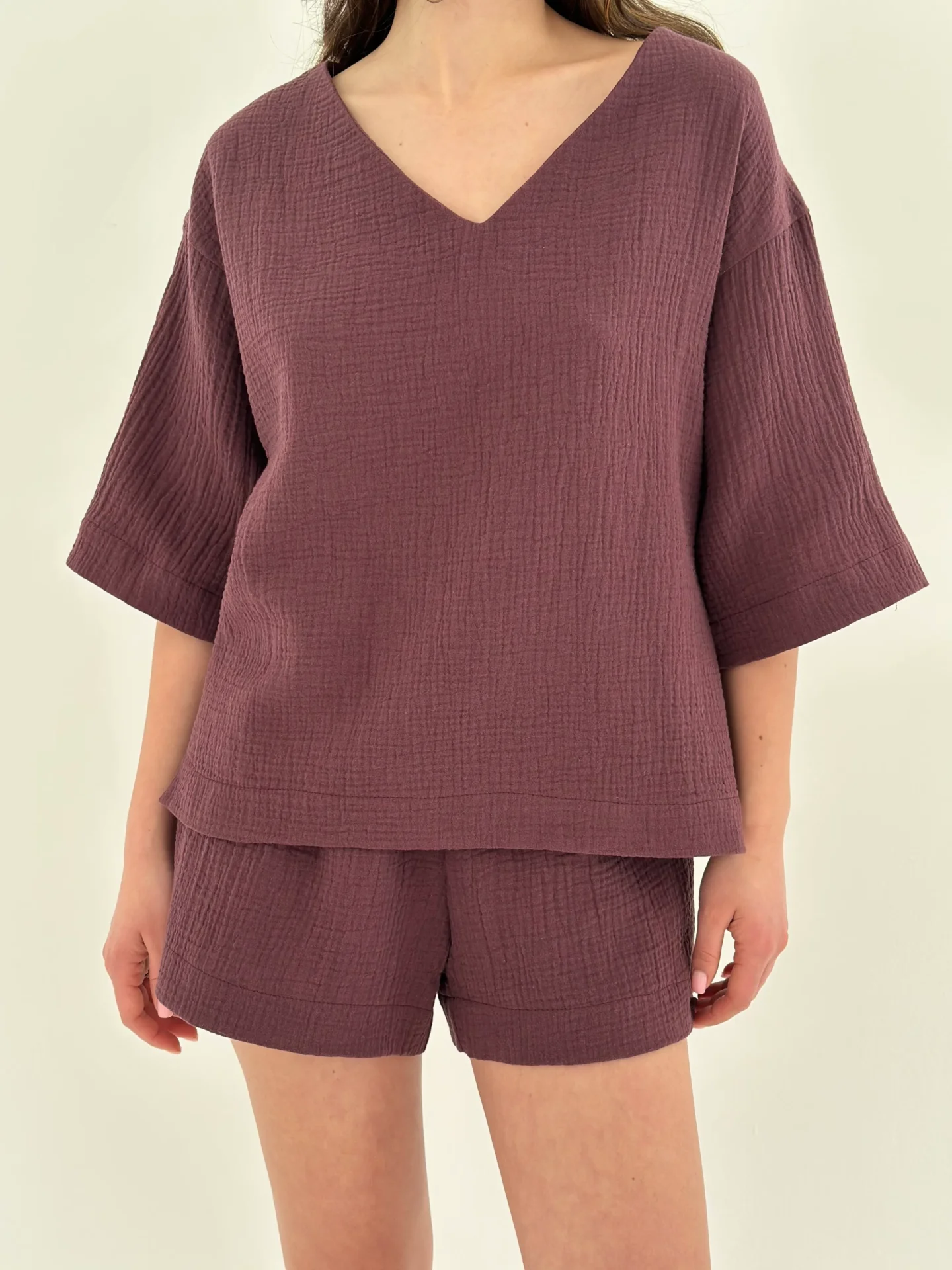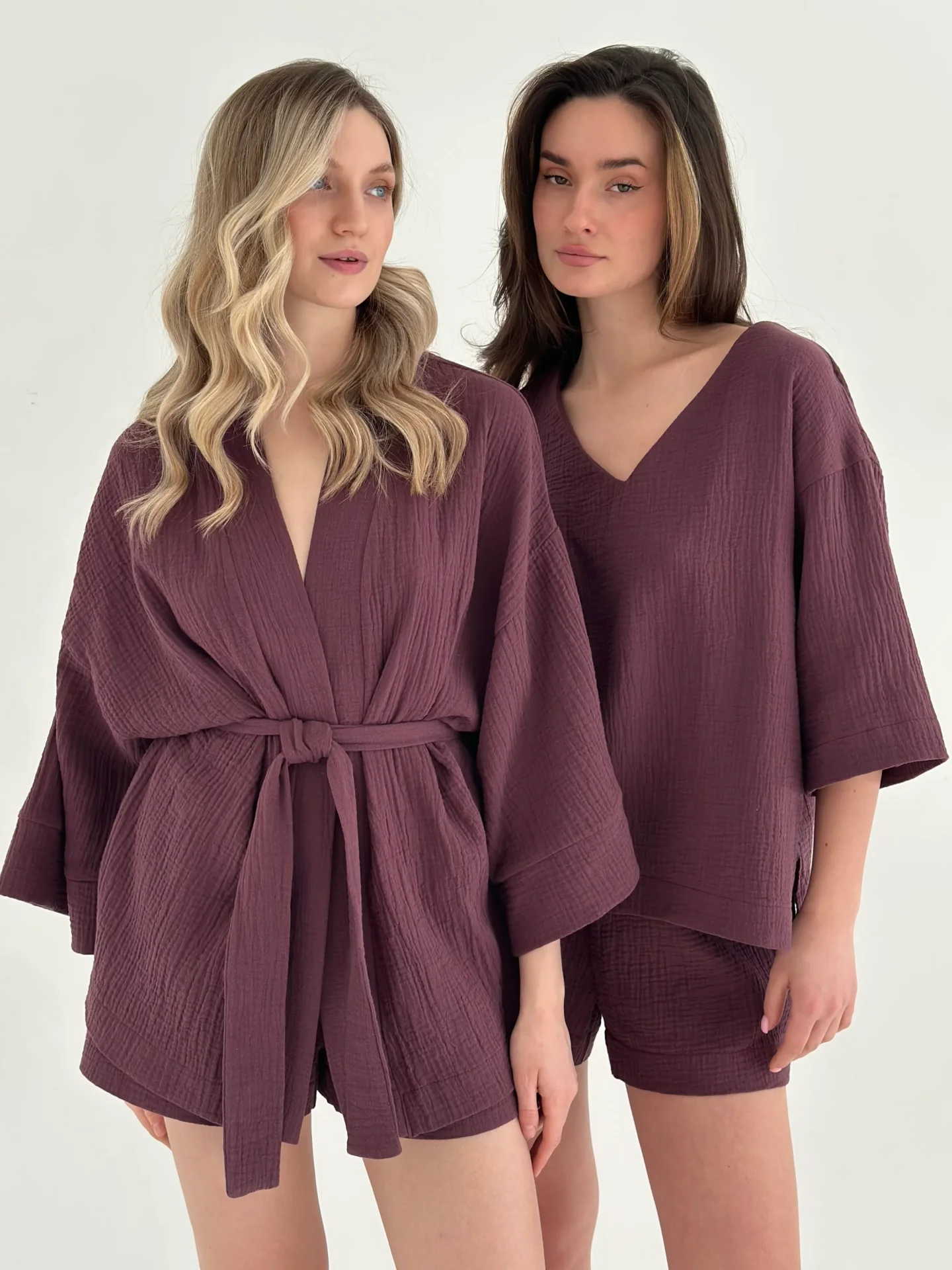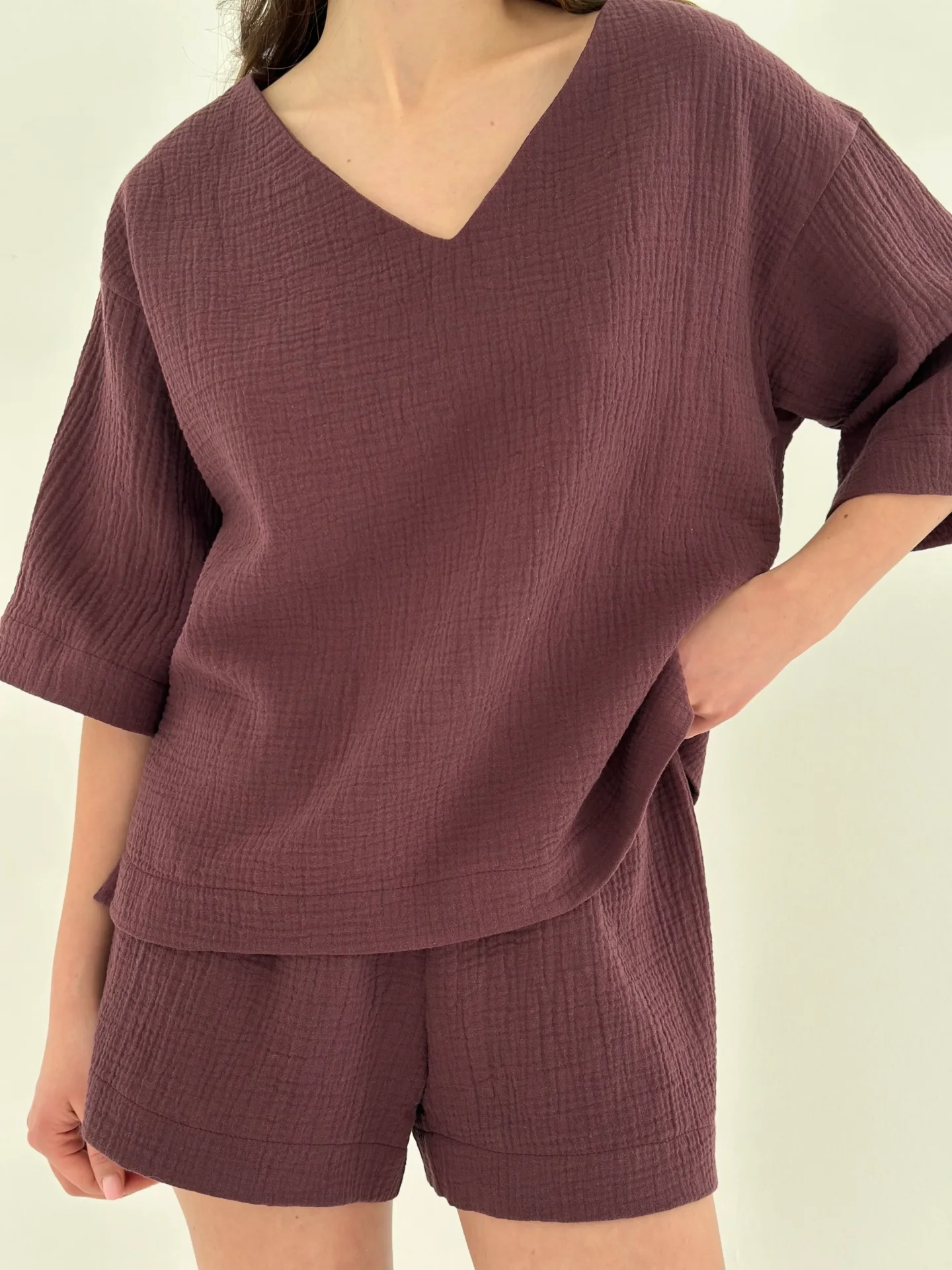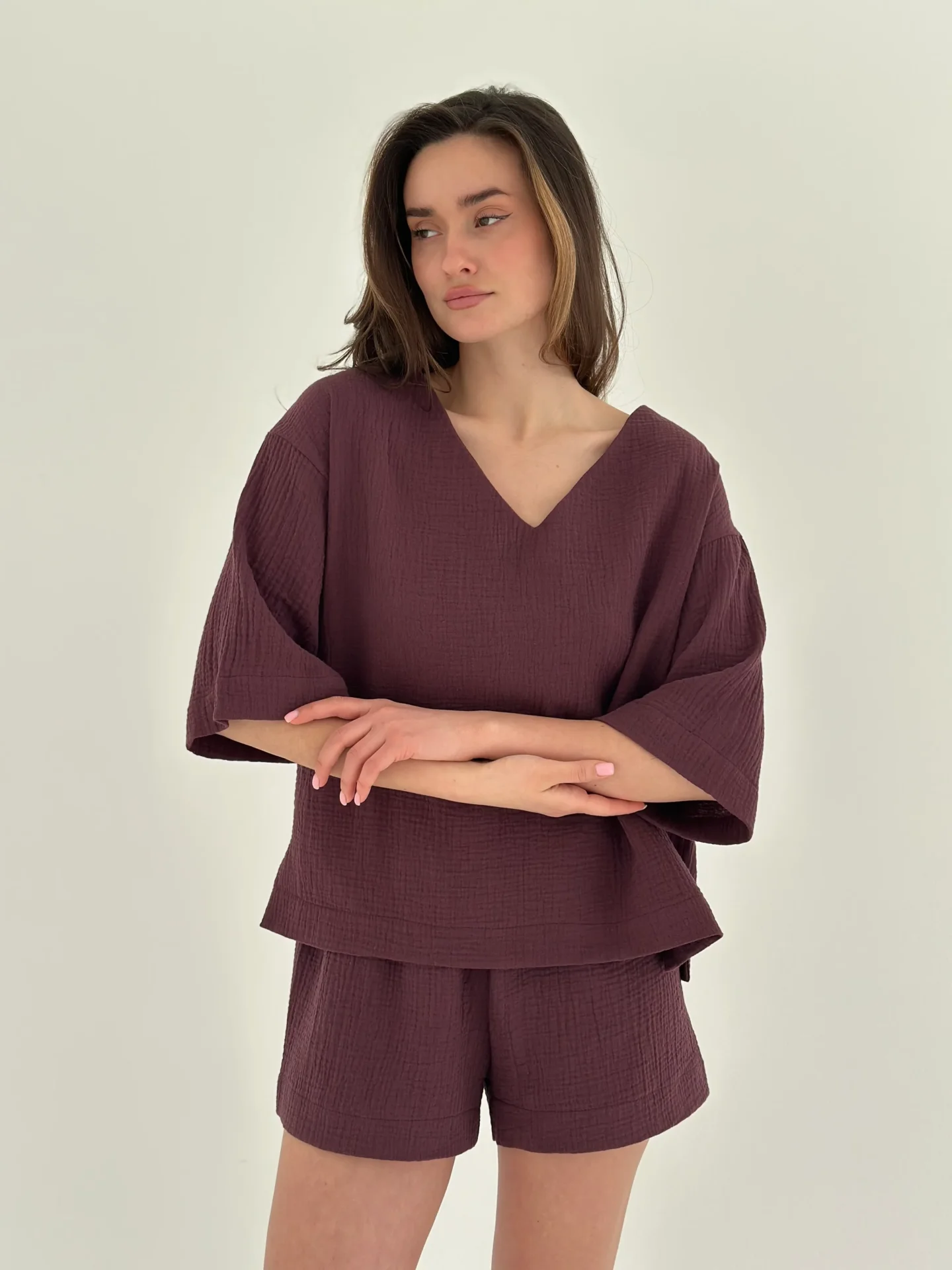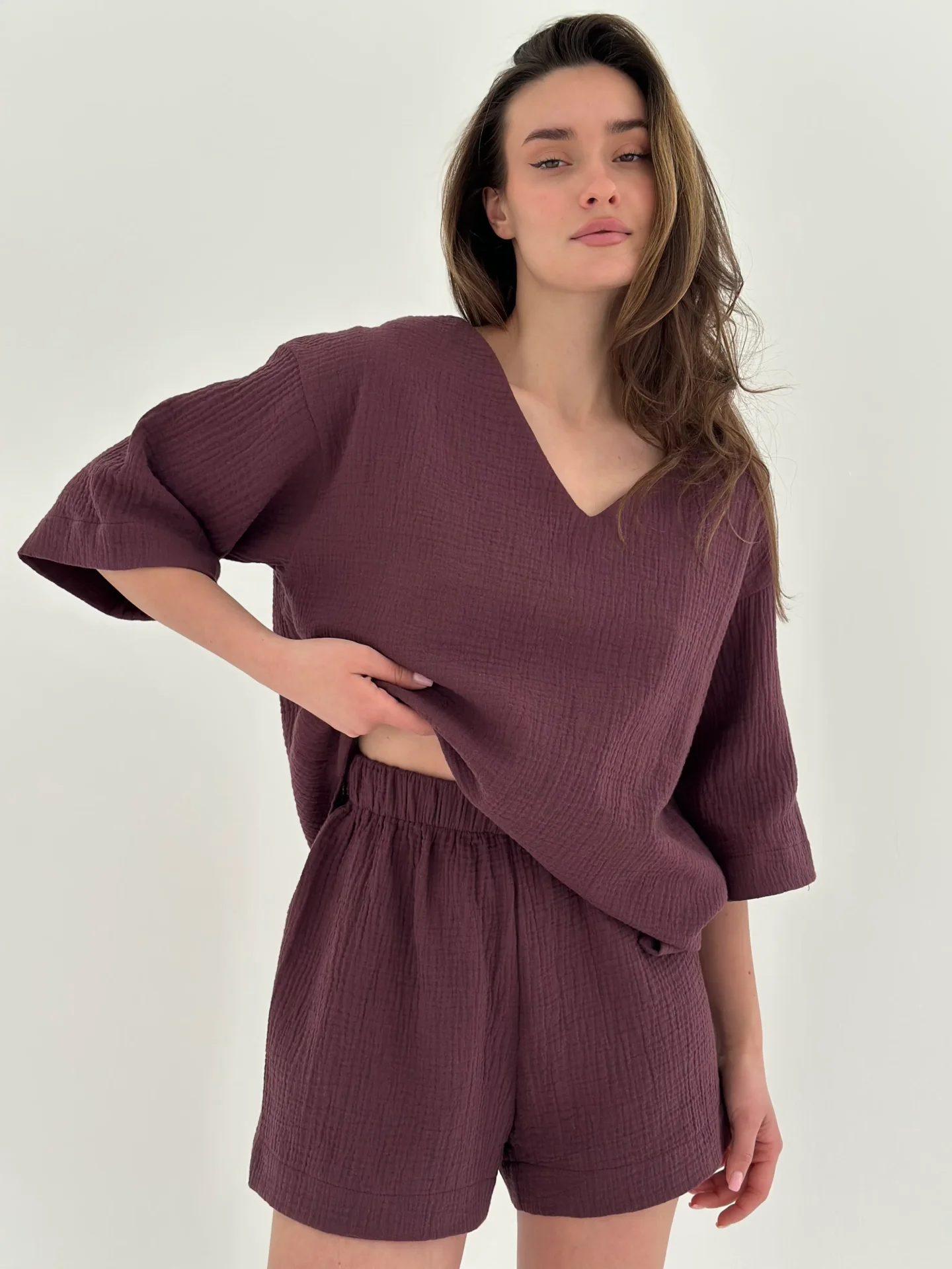 Muślinowy zestaw z dwuwarstwowej tkaniny — koszulka i szorty — jest lekki i przyjemny dla ciała. Miękka, naturalna faktura dobrze przepuszcza powietrze i zapewnia komfort przez cały dzień. Wygodna opcja do domu i spokojnego wypoczynku.