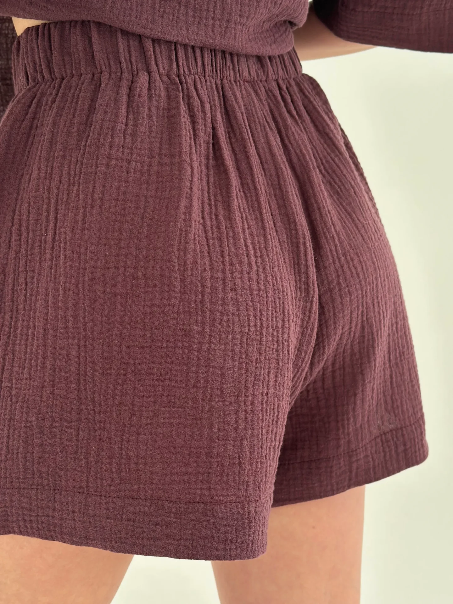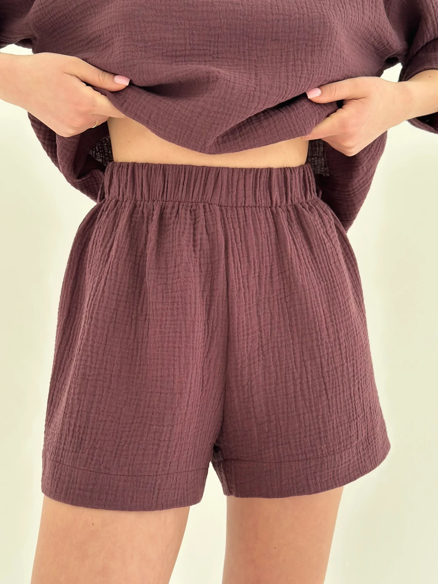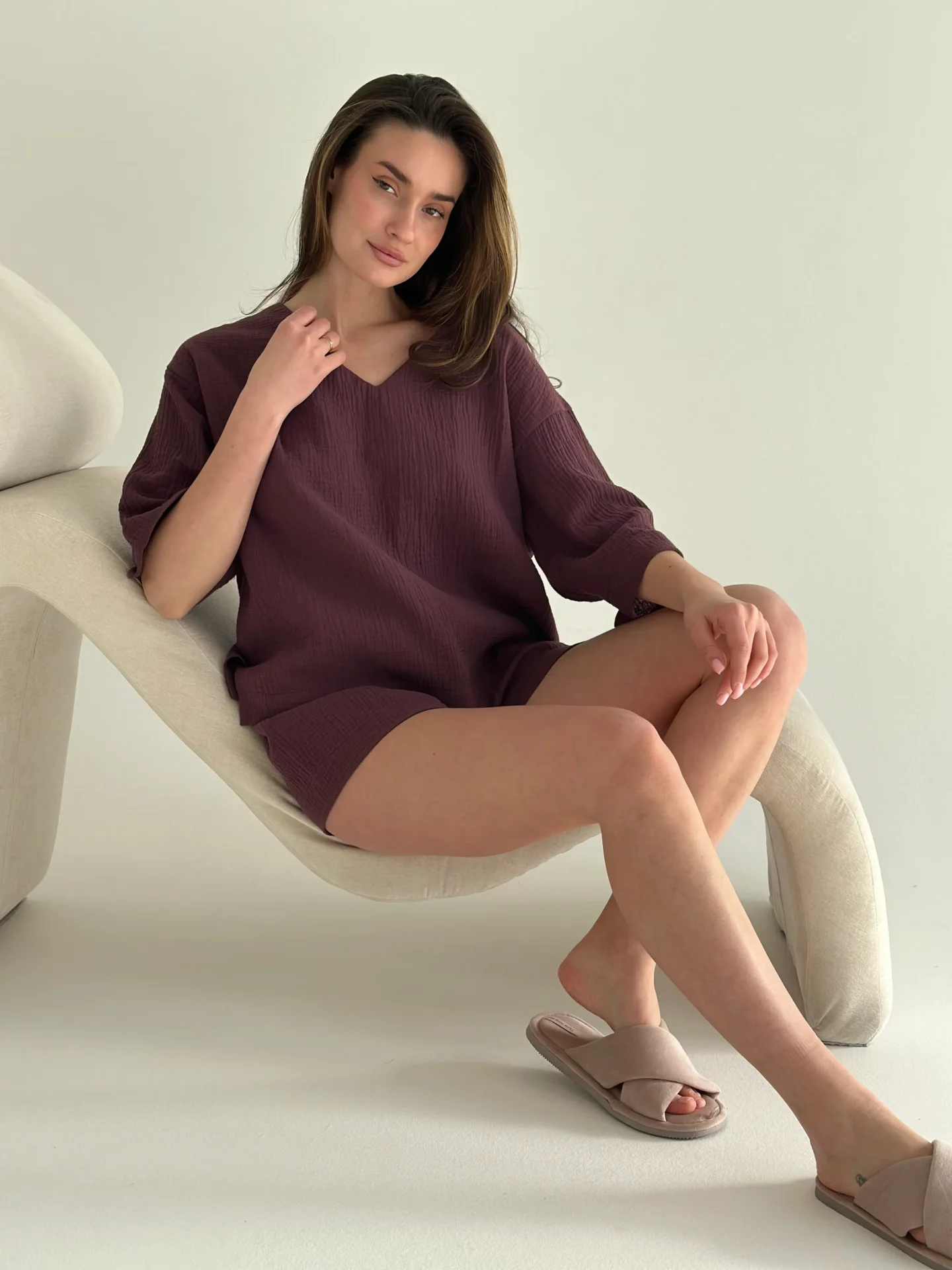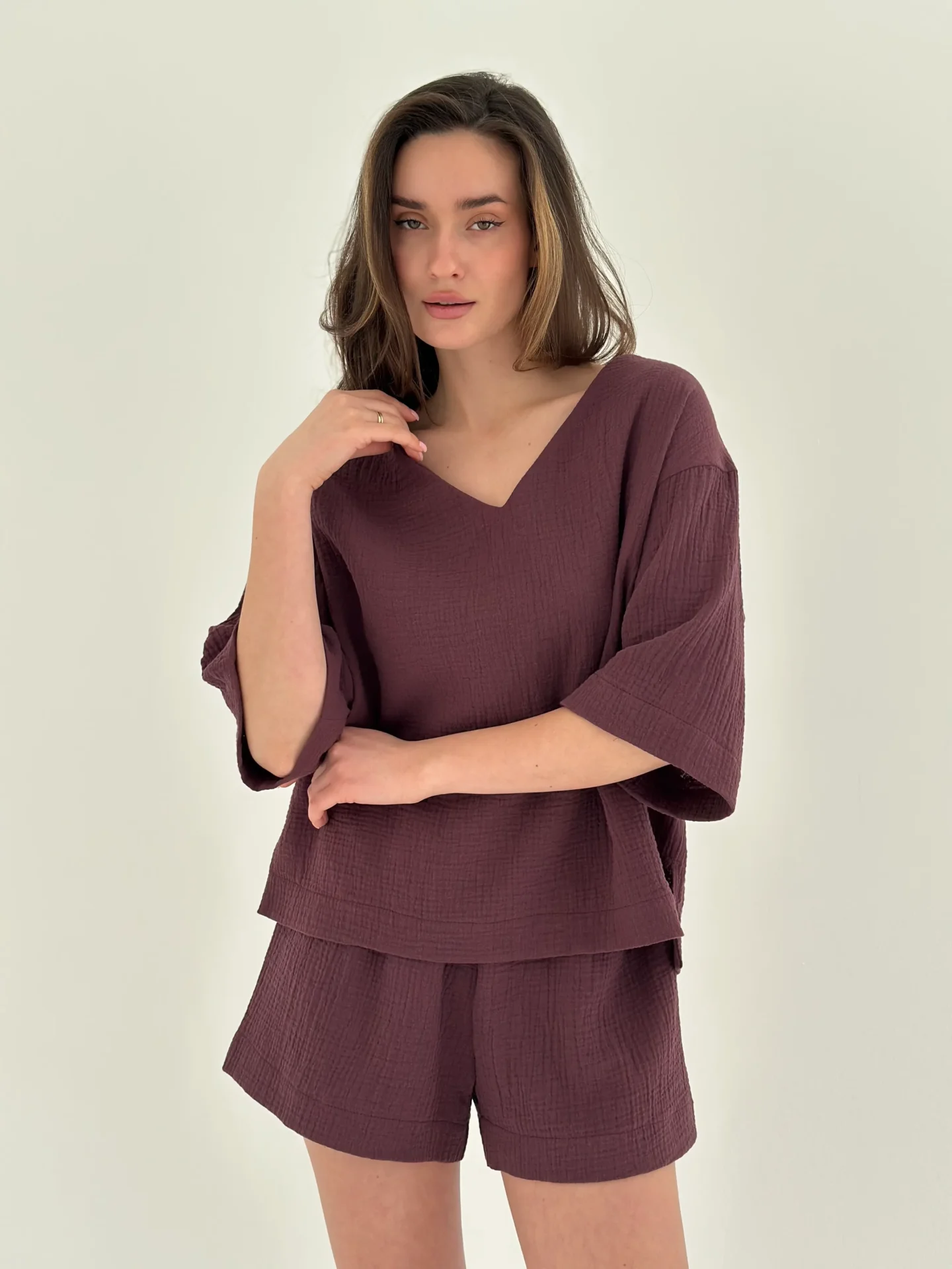 Komplet koszulka i szorty, z muślinu dwuwarstwowego, czekoladowy - Miso