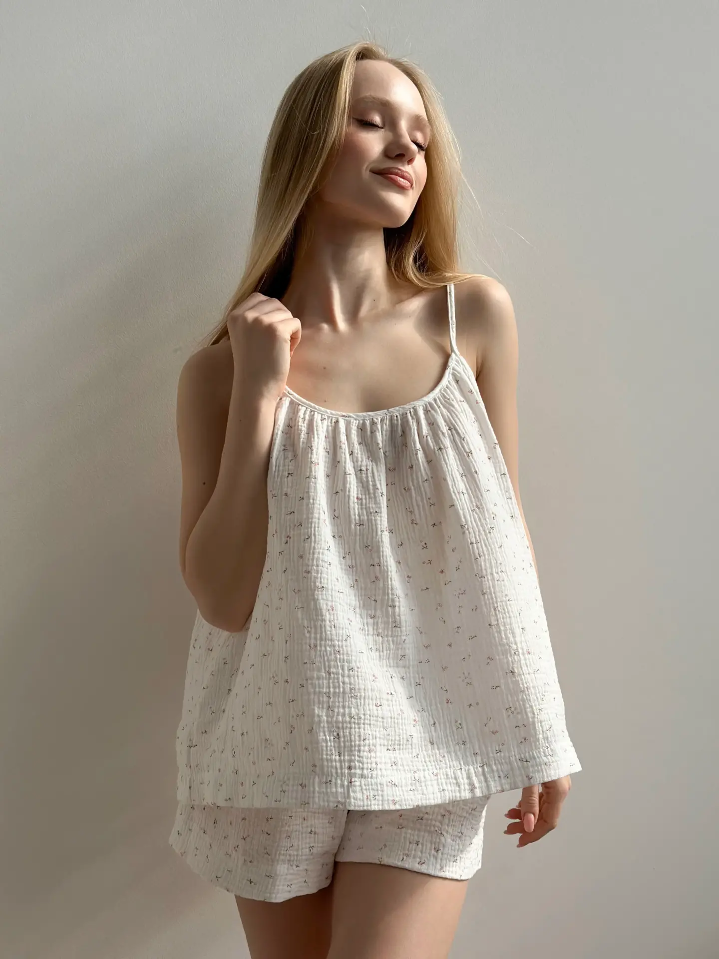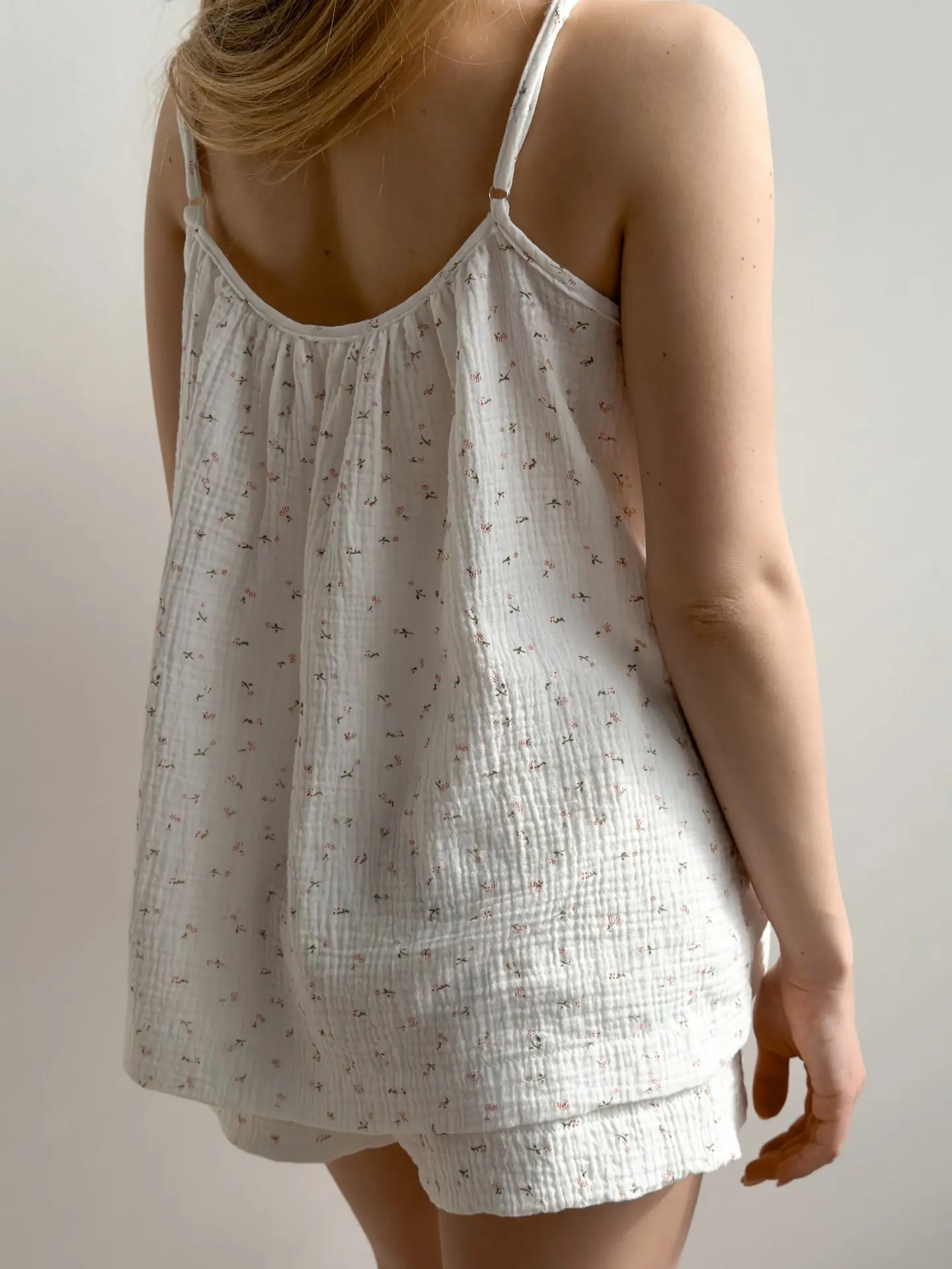 Komplet koszulka na ramiączkach i szorty, z muślinu, biały w stokrotki