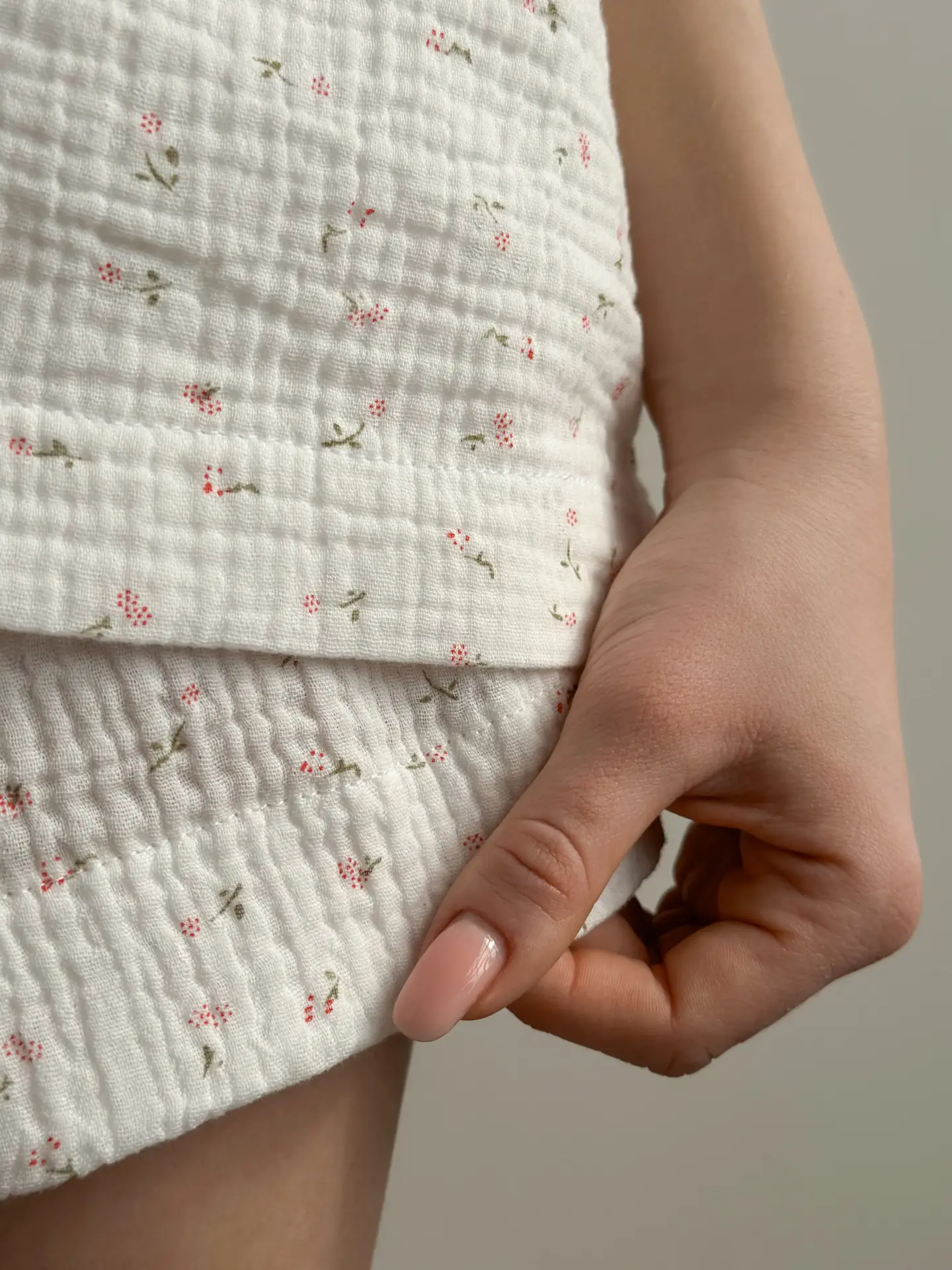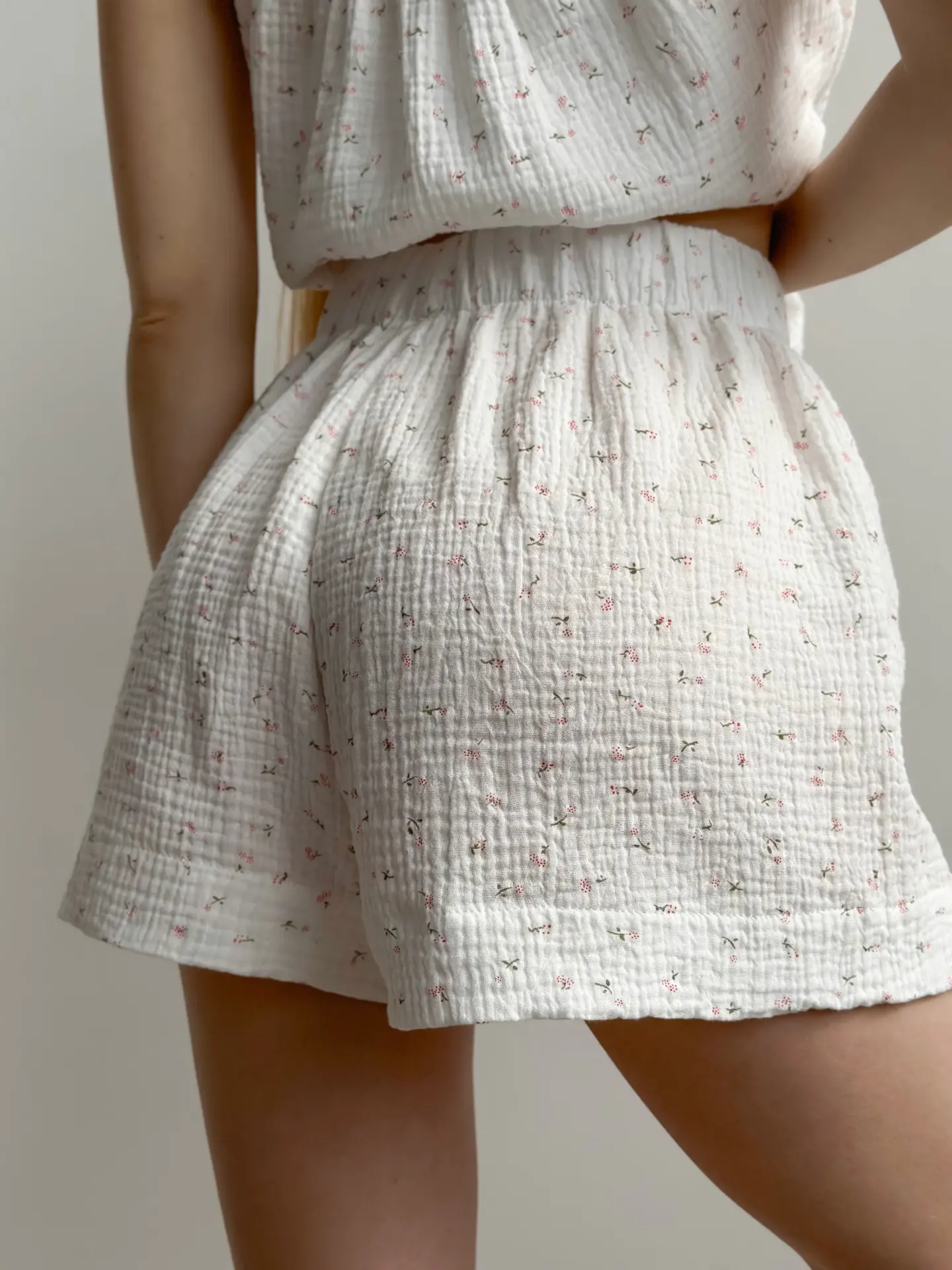 Muslinowy kostium z koszulką i szortami w kolorze białym z nadrukiem „stokrotka” łączy w sobie lekkość i delikatność. Naturalny materiał oddycha i zapewnia komfort w upalne dni.