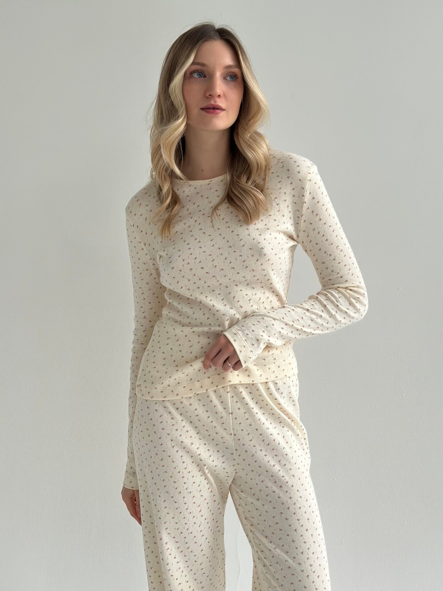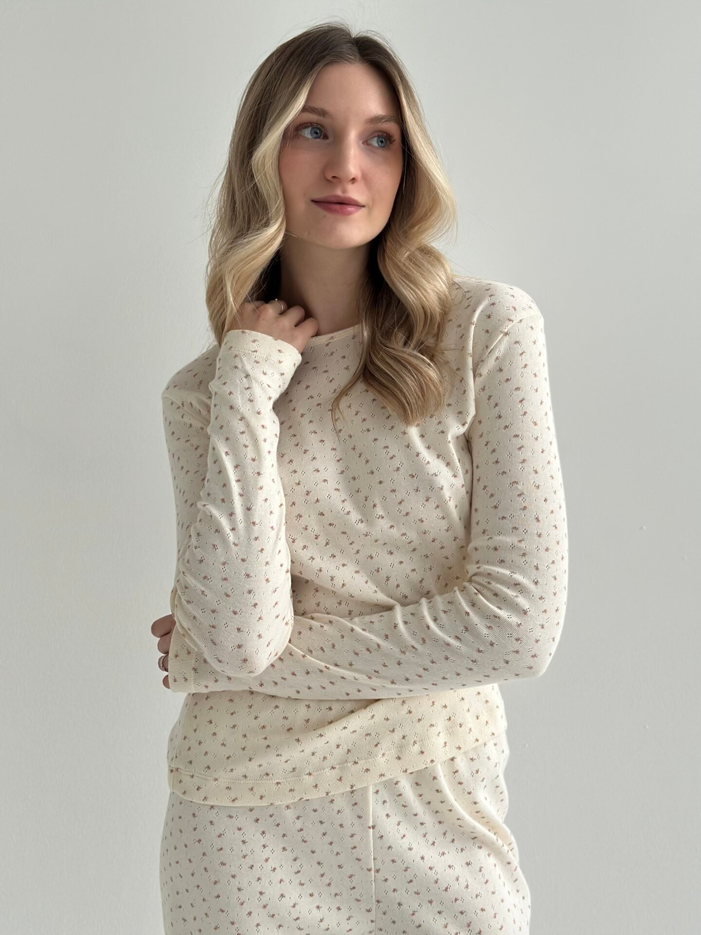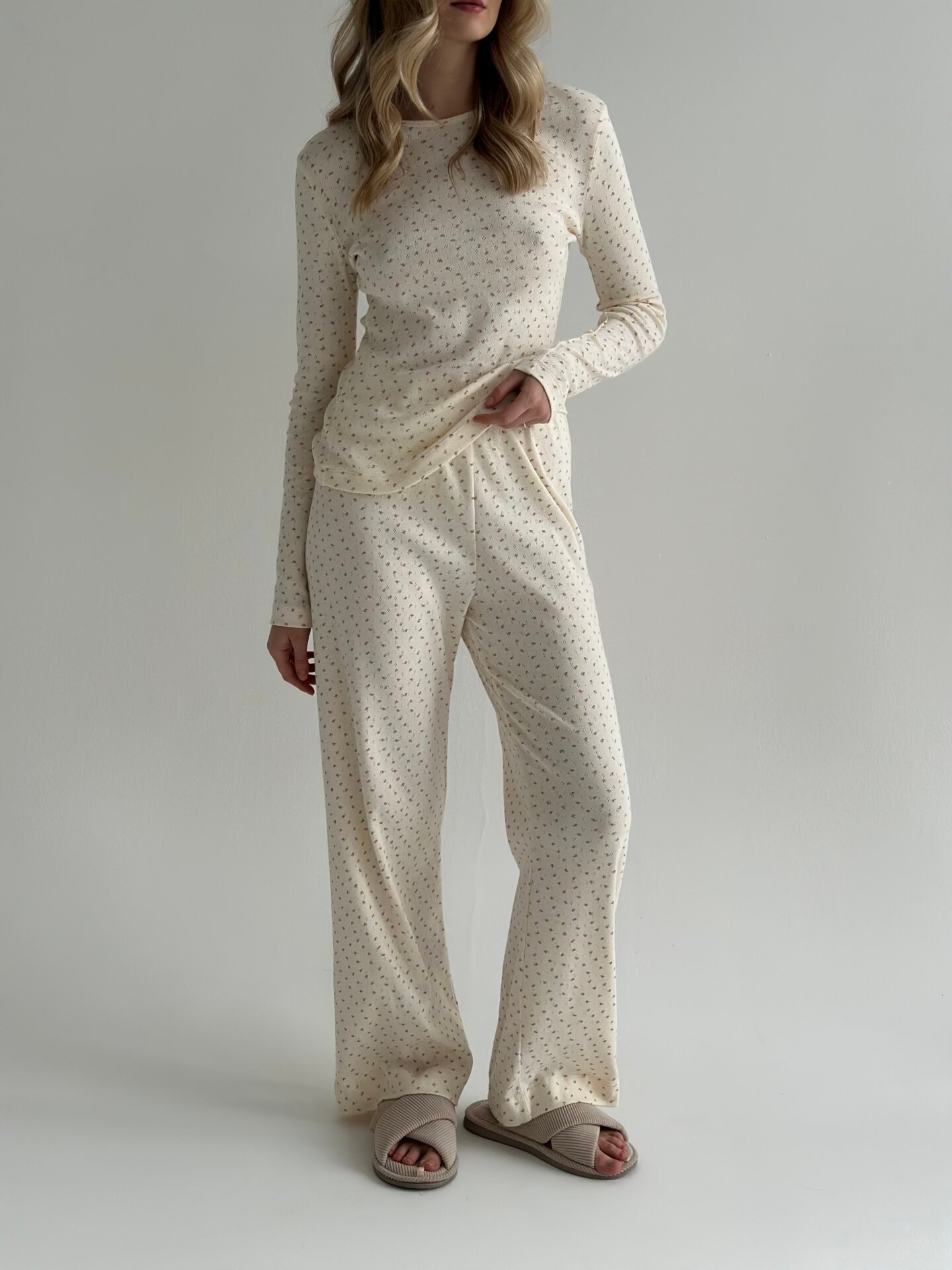 Komplet koszulka z długim rękawem i szerokie spodnie, z ribany, kremowa w róże
