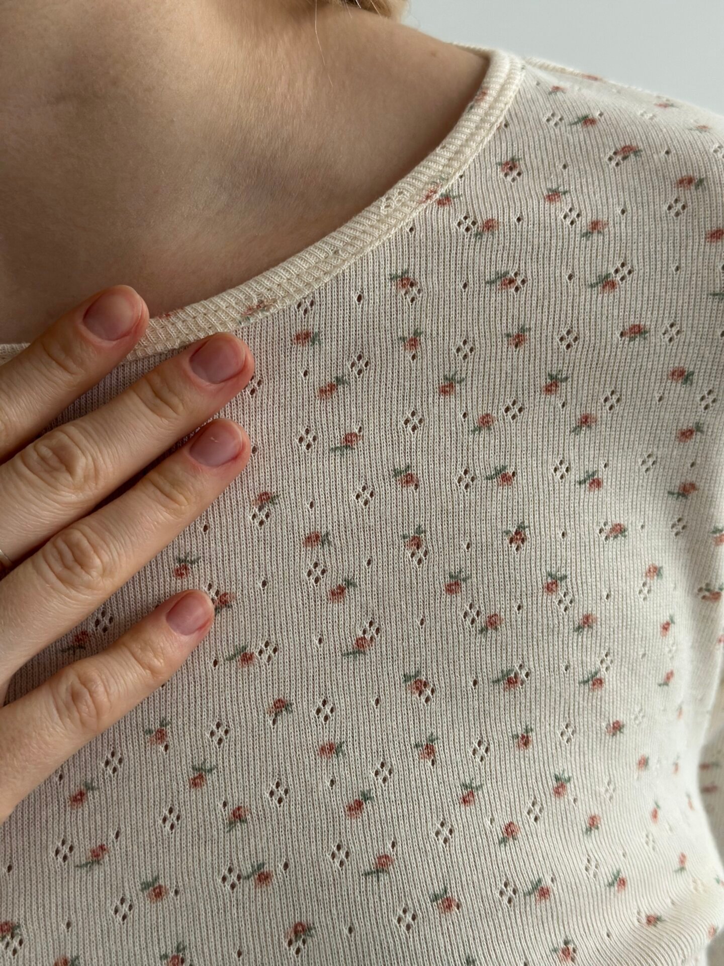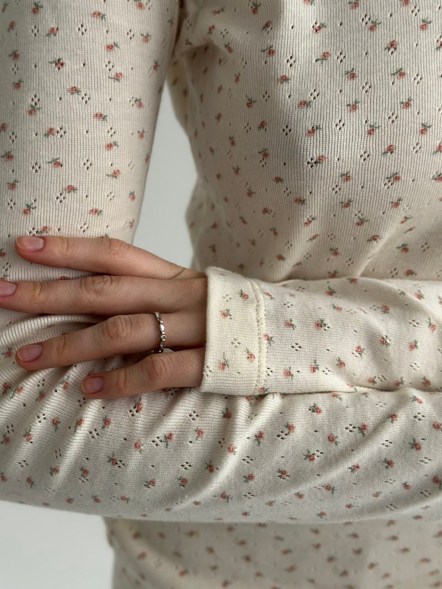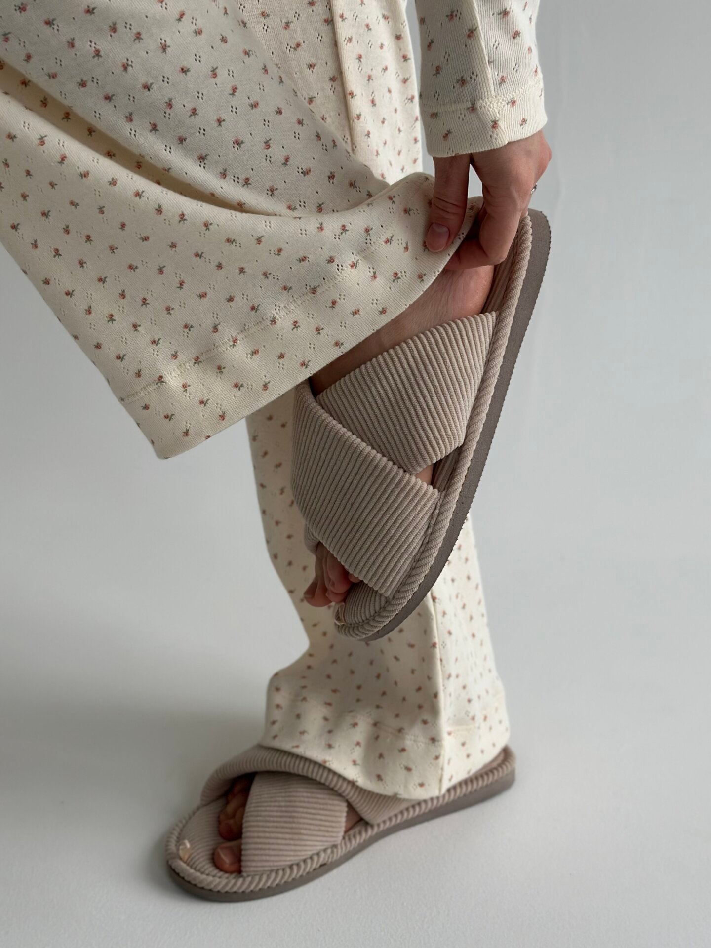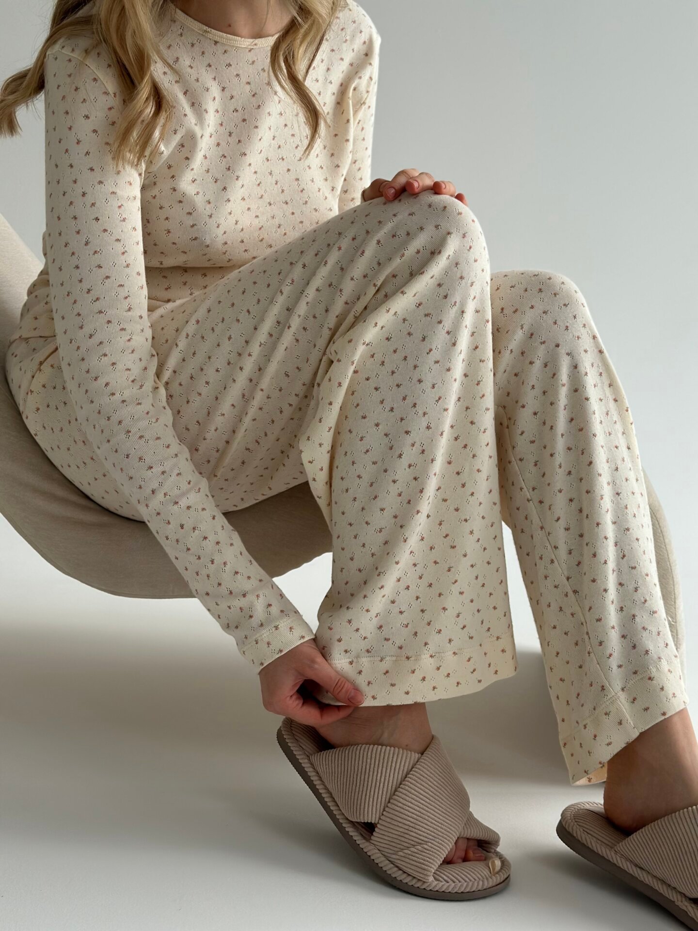 Komplet koszulka z długim rękawem i szerokie spodnie, z ribany, kremowa w róże