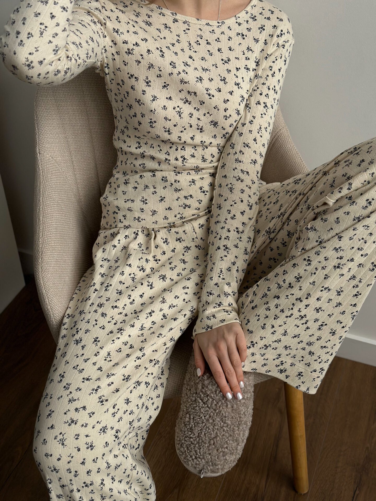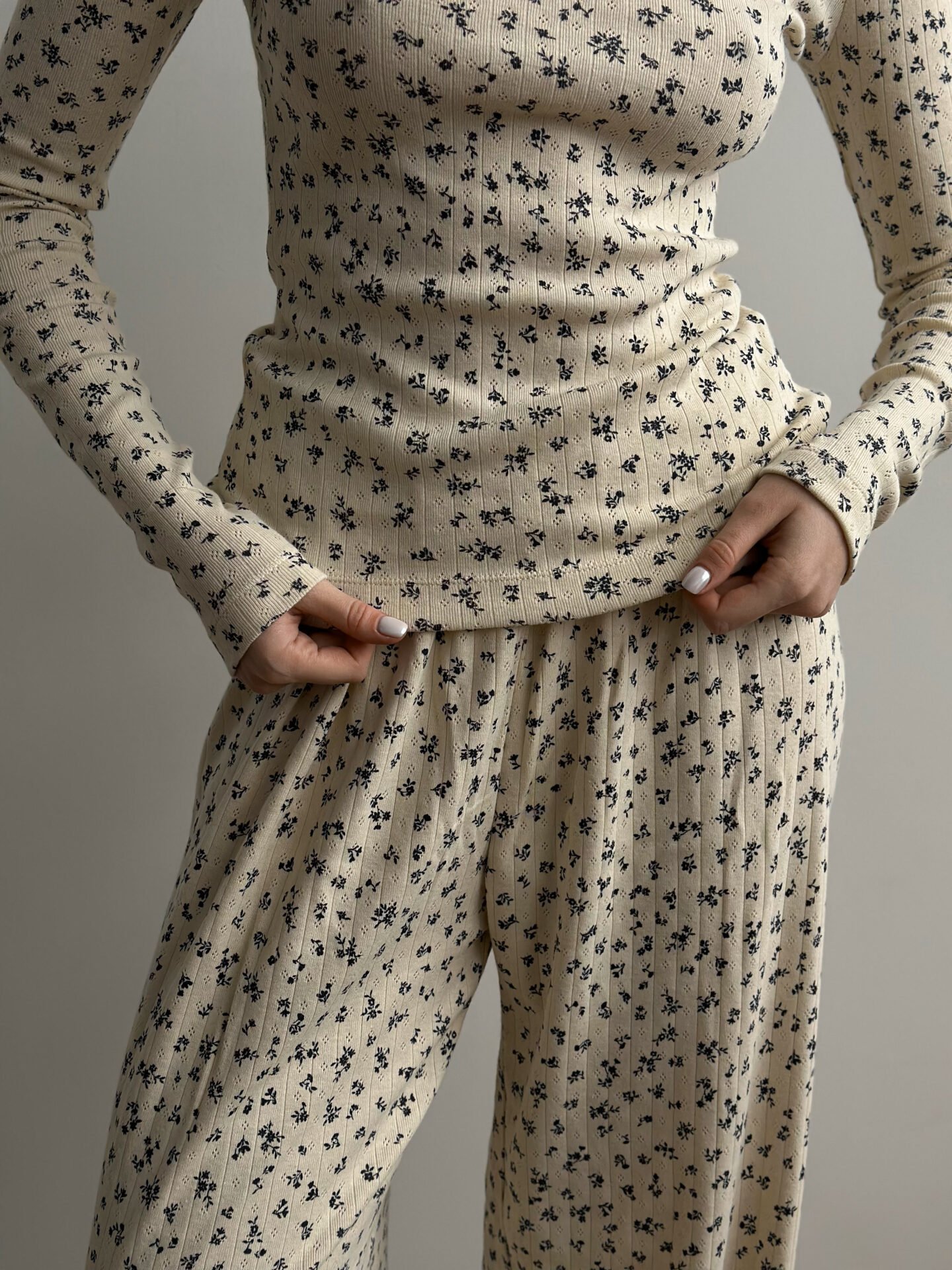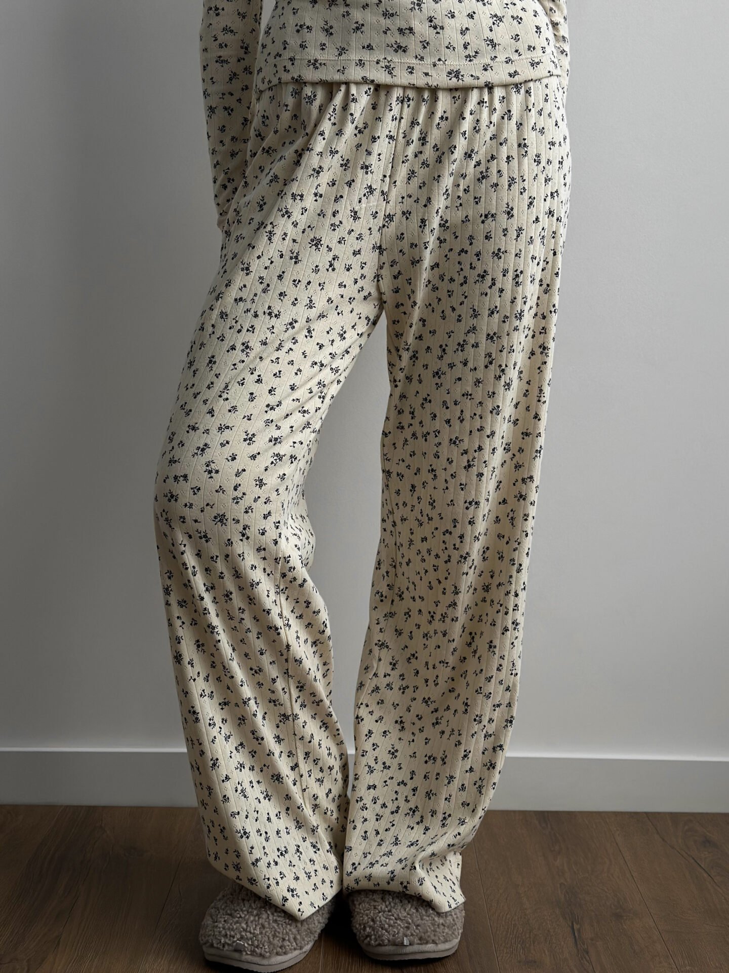 Komplet koszulka z długim rękawem i szerokie spodnie, z ribany prążkowanej, kremowy w granatowe kwiatki