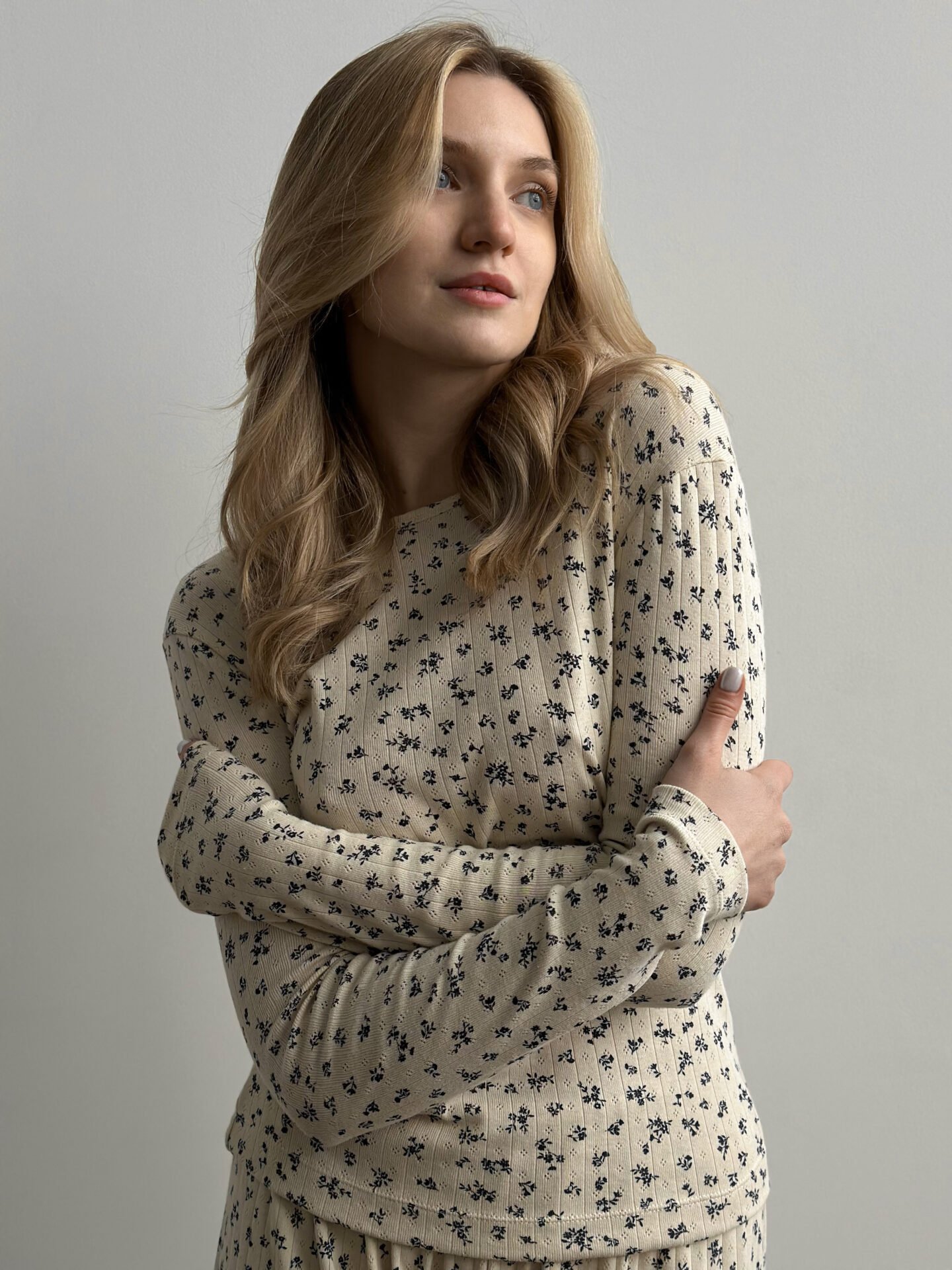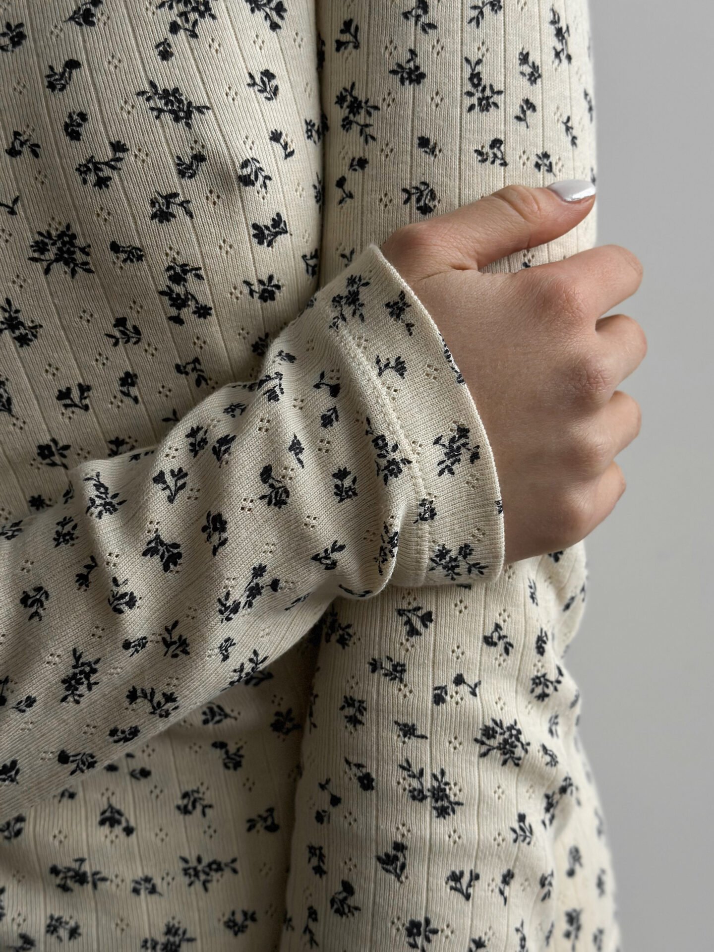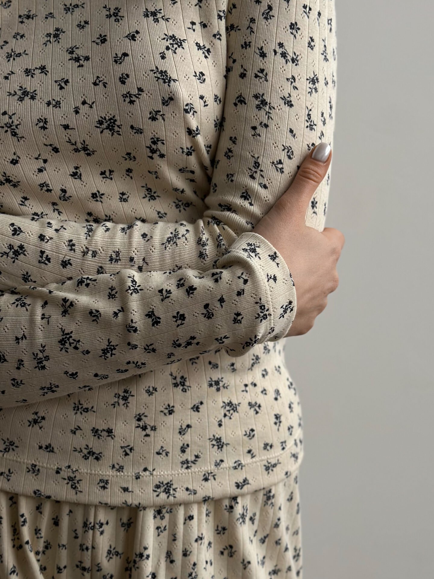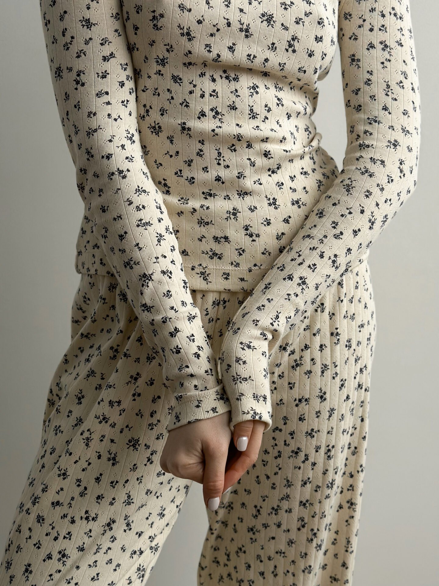 Komplet koszulka z długim rękawem i szerokie spodnie, z ribany prążkowanej, kremowy w granatowe kwiatki
