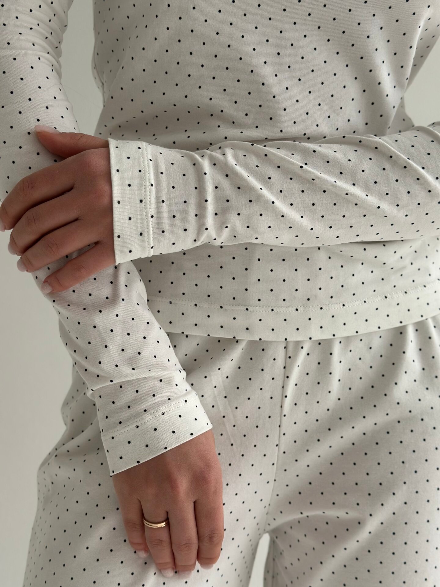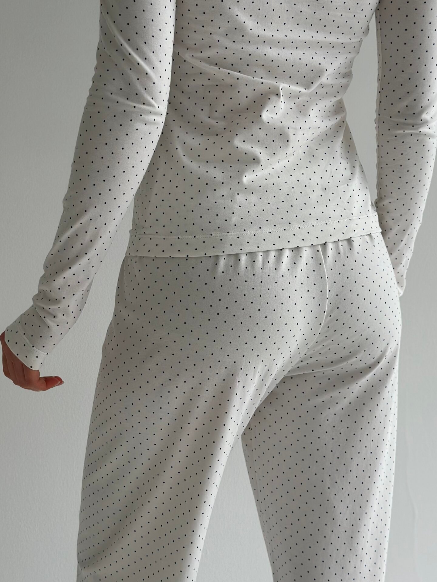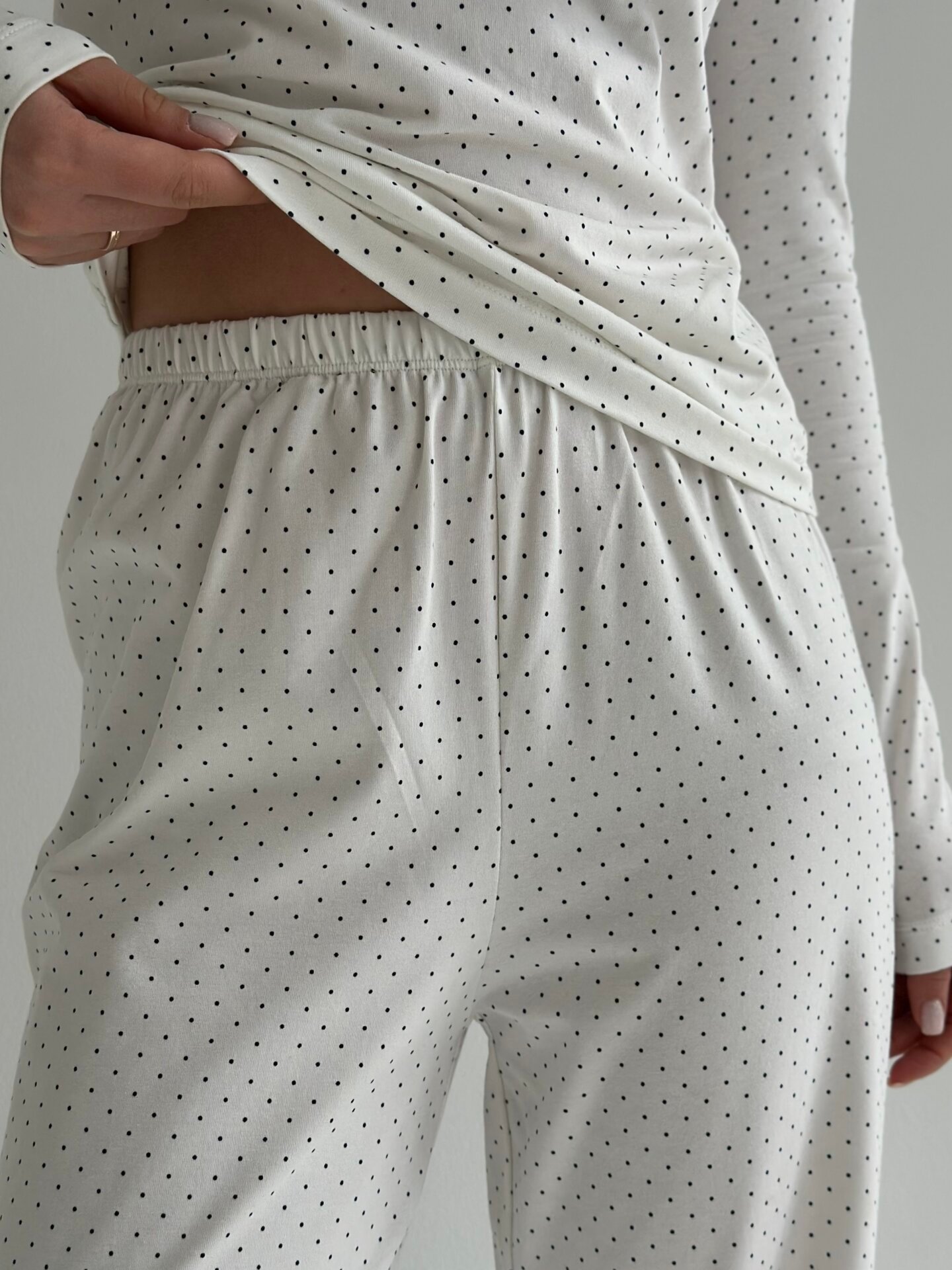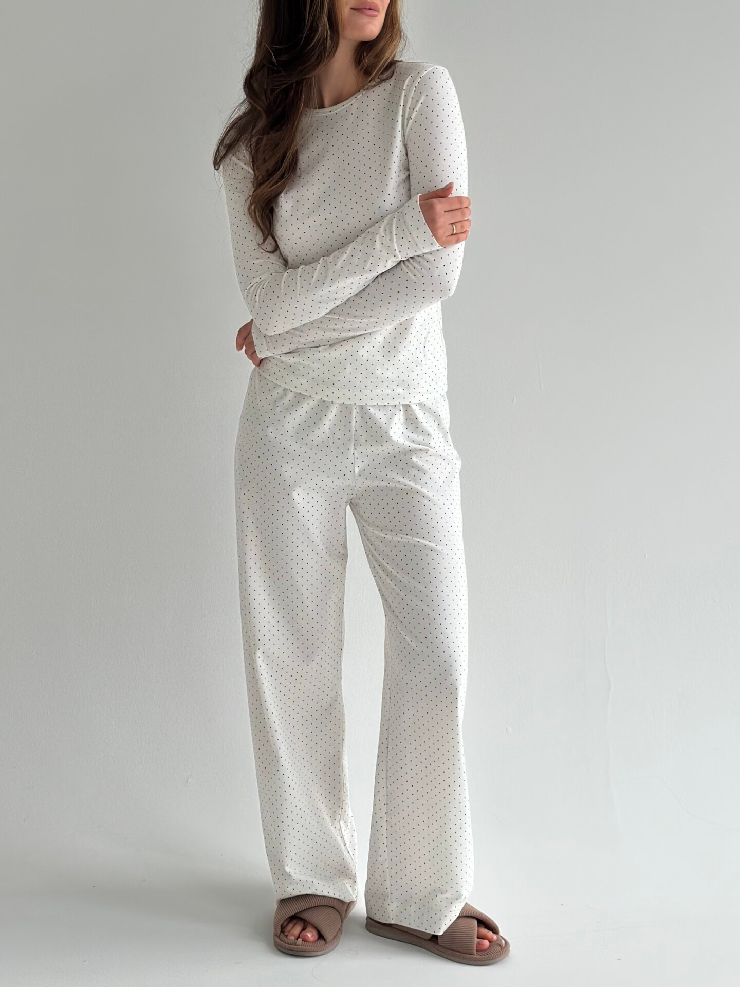 Komplet longsleeve i spodnie szerokie, z dzianiny, biały w granatowe groszki - Miso