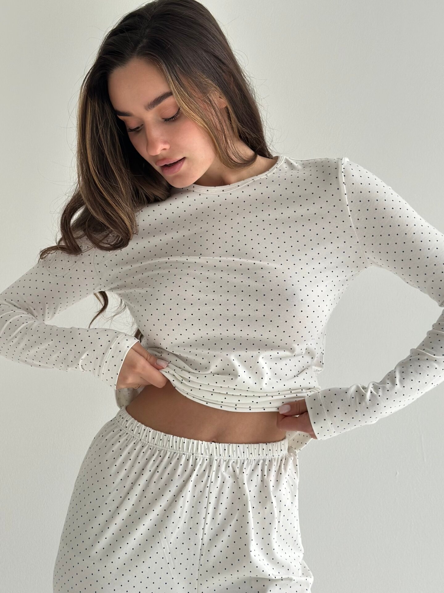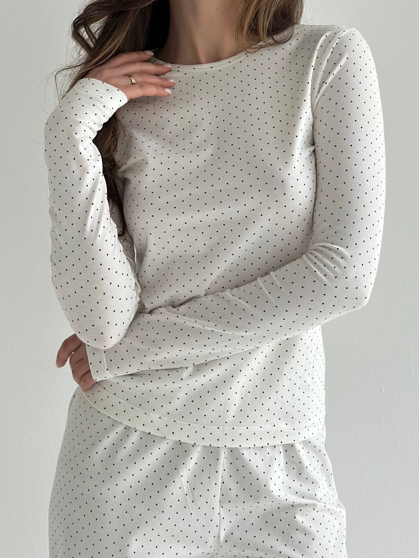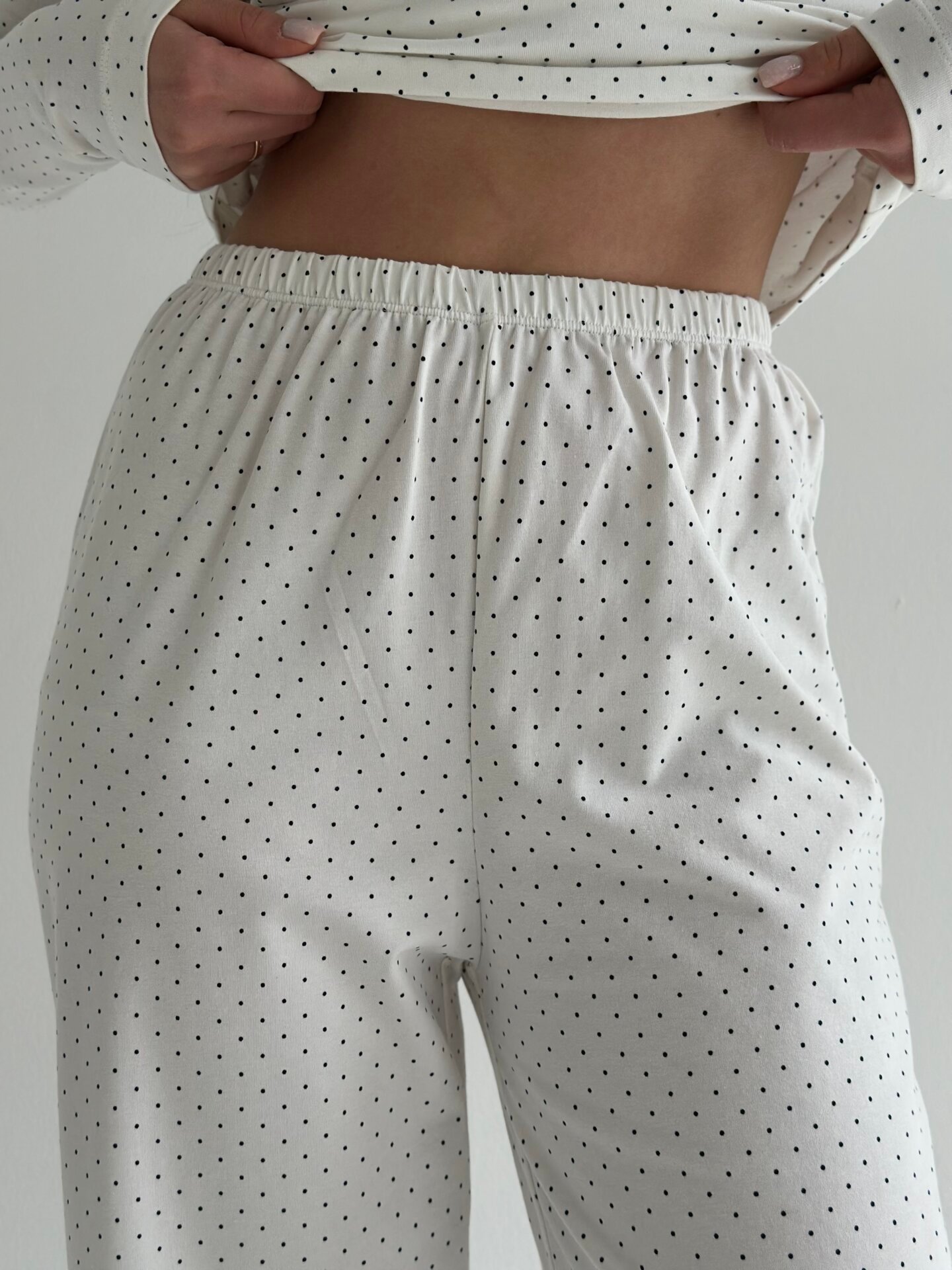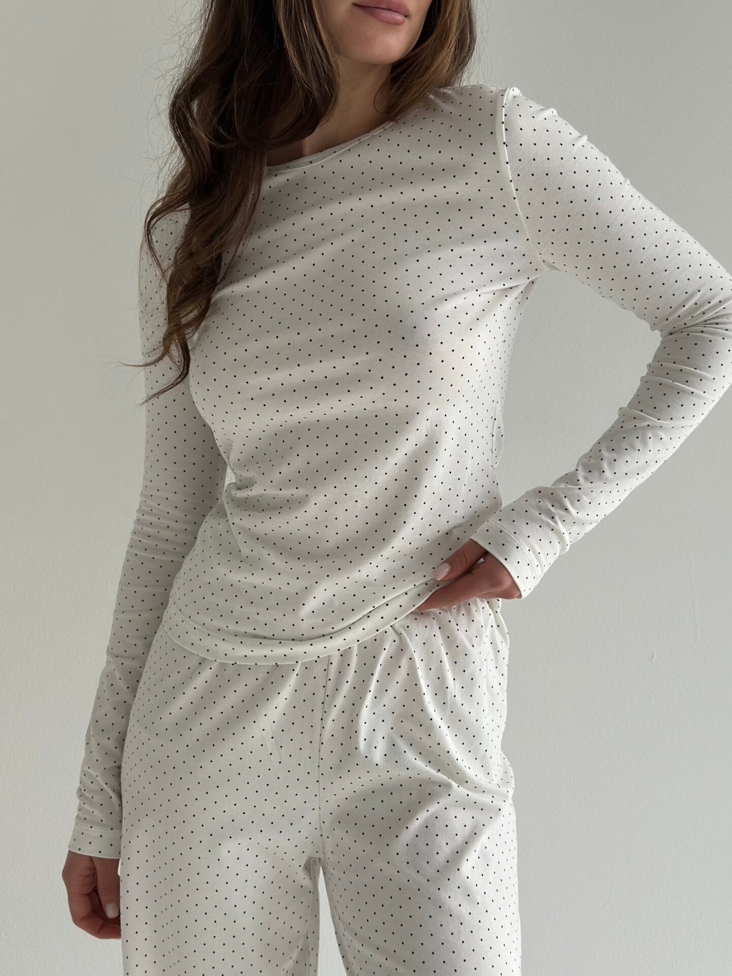 Komplet longsleeve i spodnie szerokie, z dzianiny, biały w granatowe groszki - Miso