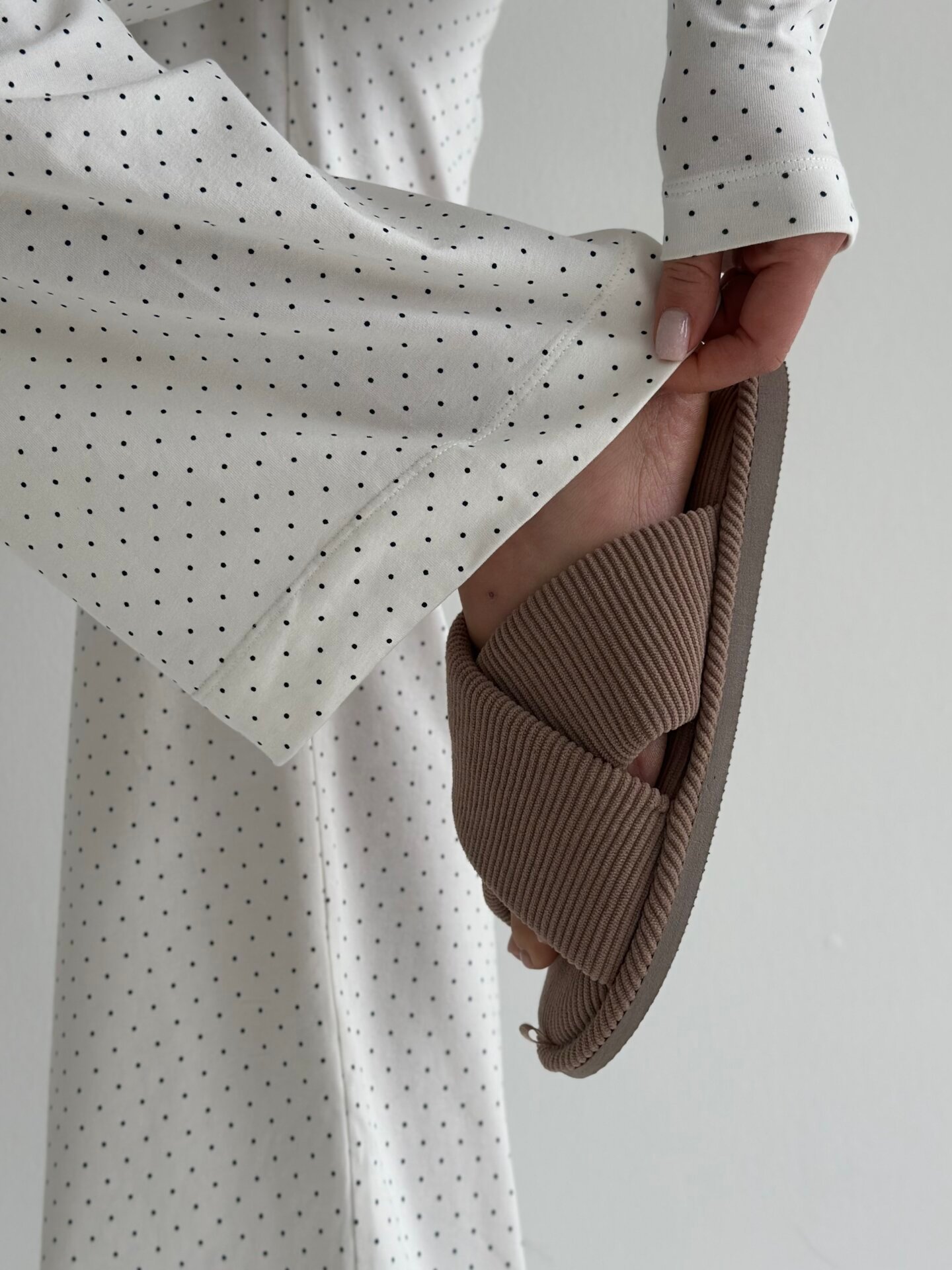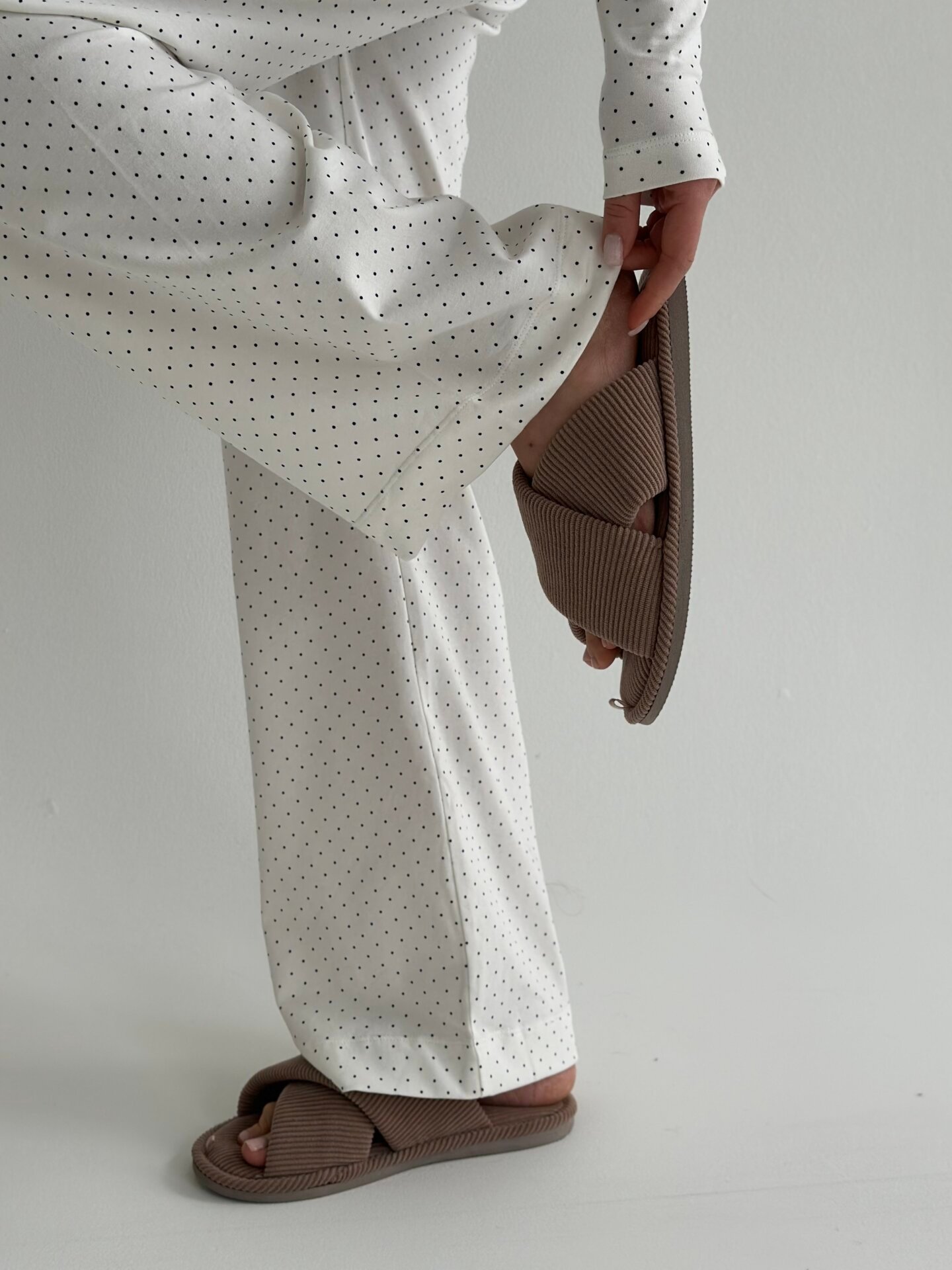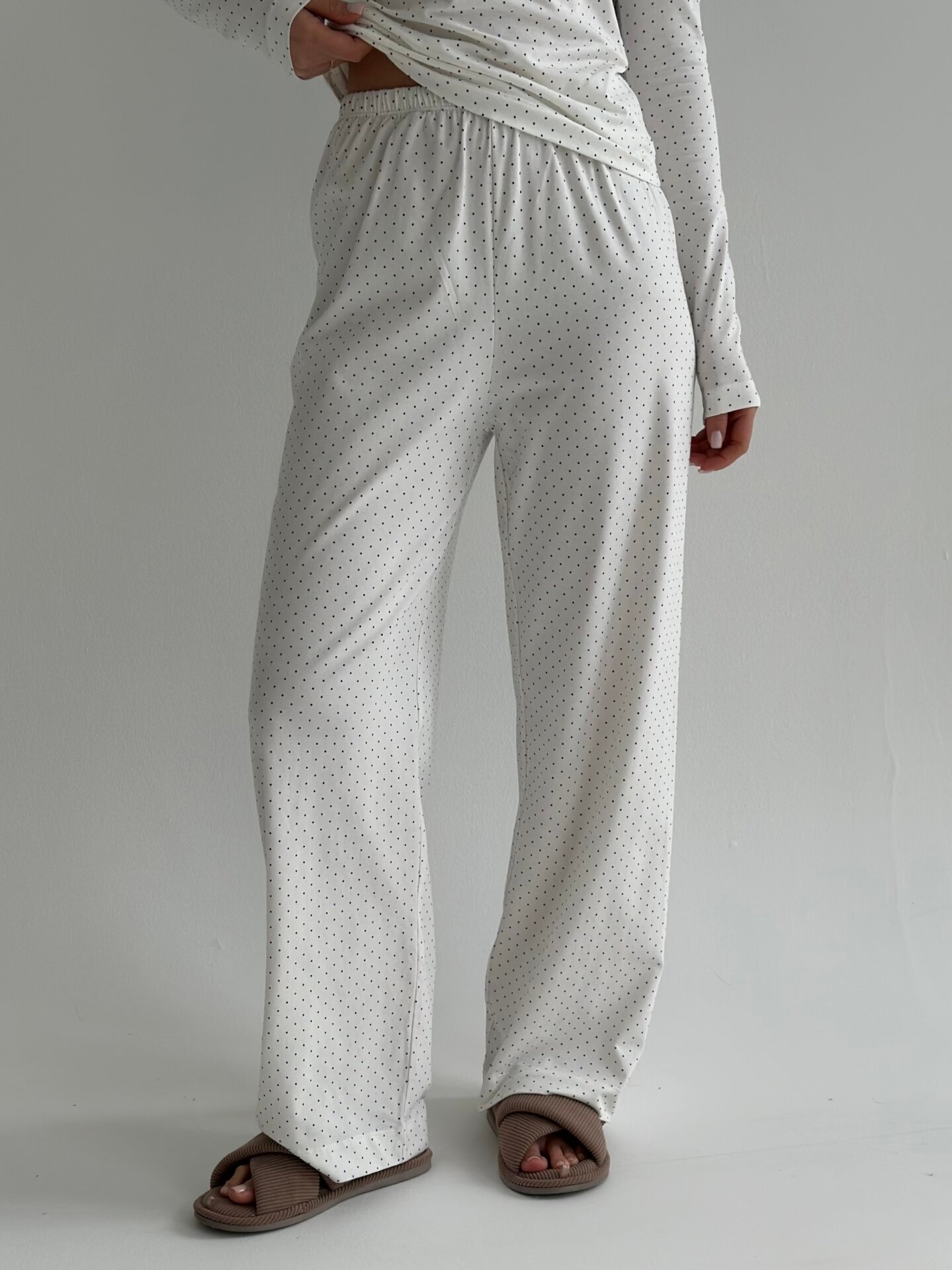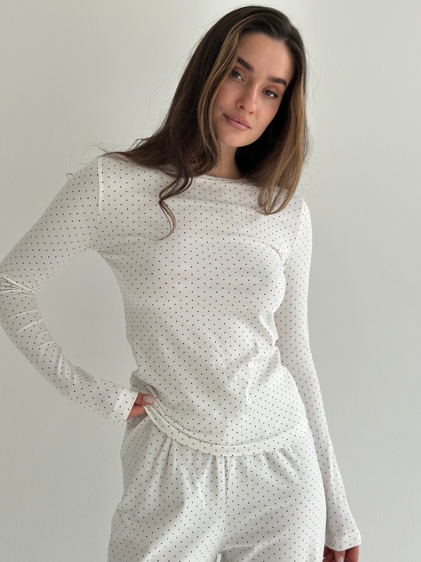 Komplet longsleeve i spodnie szerokie, z dzianiny, biały w granatowe groszki - Miso