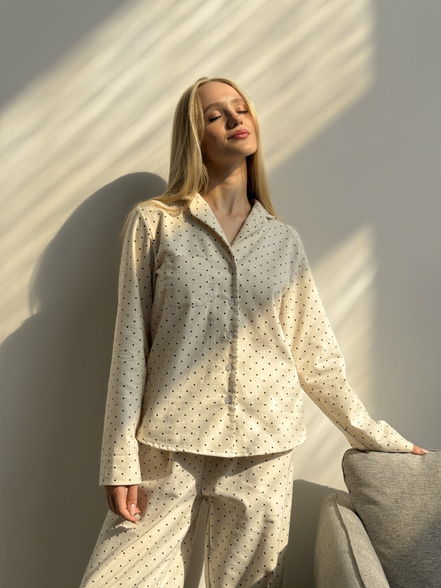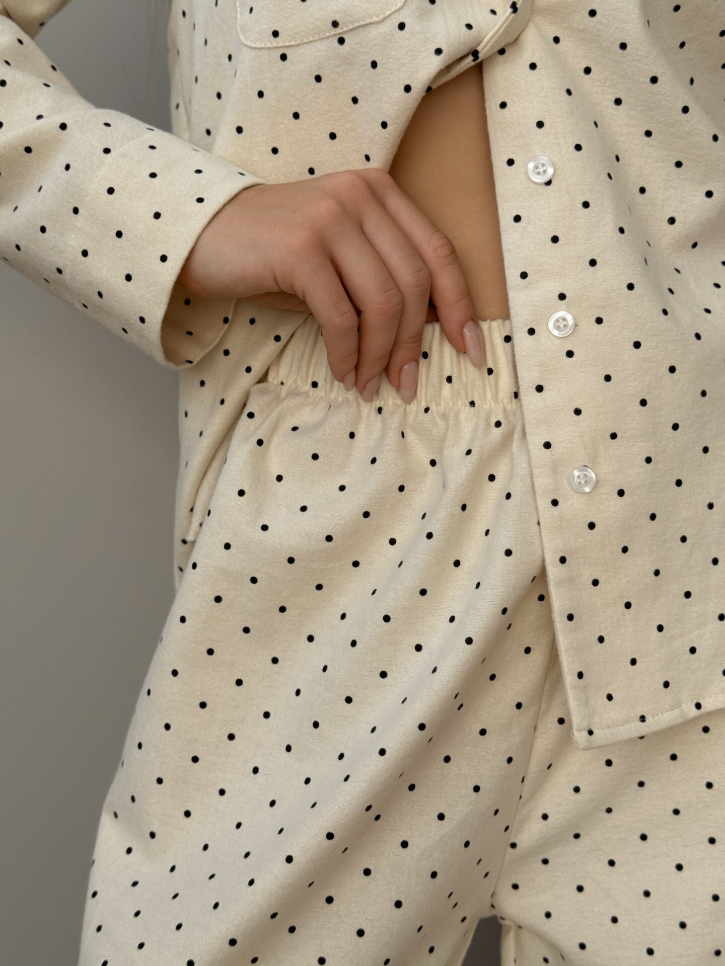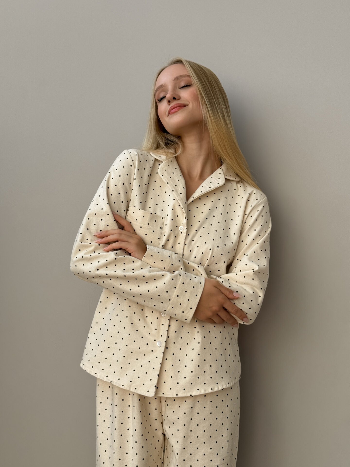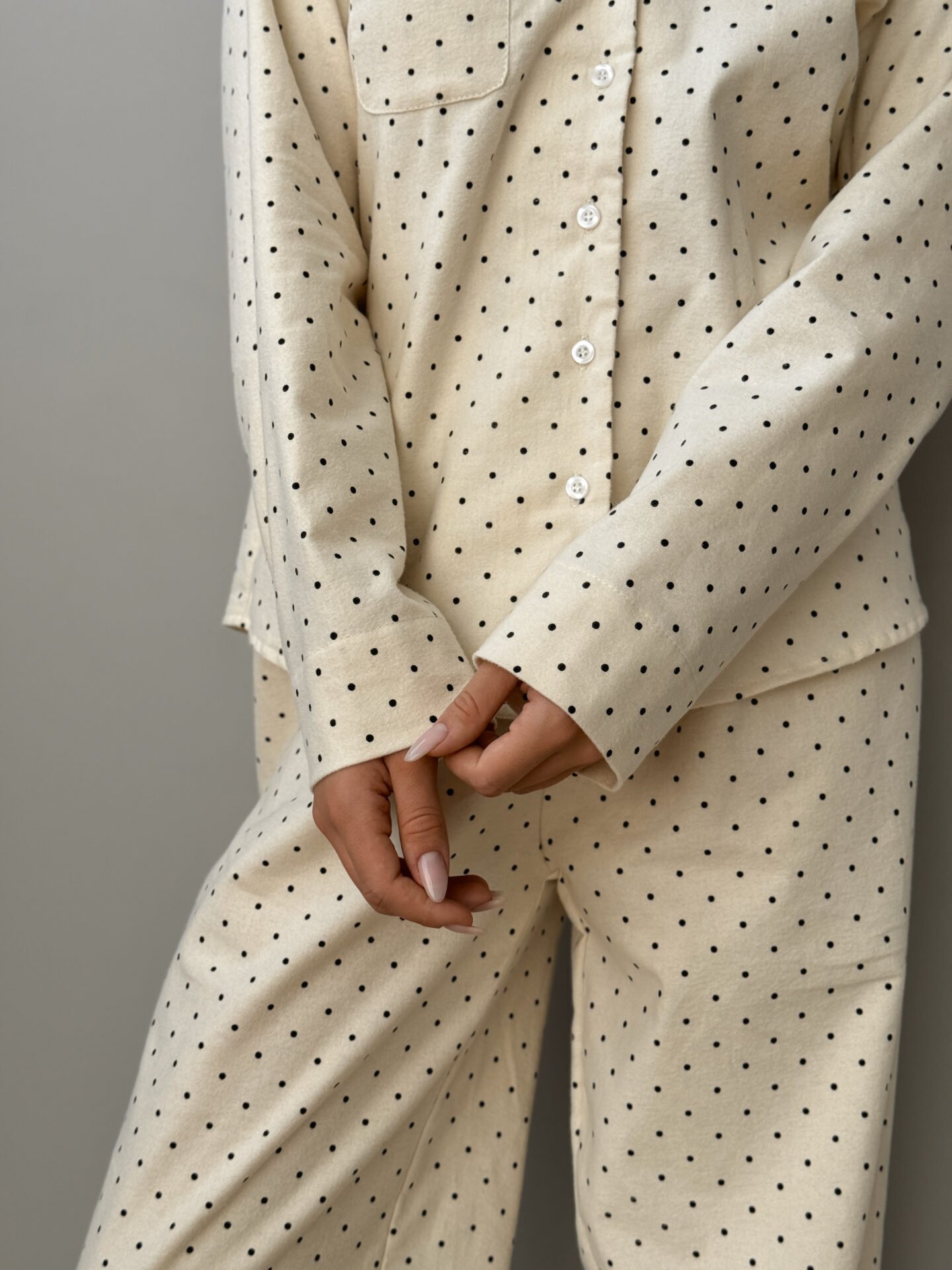 Komplet piżamowy koszula i spodnie, z flaneli, kremowy w groszki