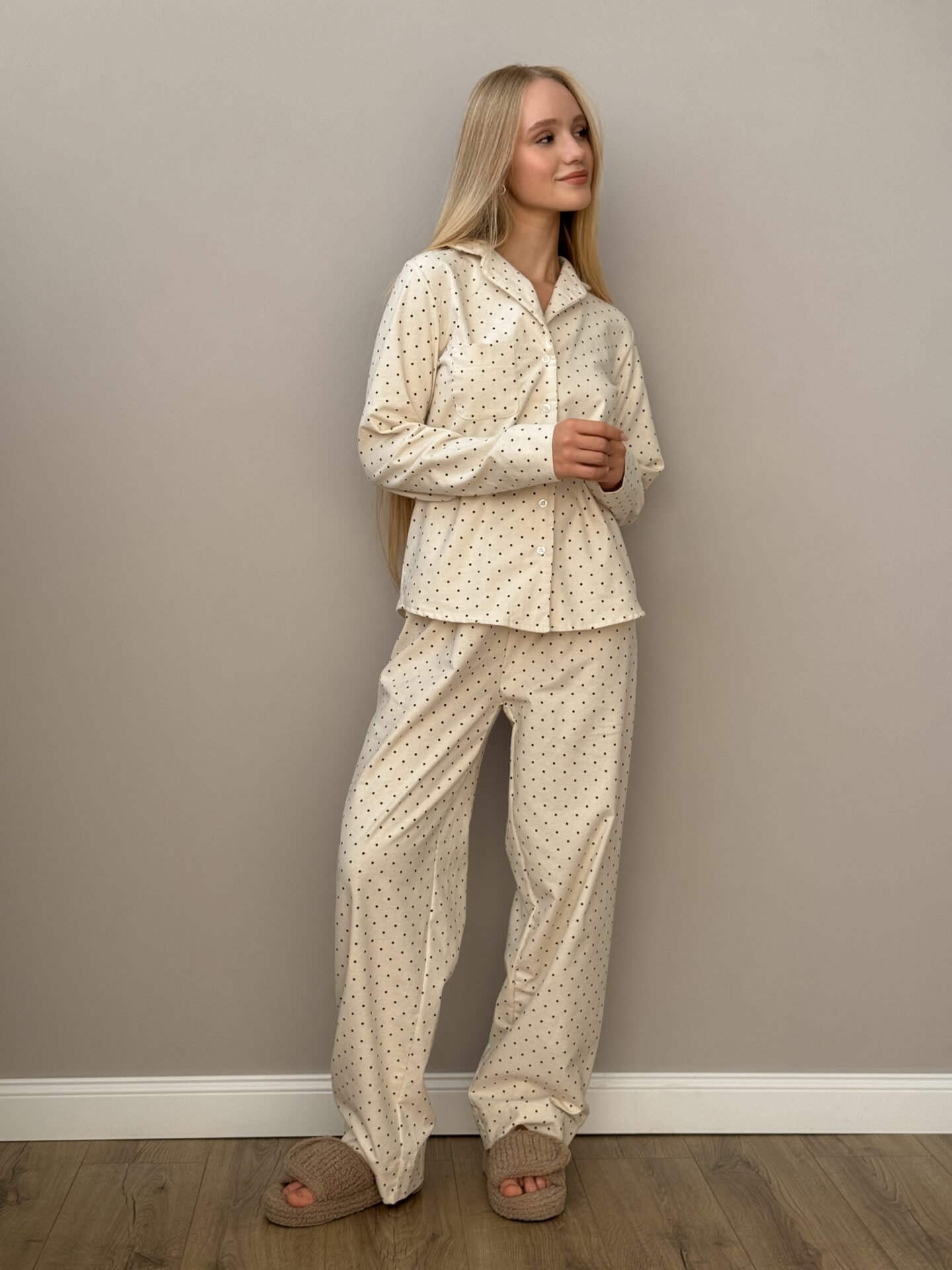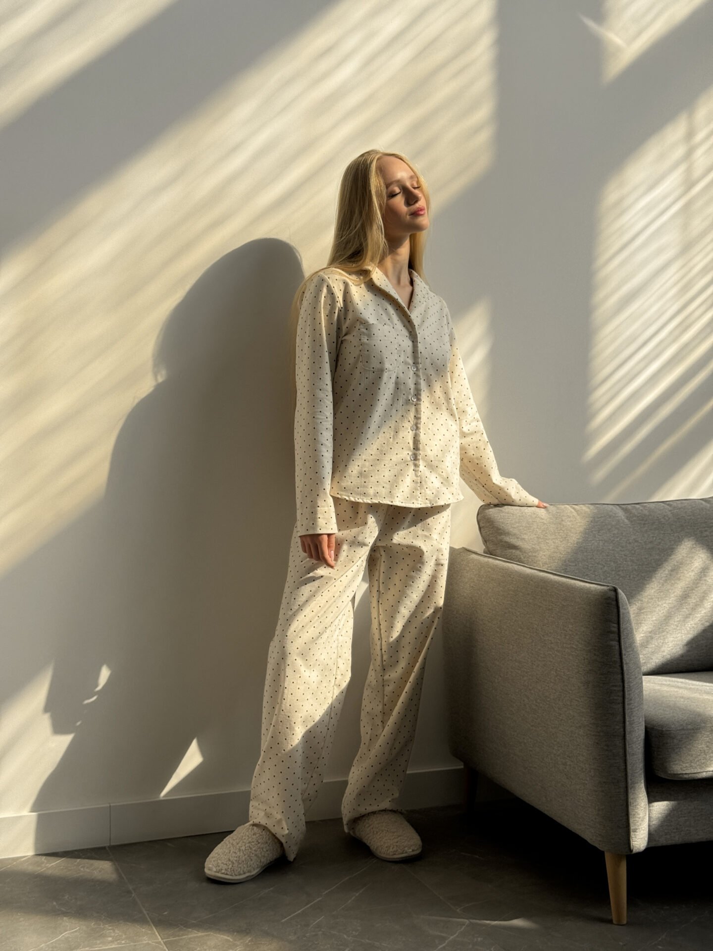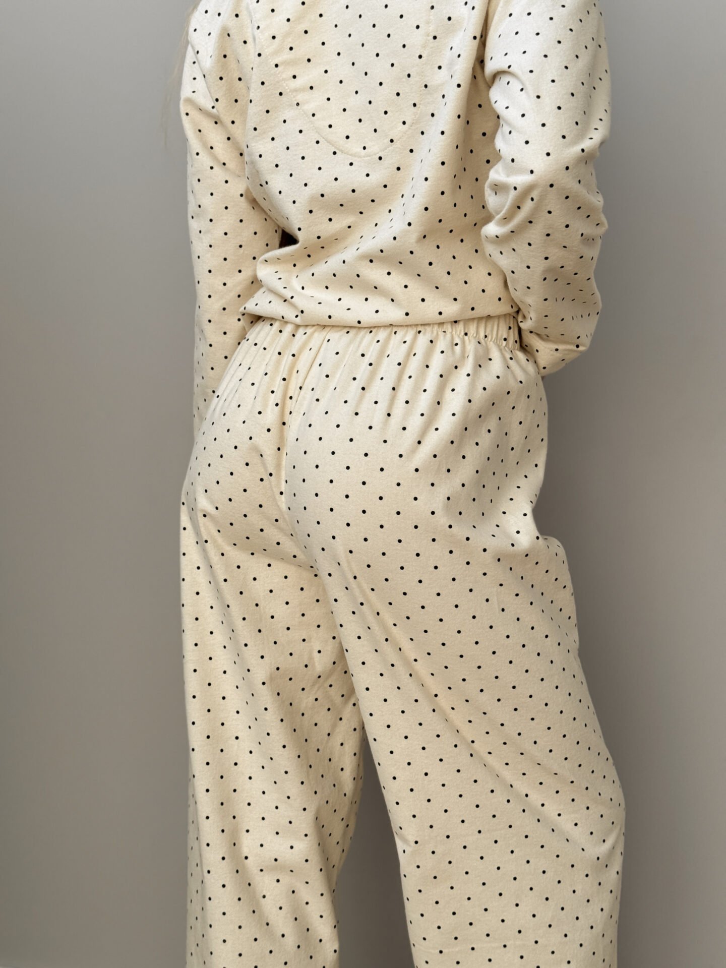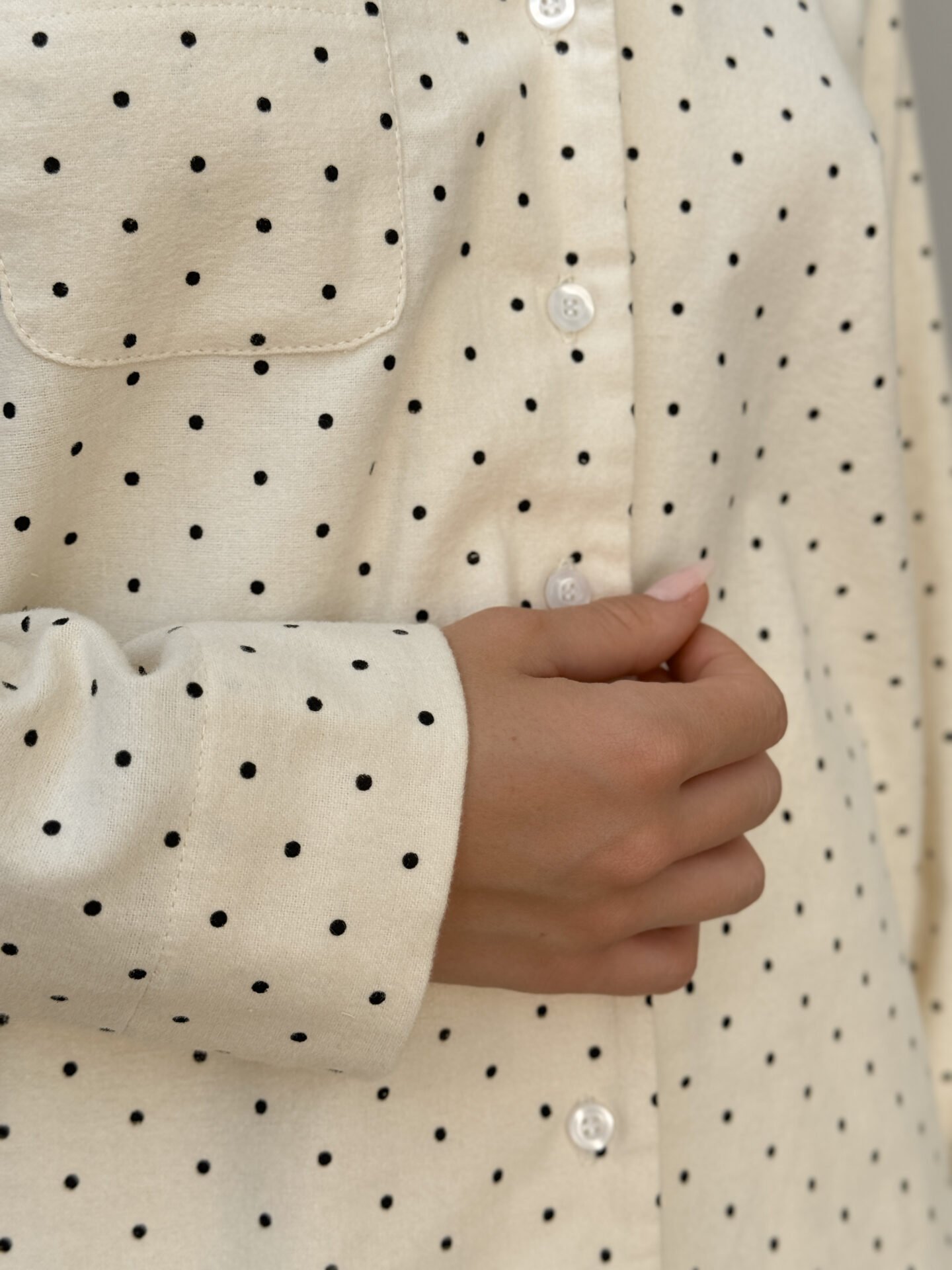 Komplet piżamowy koszula i spodnie, z flaneli, kremowy w groszki