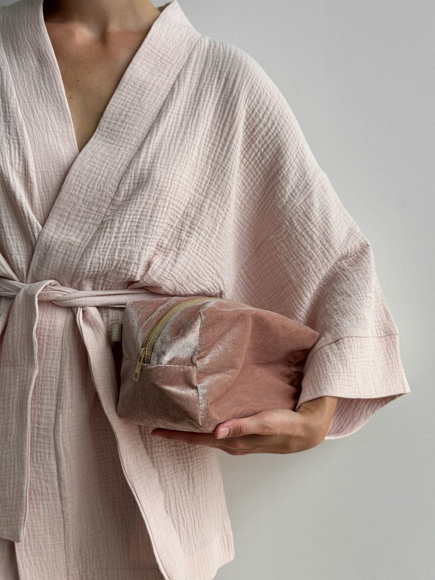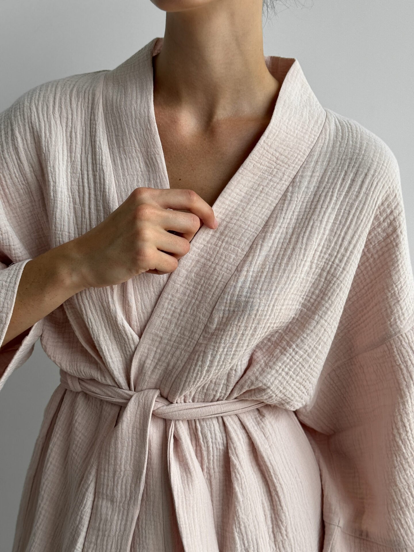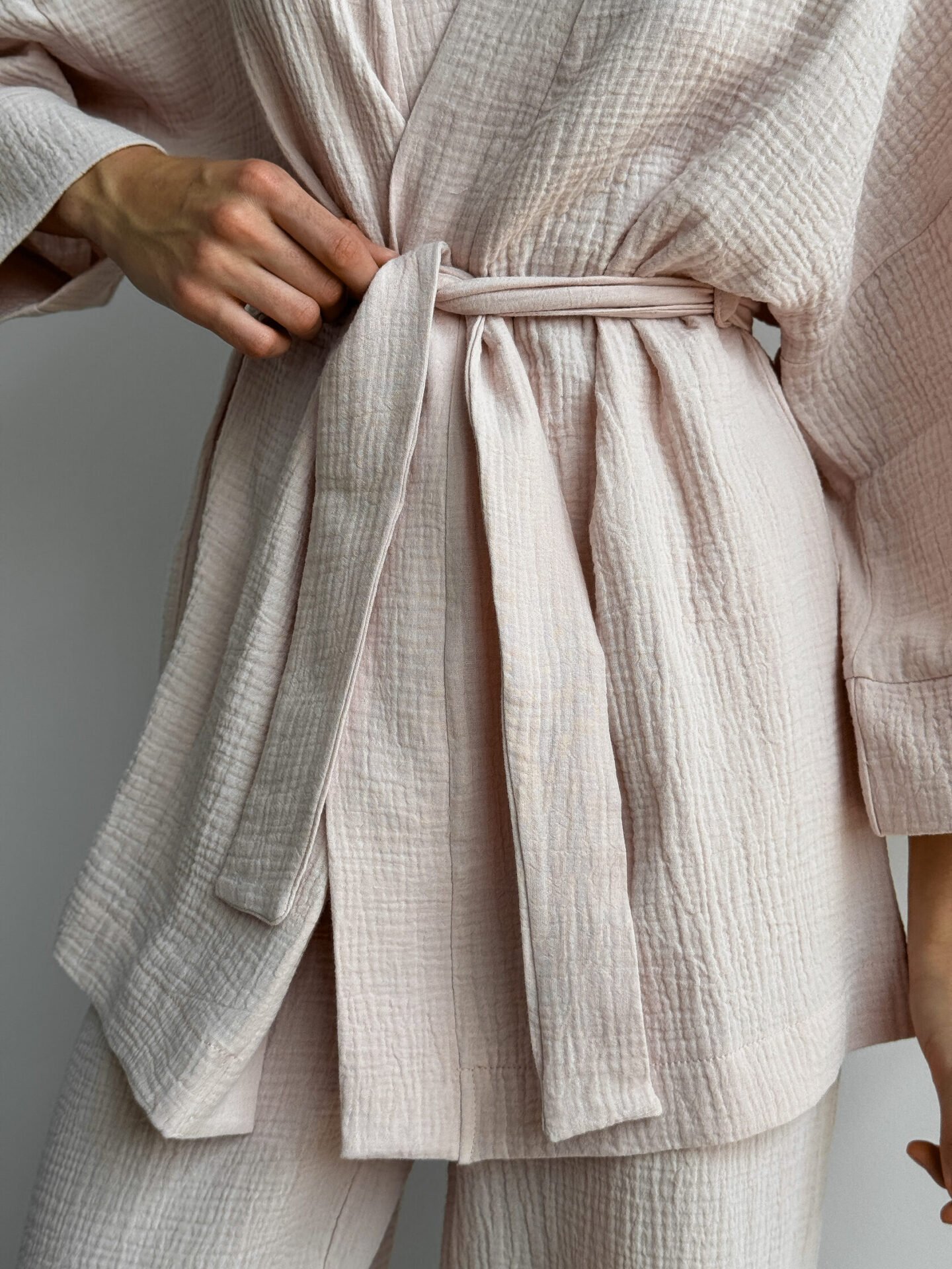 Komplet szlafrok krótki kimono i spodnie, z muślinu dwuwarstwowego, pudrowy