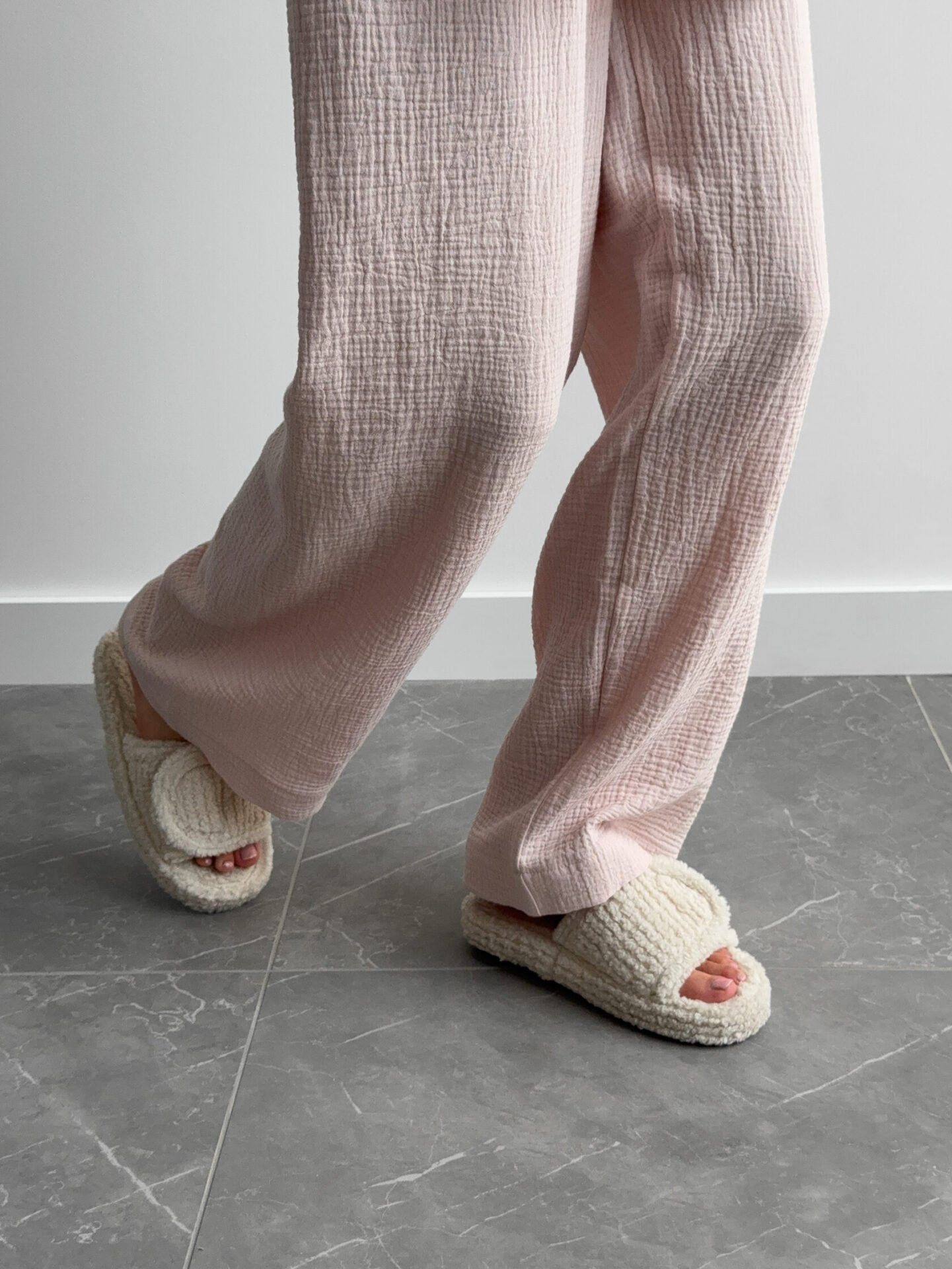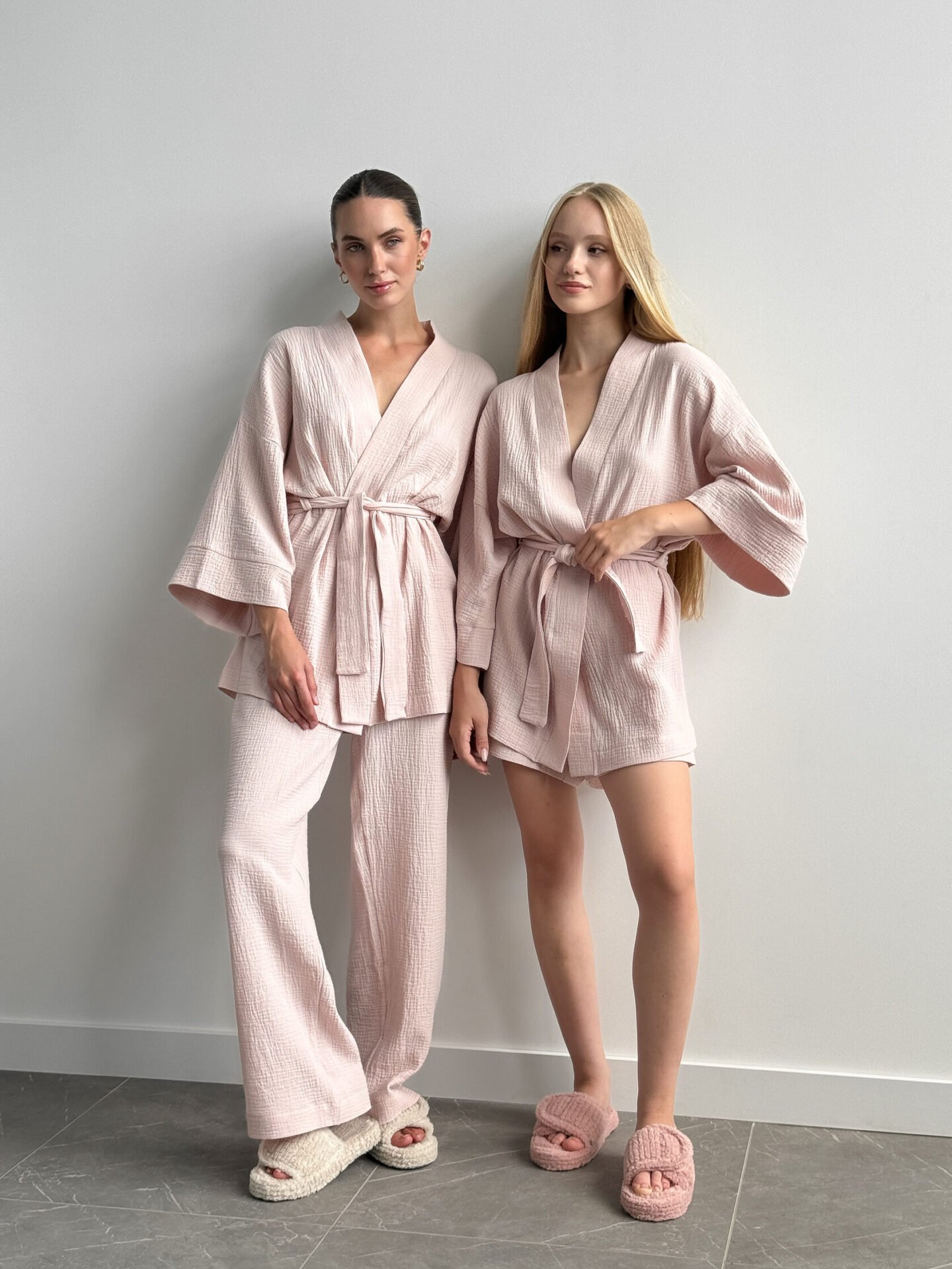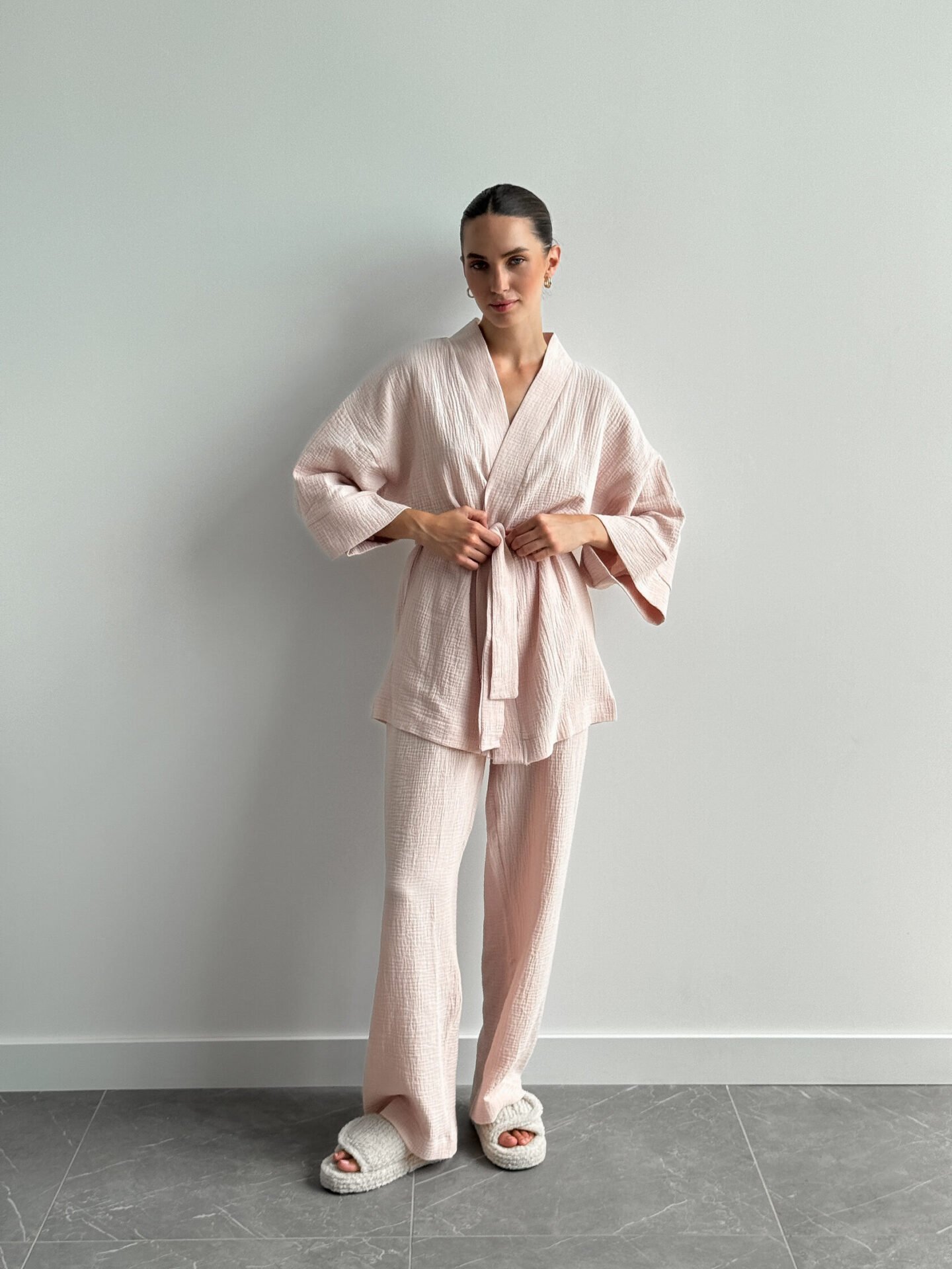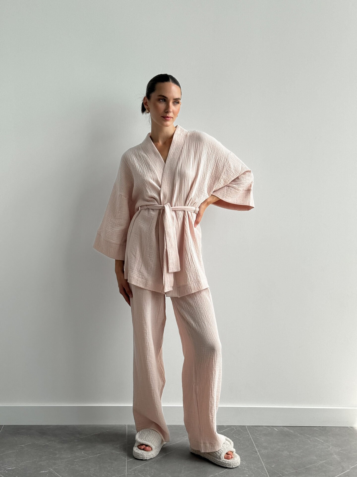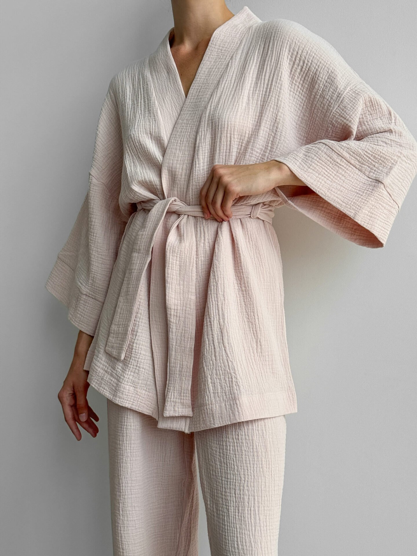 Lekki zestaw z muślinu z 2-warstwowej tkaniny: kimono i spodnie. Naturalny materiał zapewnia komfort i swobodę, tworząc stylowy i przytulny wygląd.