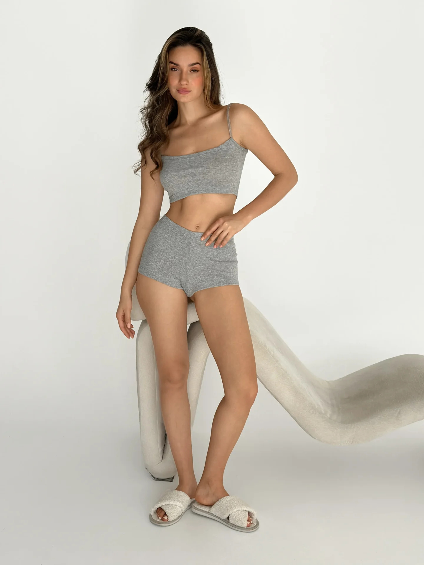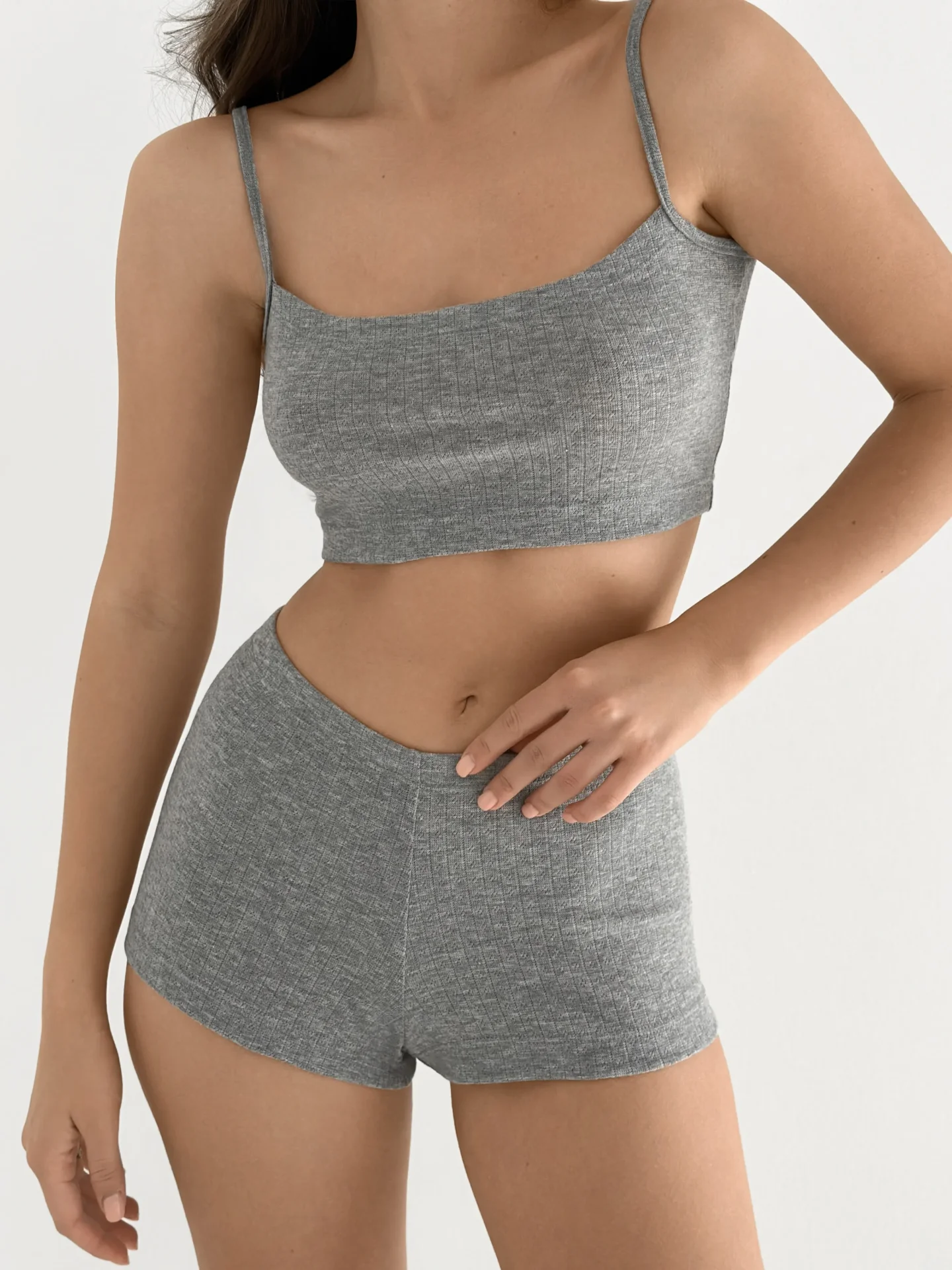 Komplet z prążkowanej dzianiny: top na ramiączkach i szorty mini łączy komfort z prostym stylem. Miękka, elastyczna tkanina delikatnie przylega do ciała, zapewniając swobodę ruchów. Top na ramiączkach podkreśla sylwetkę, a szorty o wygodnym kroju tworzą lekki i kobiecy look. Idealny wybór na domowy relaks i codzienne letnie stylizacje.