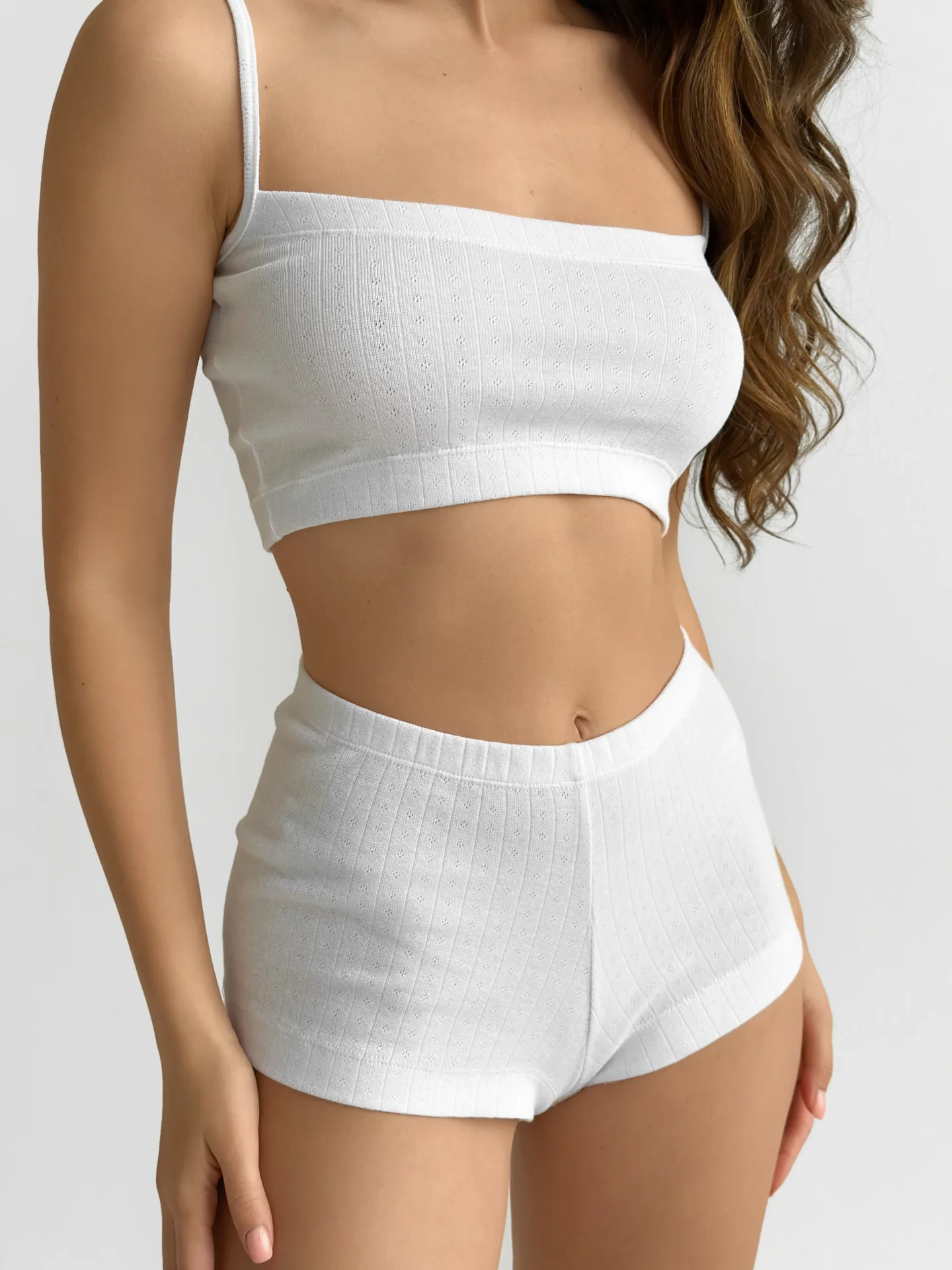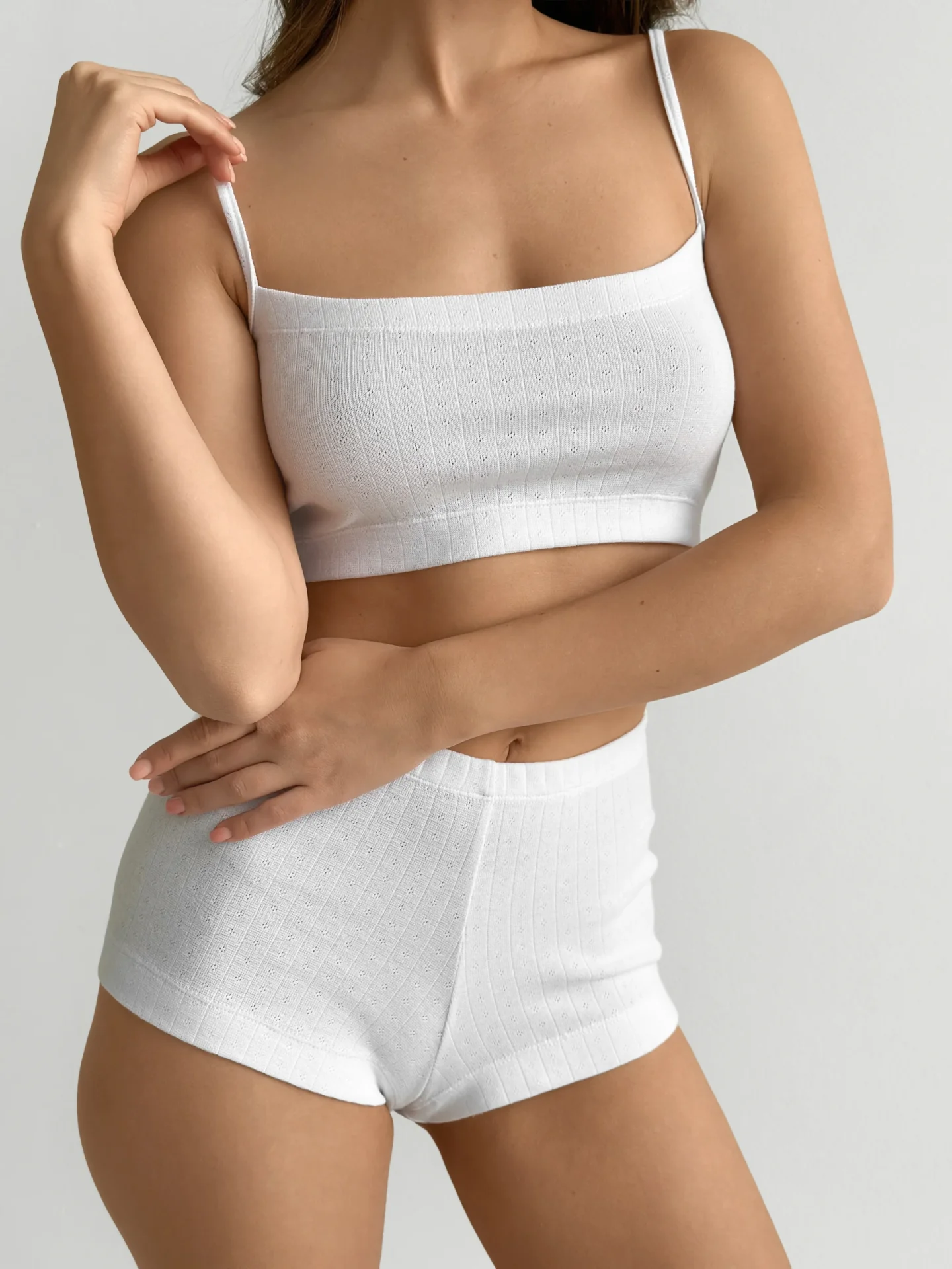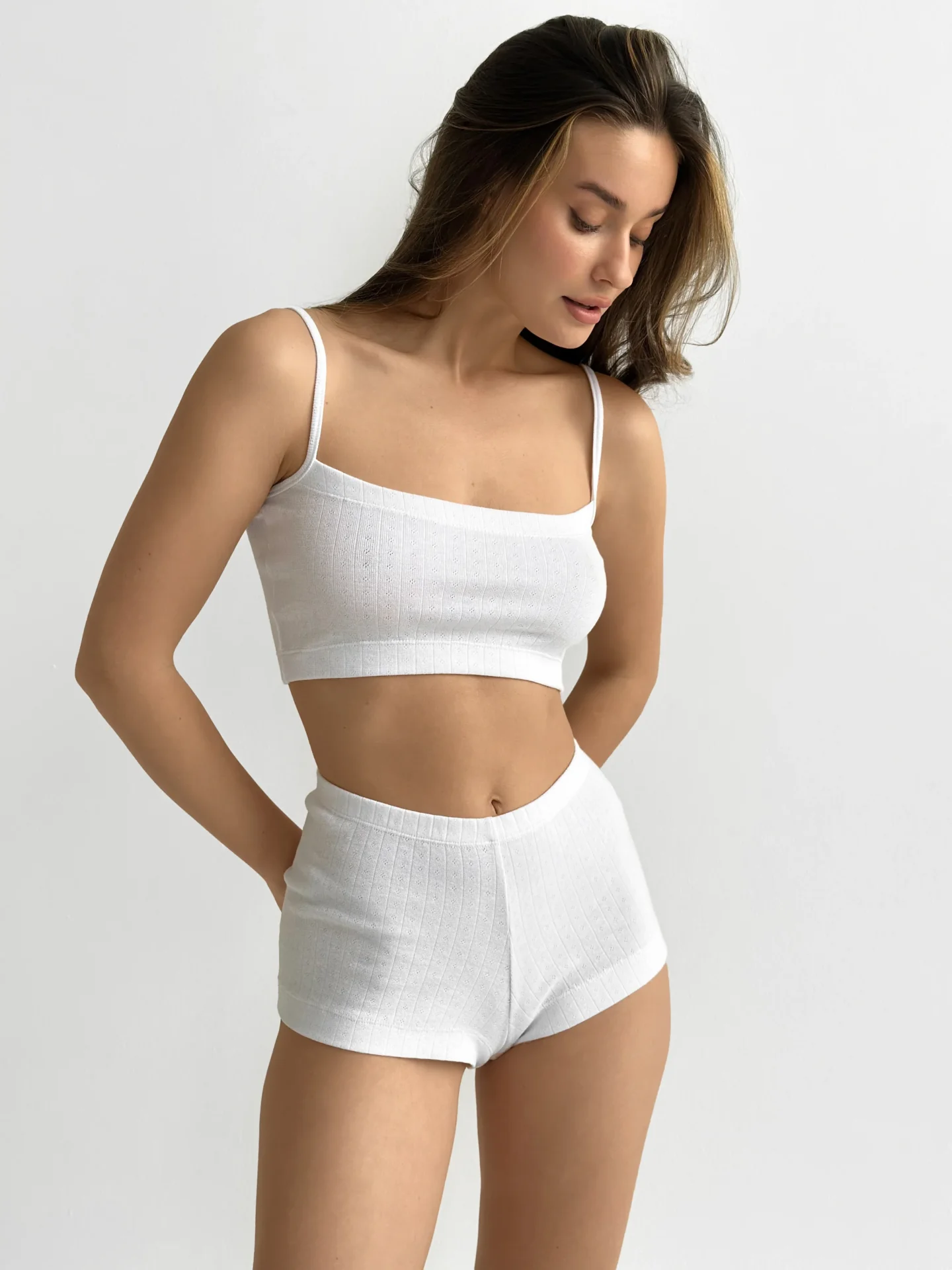 Komplet top mini na ramiączkach i szorty mini, z ribany prążkowanej, biały