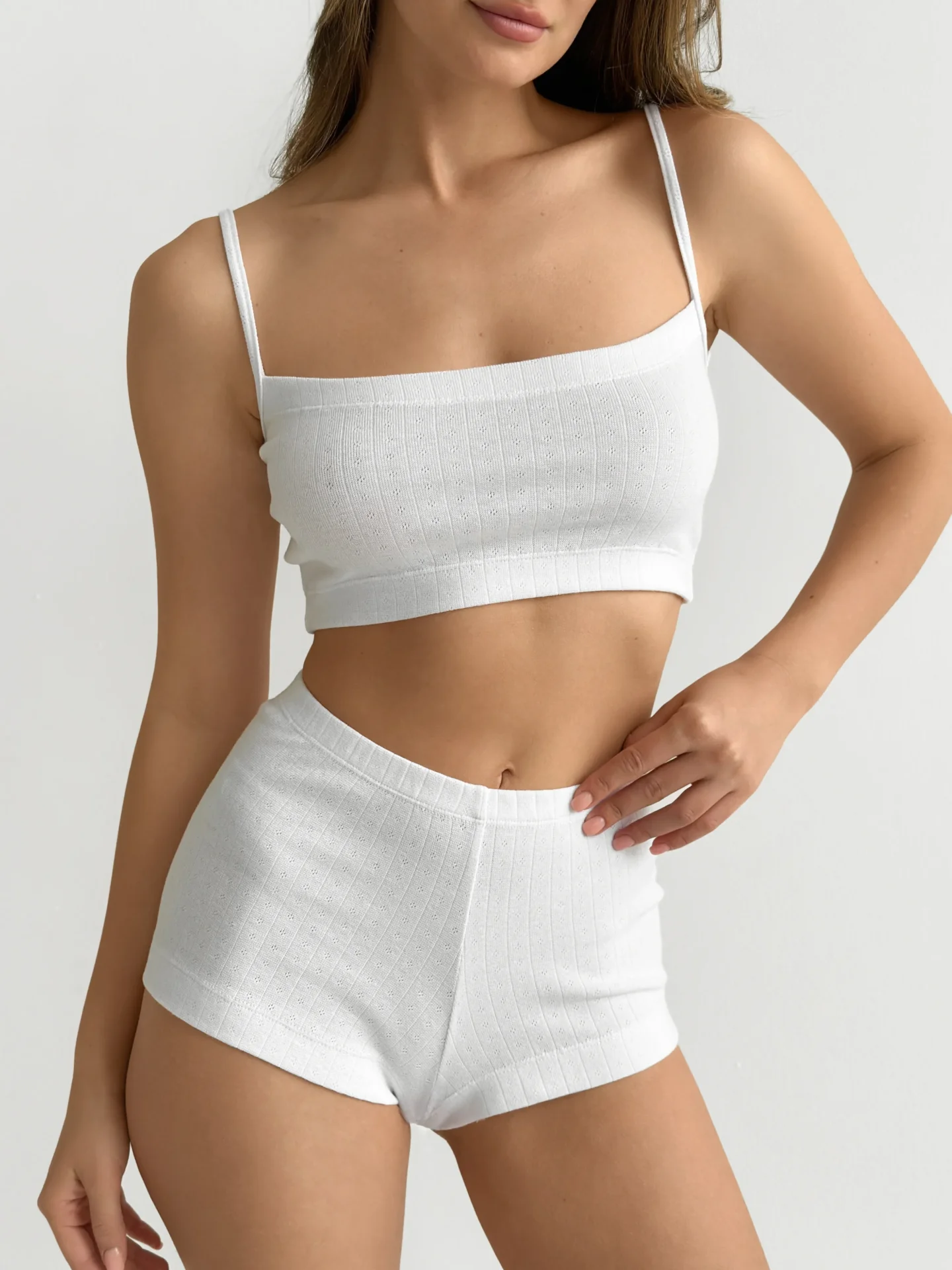 Komplet z prążkowanej dzianiny: top na ramiączkach i szorty mini łączy komfort z prostym stylem. Miękka, elastyczna tkanina delikatnie przylega do ciała, zapewniając swobodę ruchów. Top na ramiączkach podkreśla sylwetkę, a szorty o wygodnym kroju tworzą lekki i kobiecy look. Idealny wybór na domowy relaks i codzienne letnie stylizacje.
