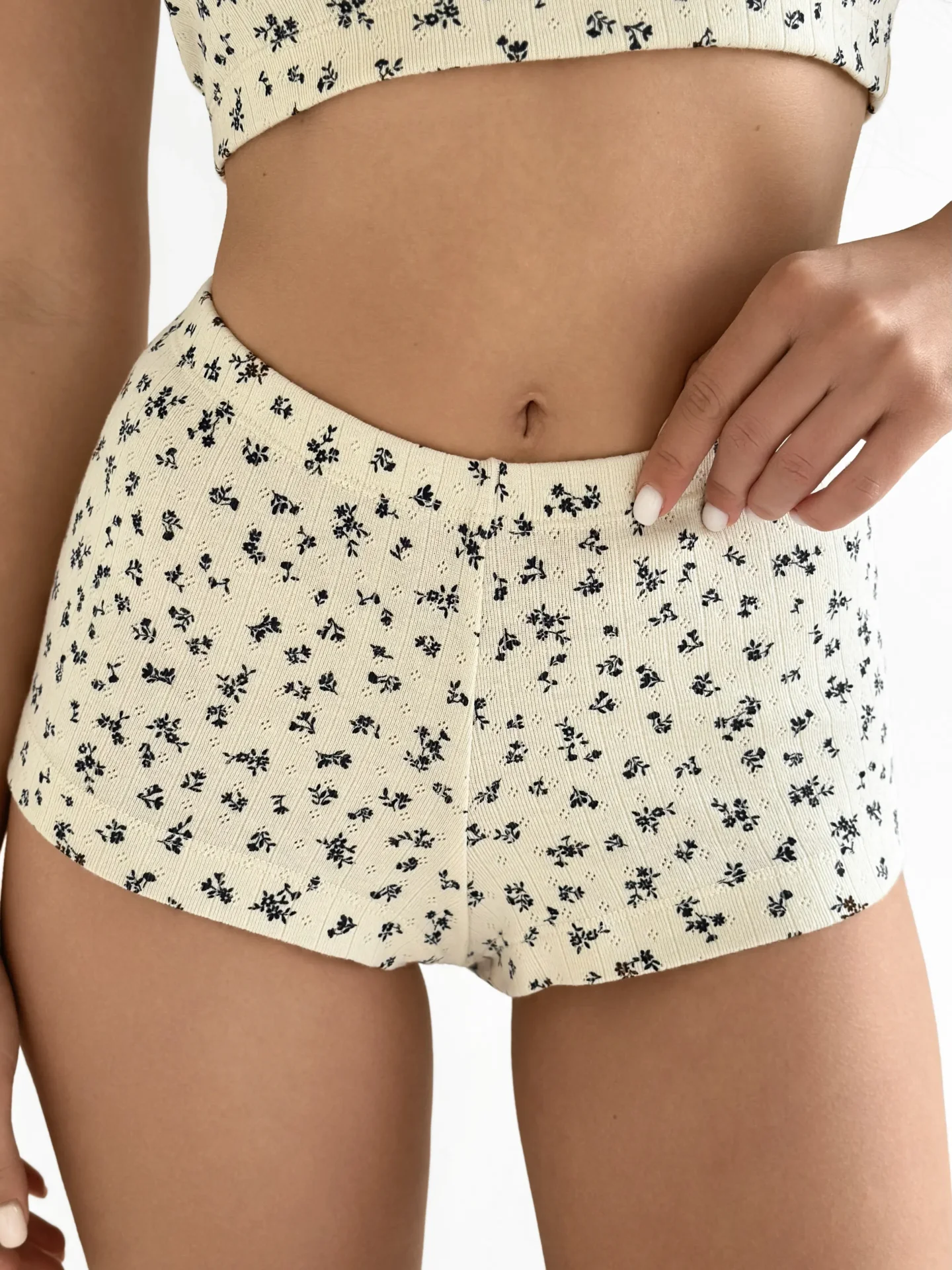 Komplet top mini na ramiączkach i szorty mini, z ribany prążkowanej, kremowy w granatowe kwiatki
