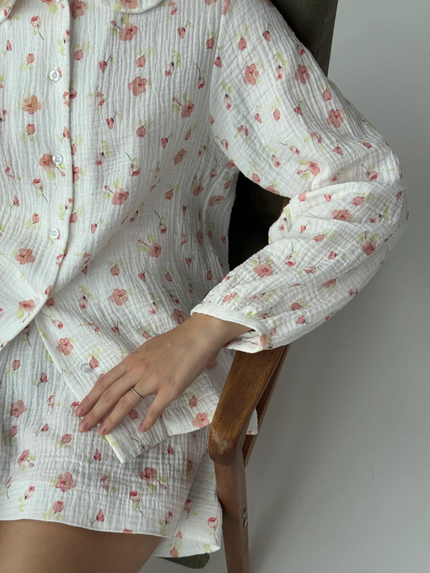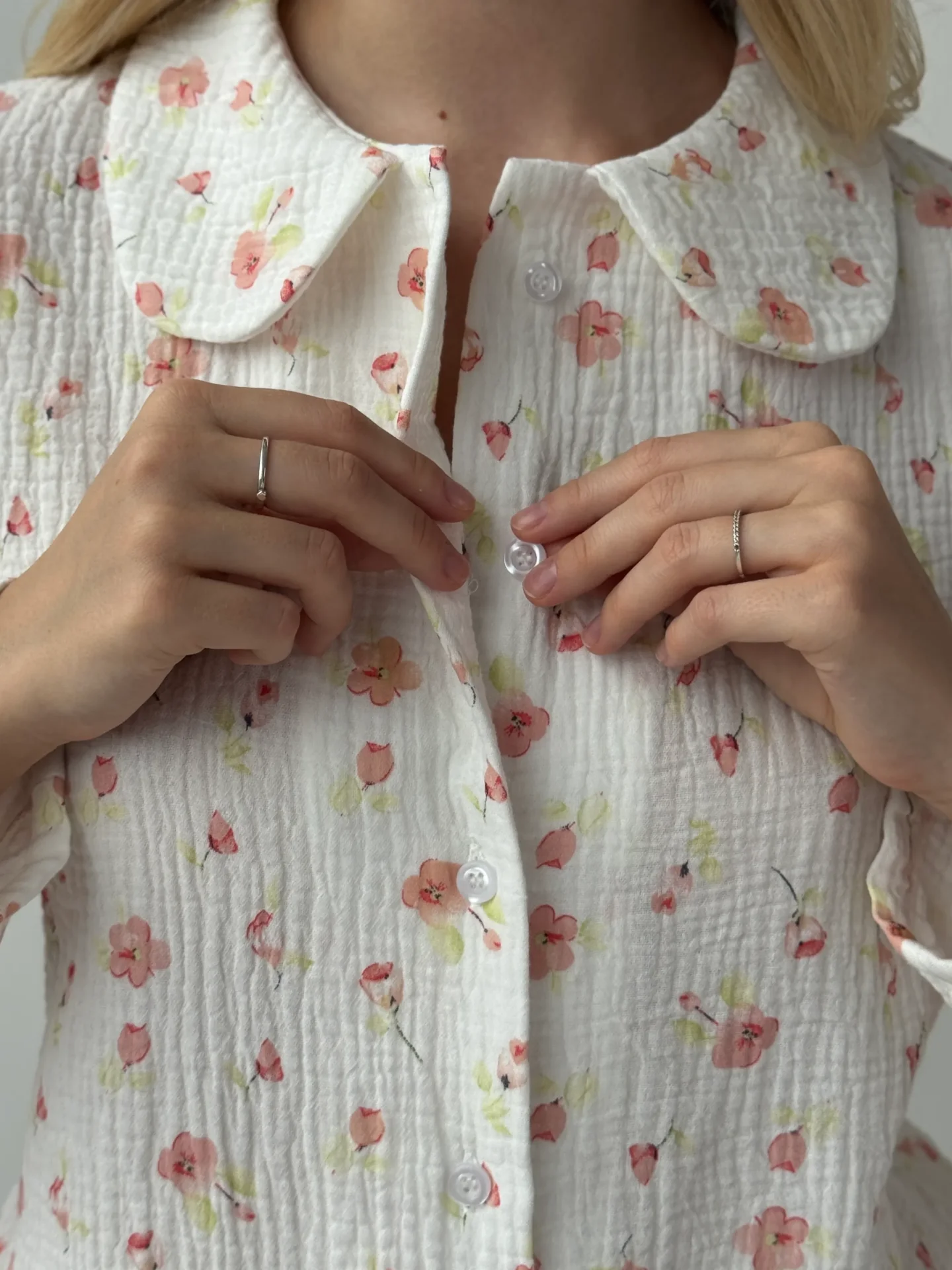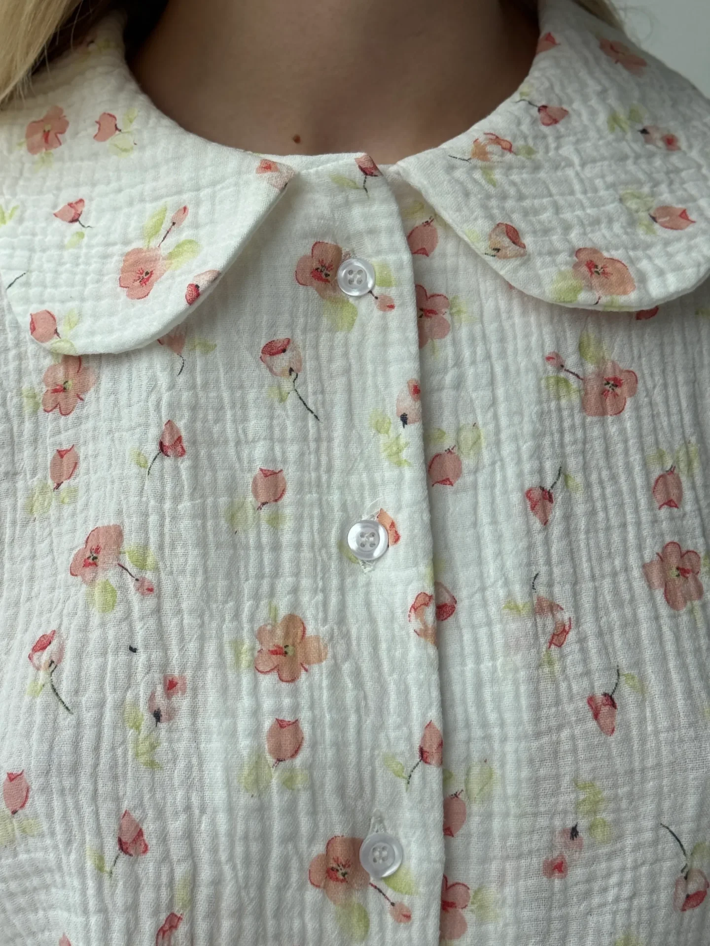 Kostium z muślinu z okrągłym kołnierzykiem. Lekki, przewiewny i przyjemny dla skóry, zapewnia komfort na co dzień. Prosty, elegancki krój dodaje stylizacji delikatności i subtelnej elegancji.