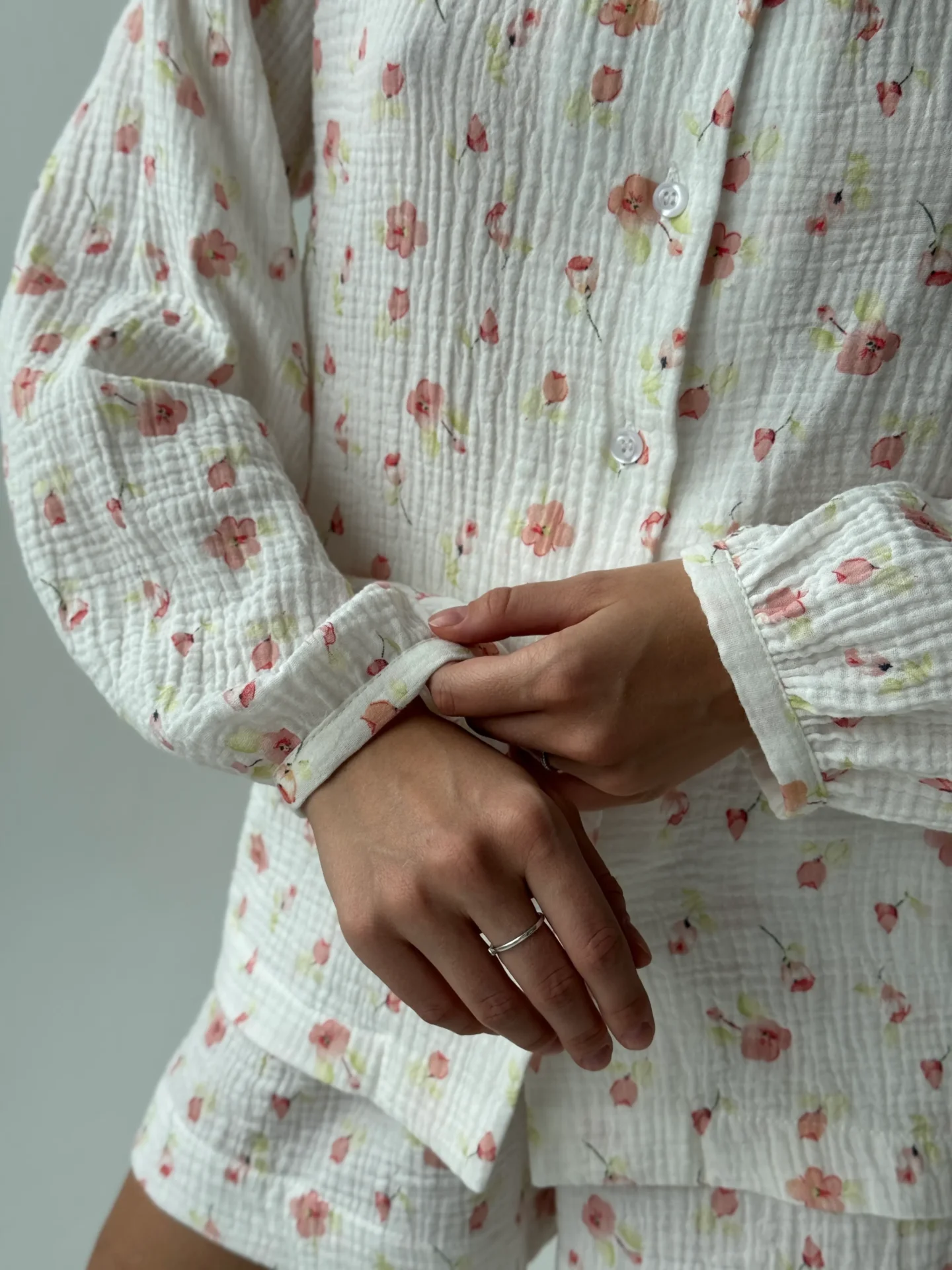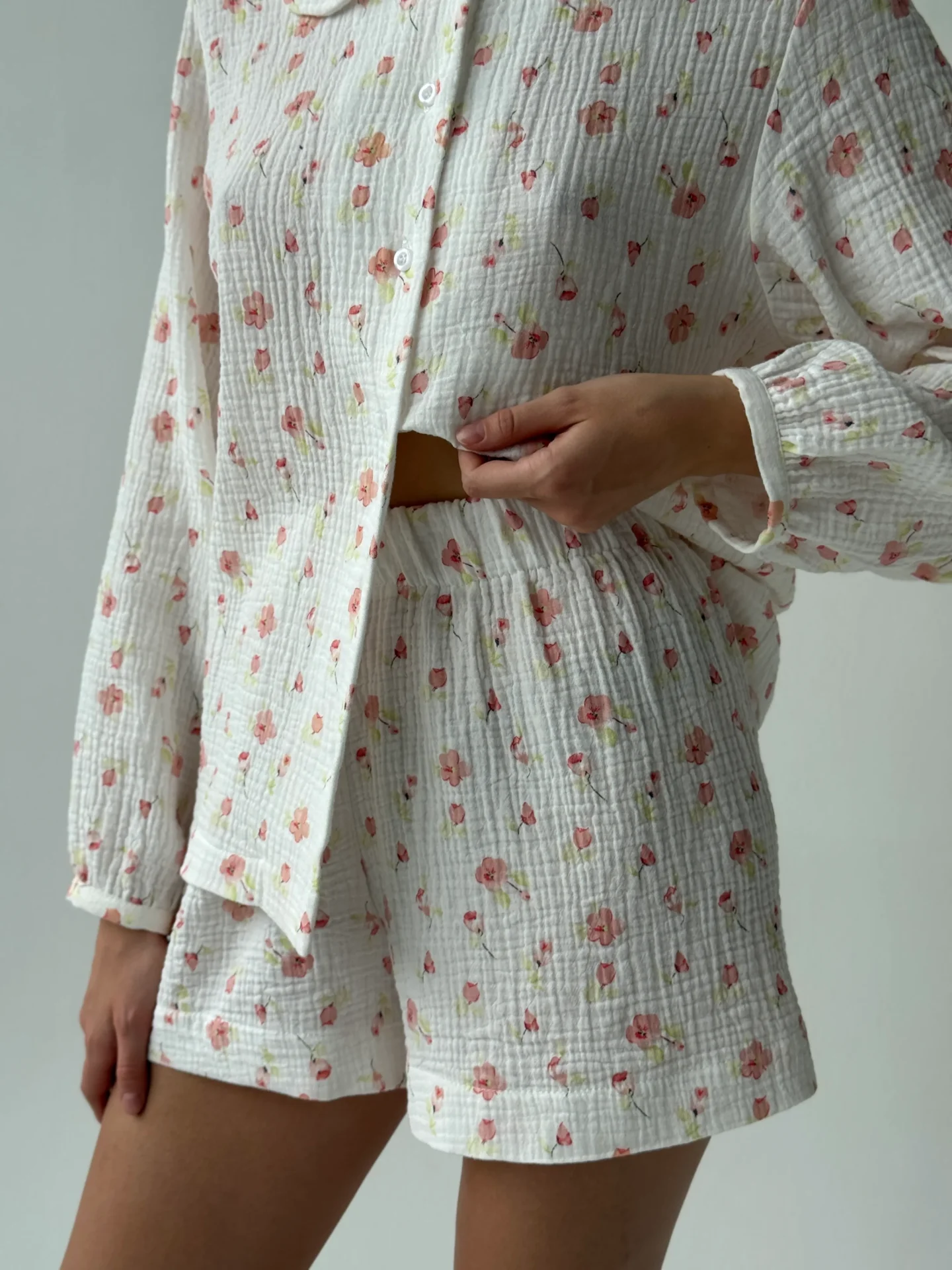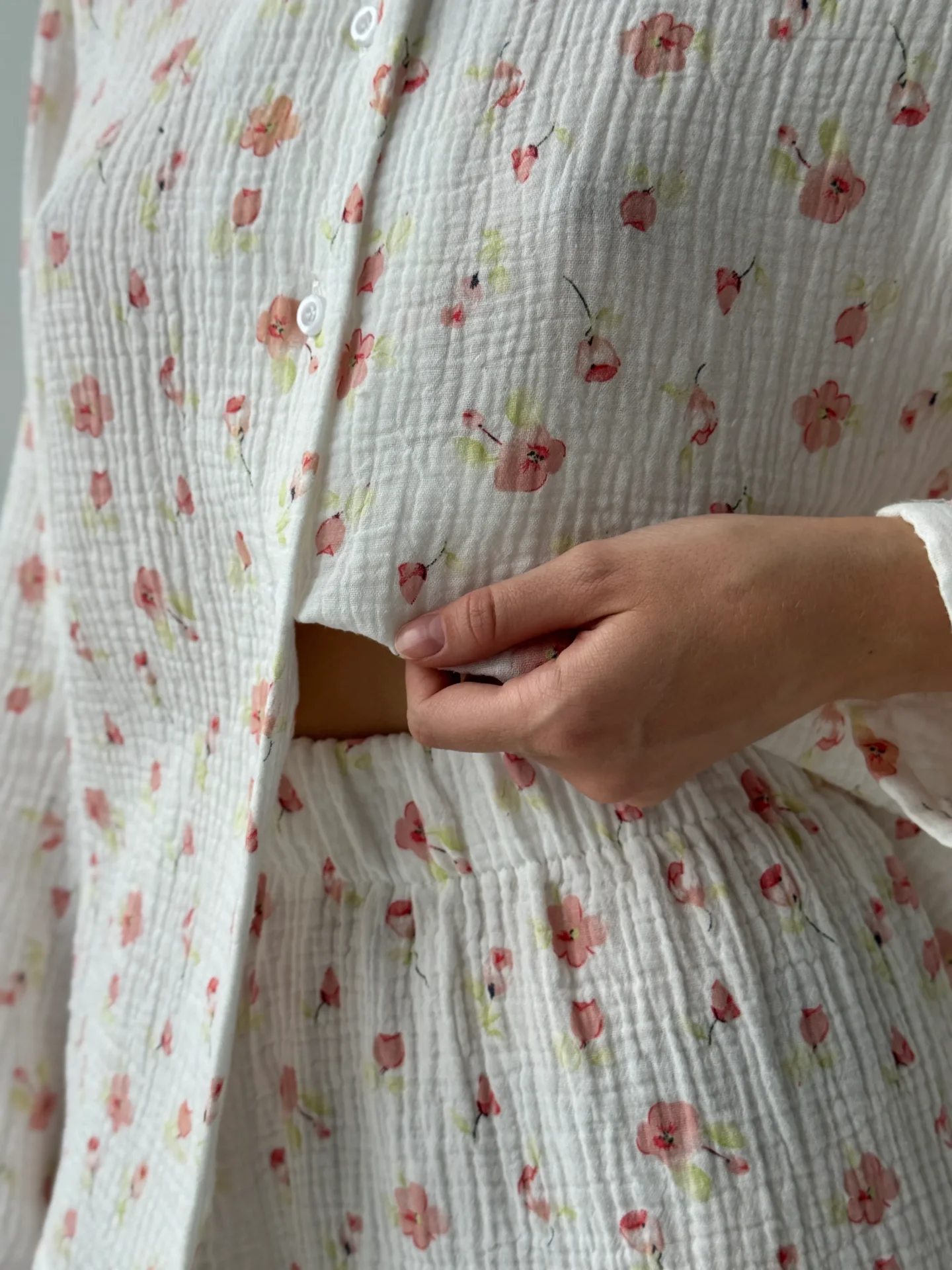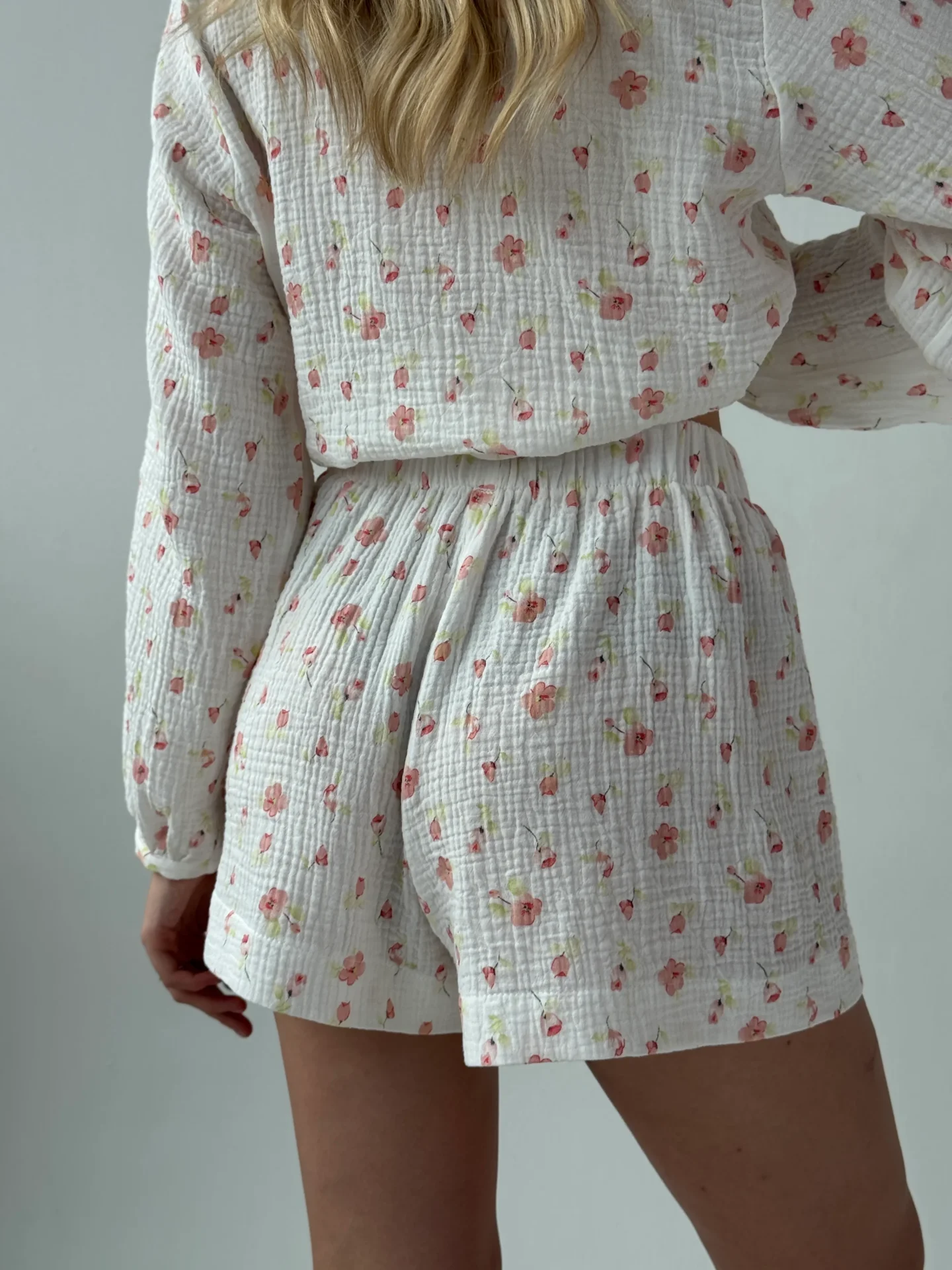 Kostium z muślinu z okrągłym kołnierzykiem. Lekki, przewiewny i przyjemny dla skóry, zapewnia komfort na co dzień. Prosty, elegancki krój dodaje stylizacji delikatności i subtelnej elegancji.