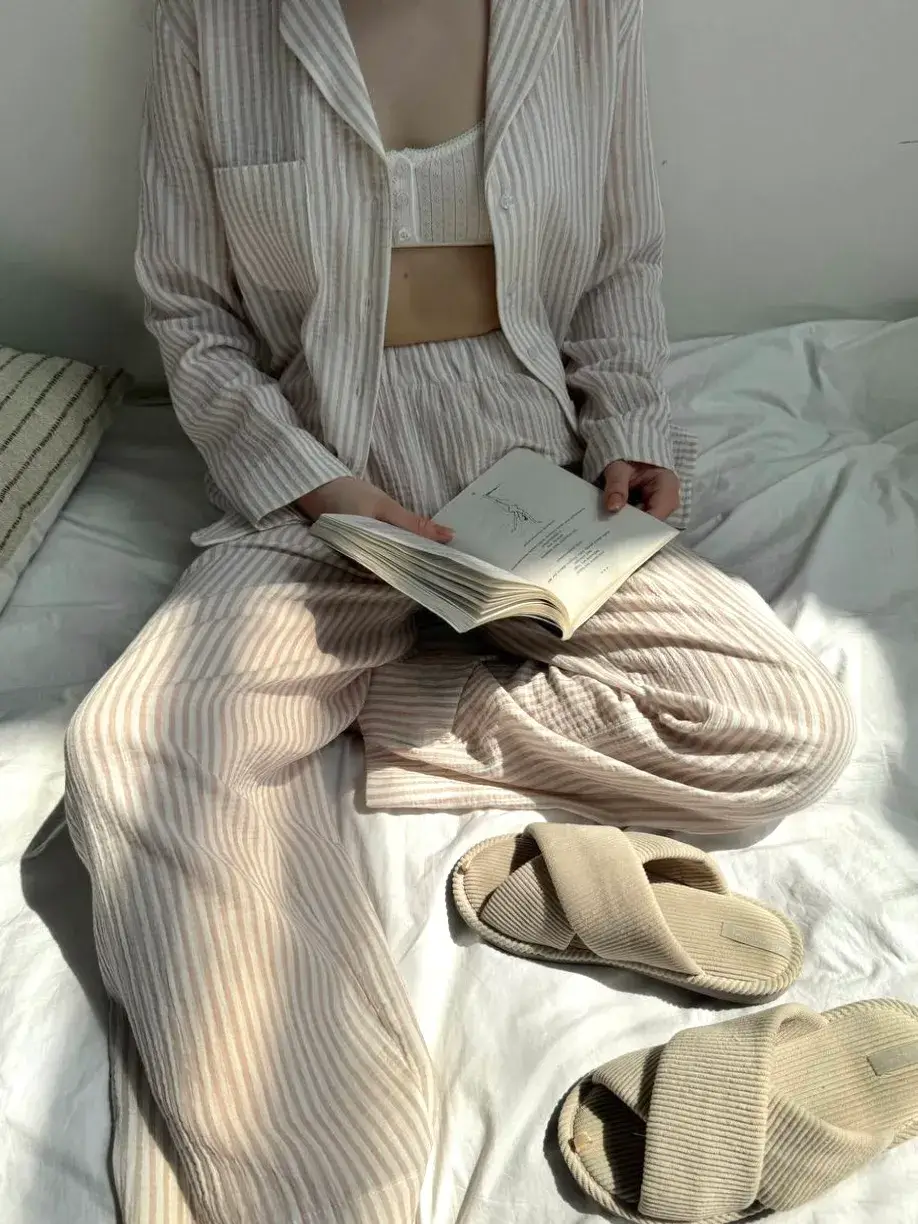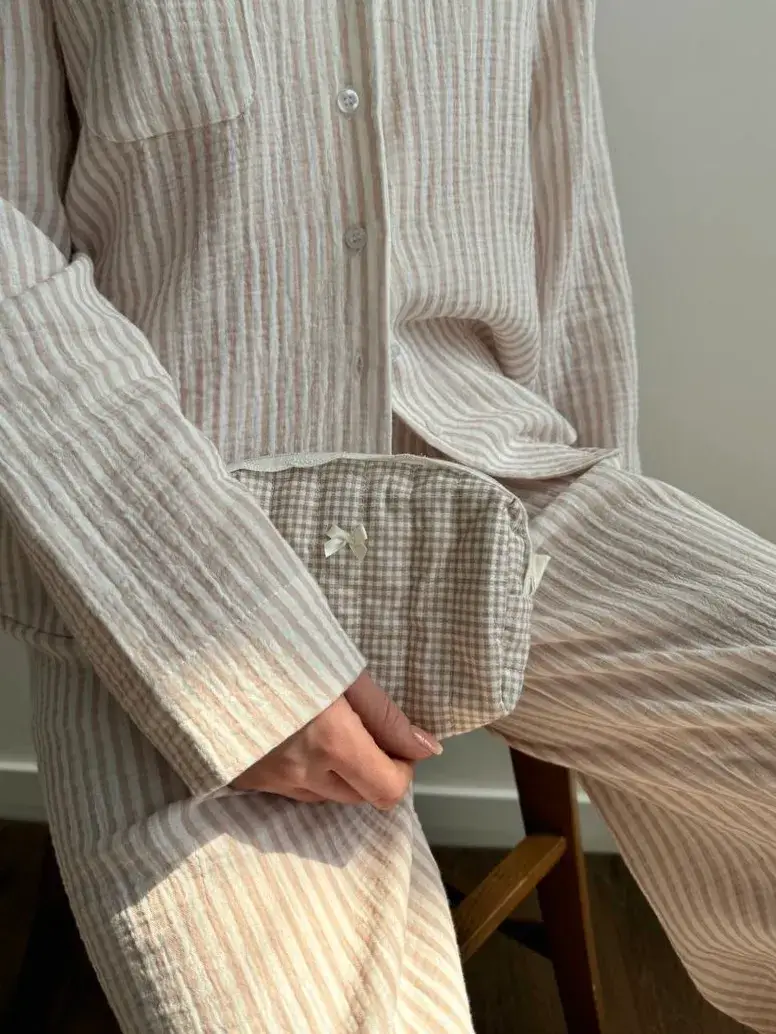 Komplet koszula i spodnie z muślinu to lekka wersja domowa, zapewniająca komfort noszenia na co dzień. Naturalny, miękki materiał jest przyjemny w dotyku i dobrze przepuszcza powietrze.