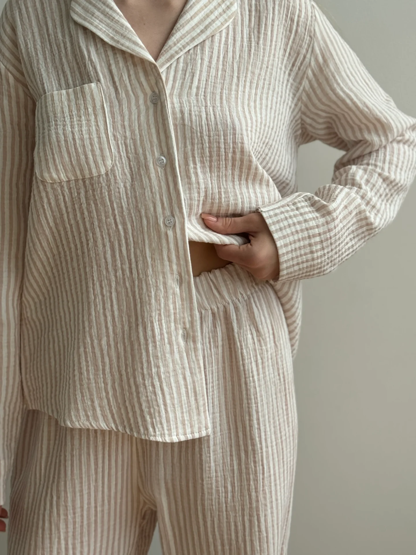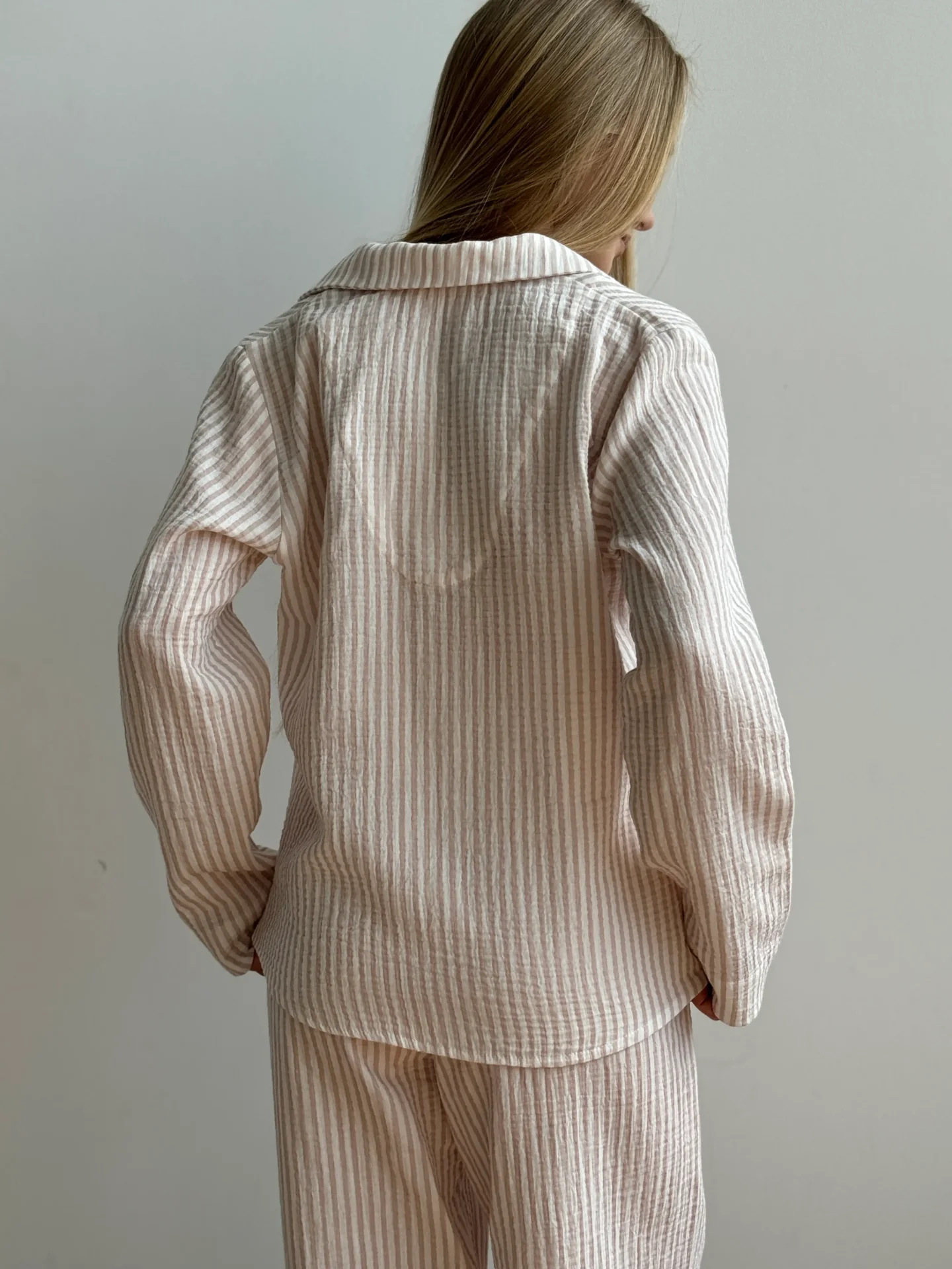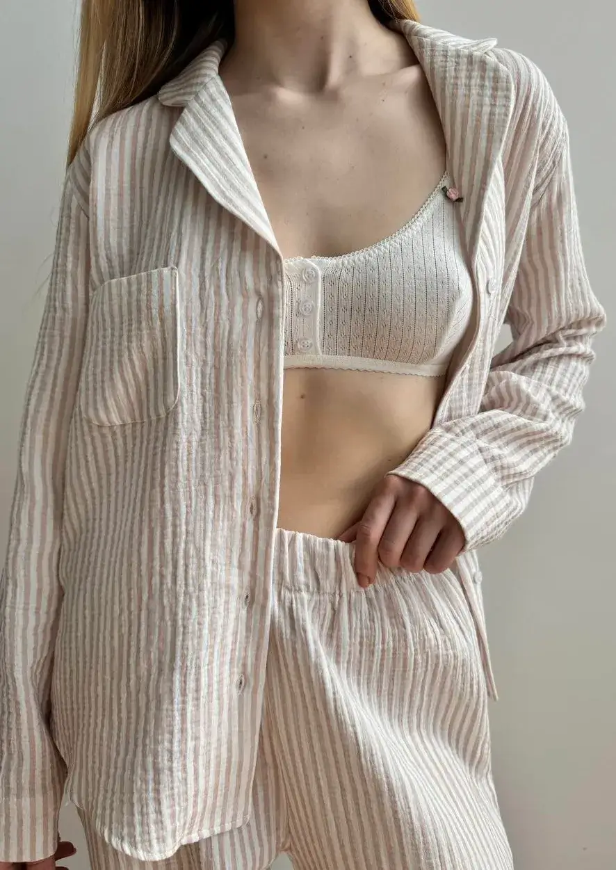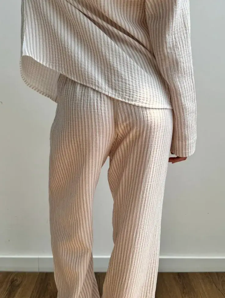 Komplet koszula i spodnie, z muślinu, w beżowe paski