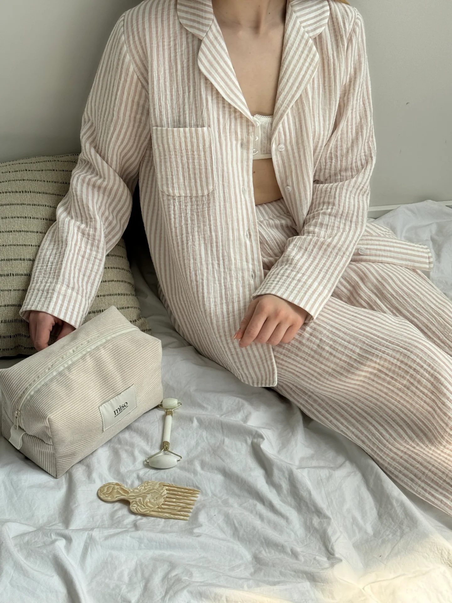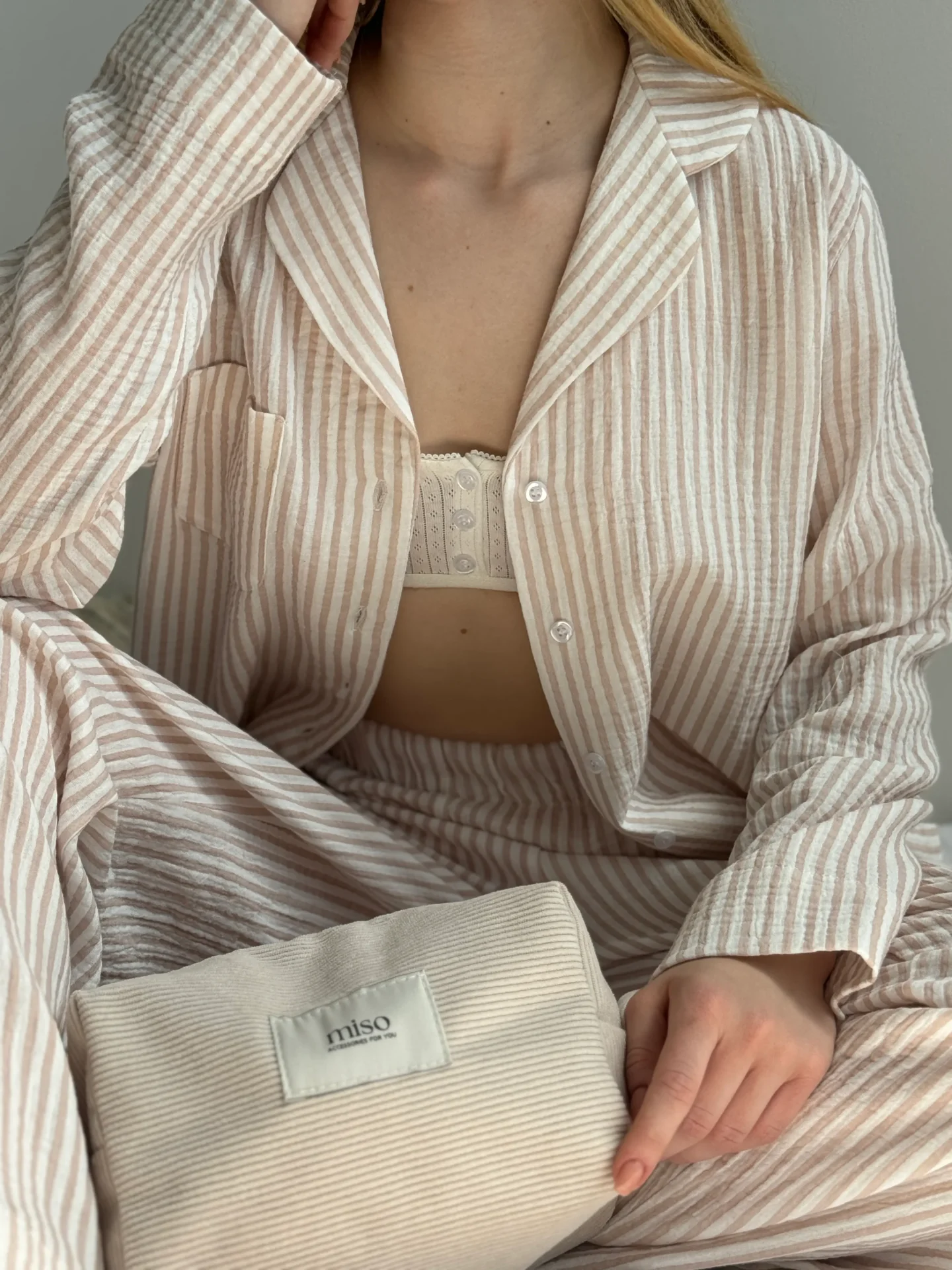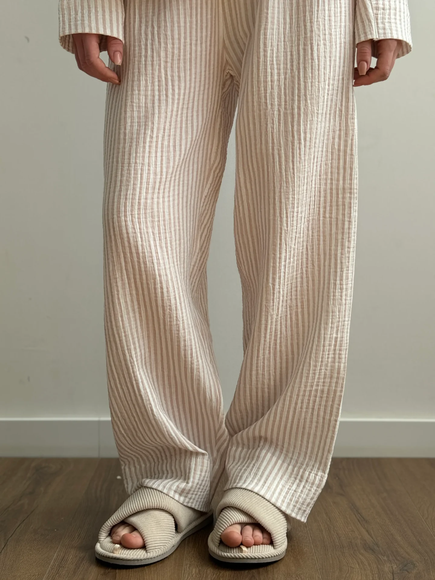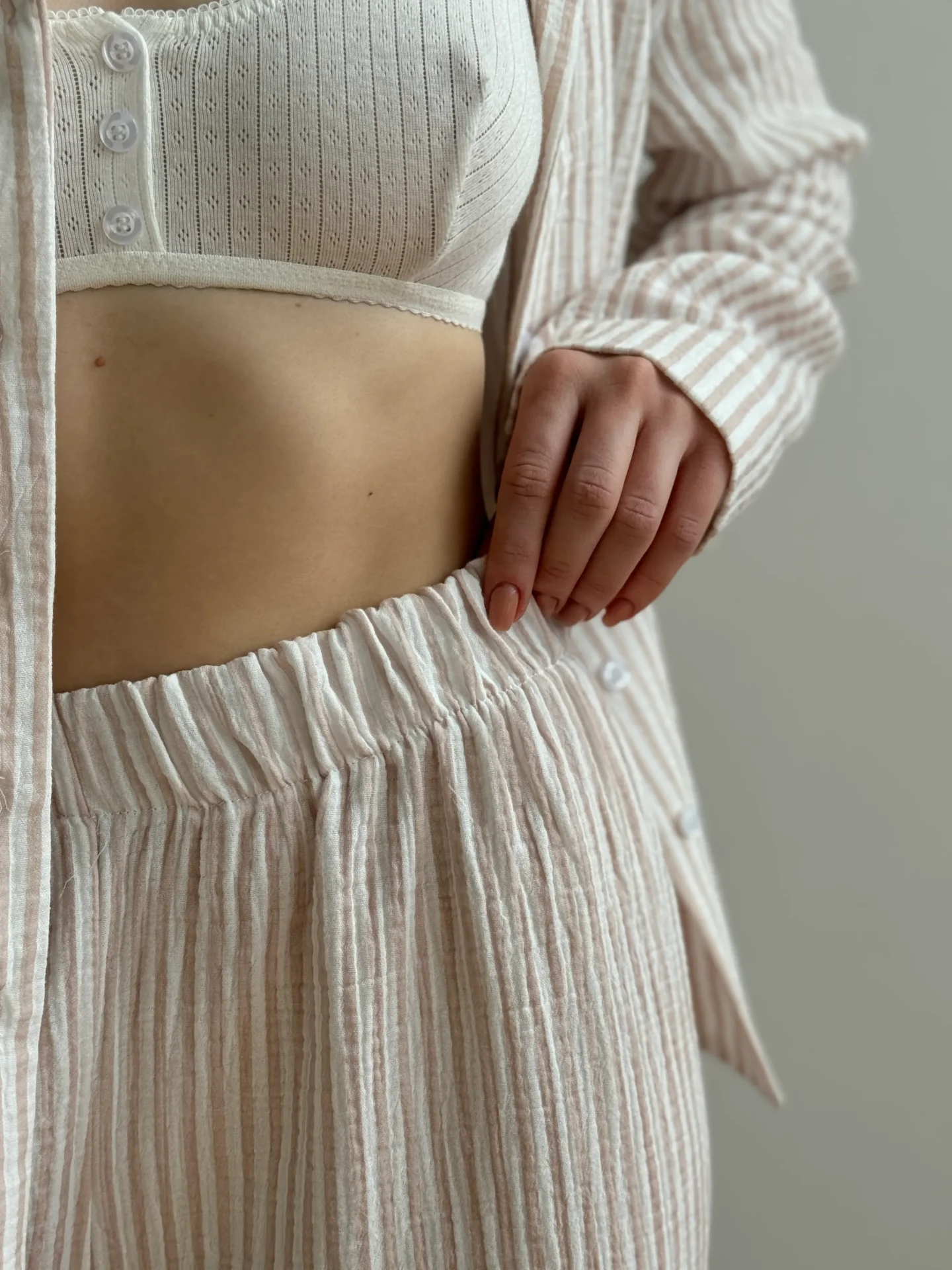 Komplet koszula i spodnie, z muślinu, w beżowe paski