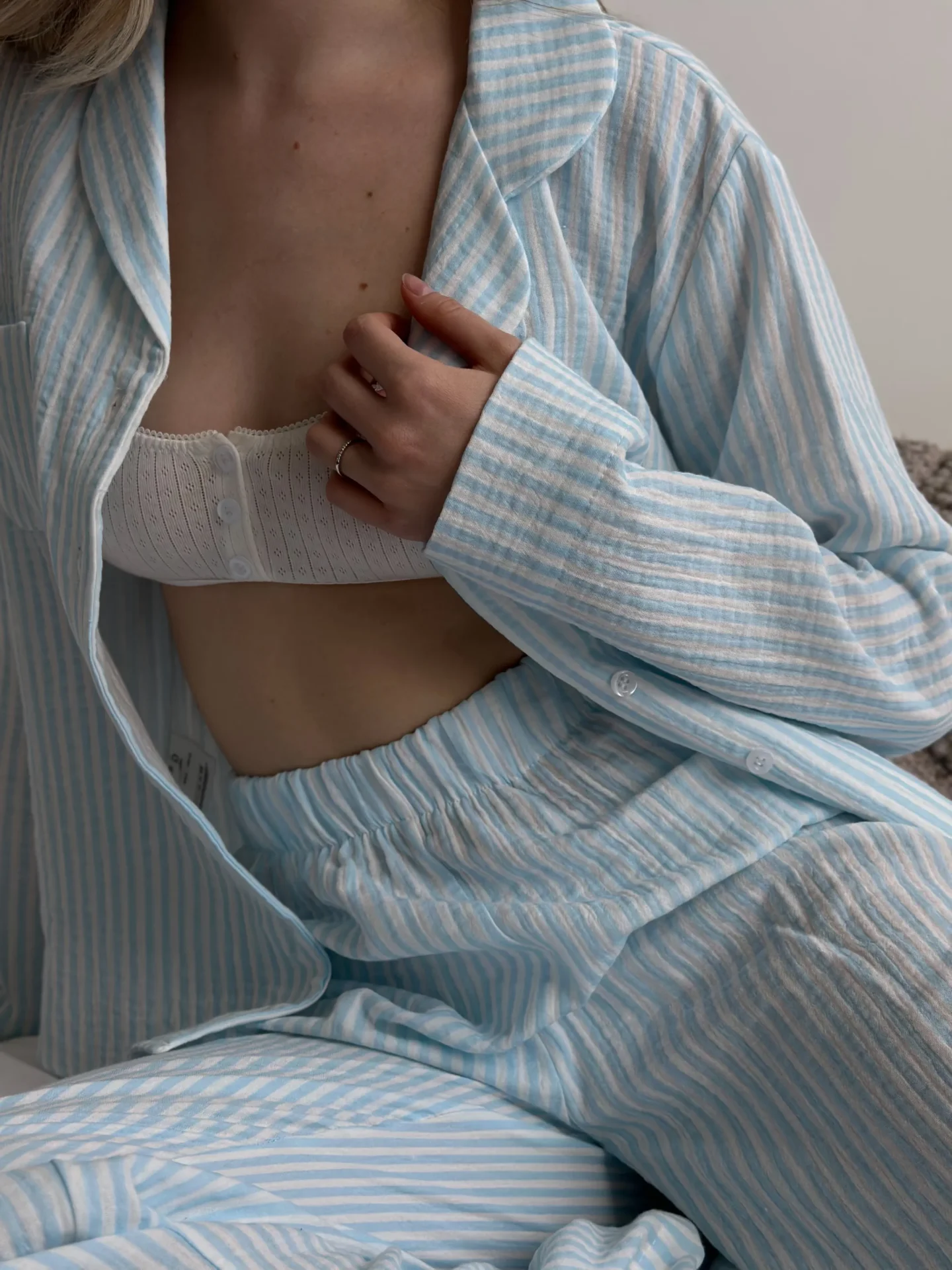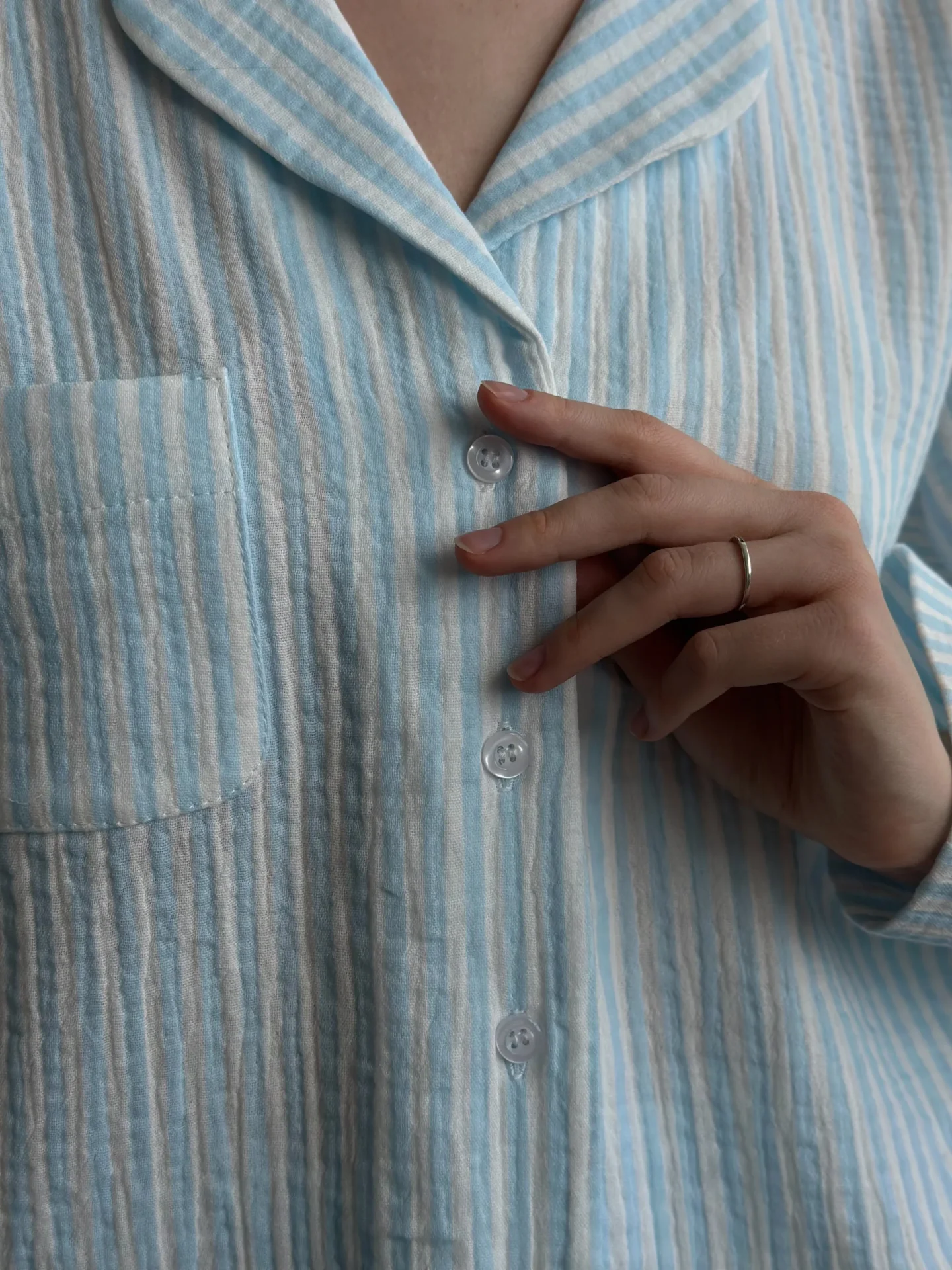 Kombinezon koszula i spodnie z muślinu to lekka wersja domowa, zapewniająca komfort noszenia na co dzień. Naturalny, miękki materiał jest przyjemny w dotyku i dobrze przepuszcza powietrze.