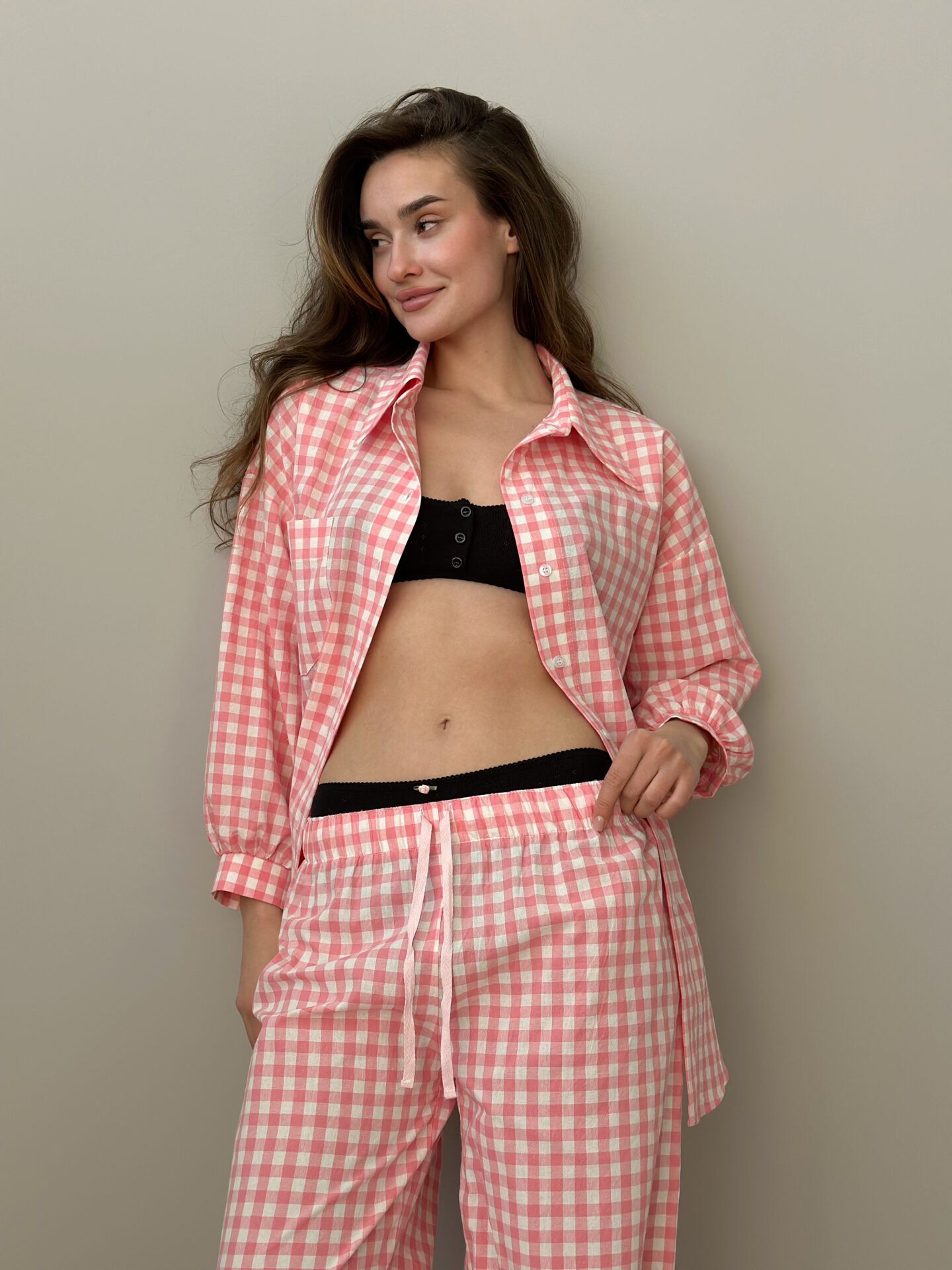 Koszula z bawełny pranej, w różową kratkę