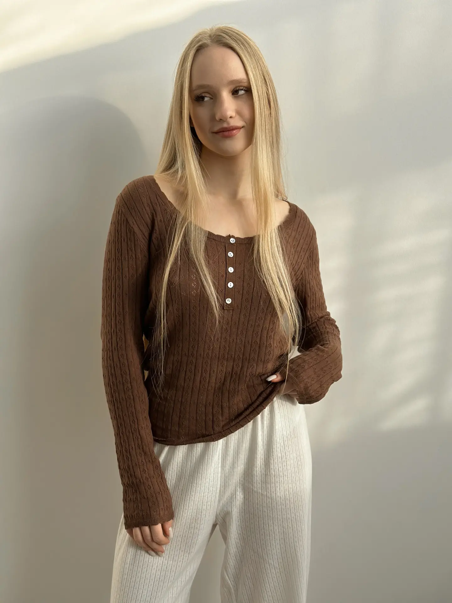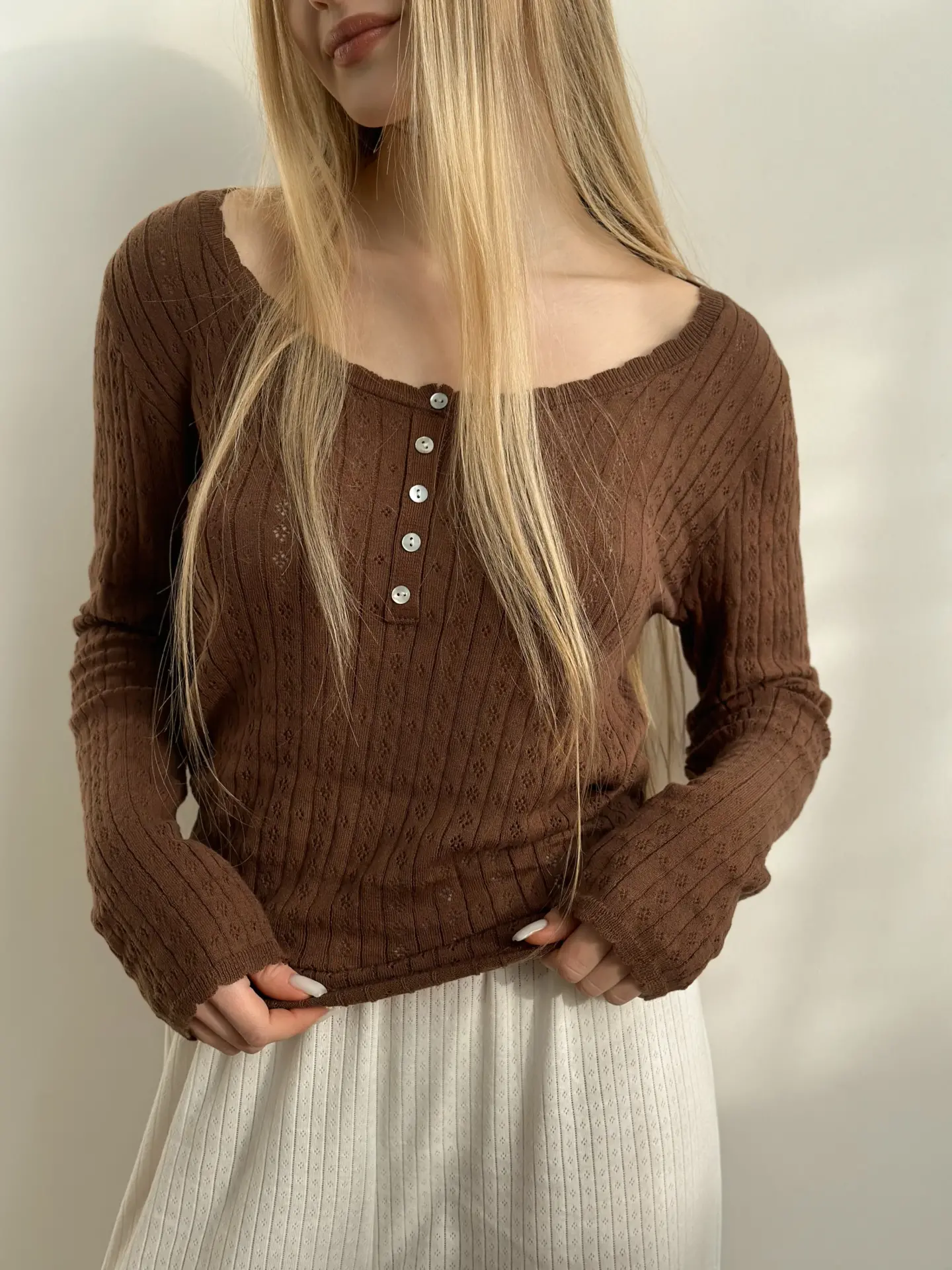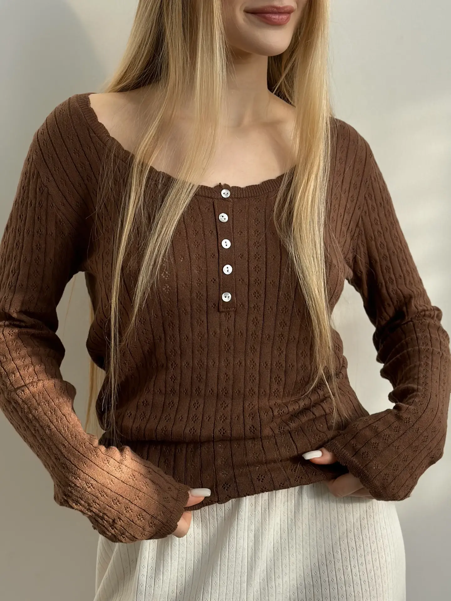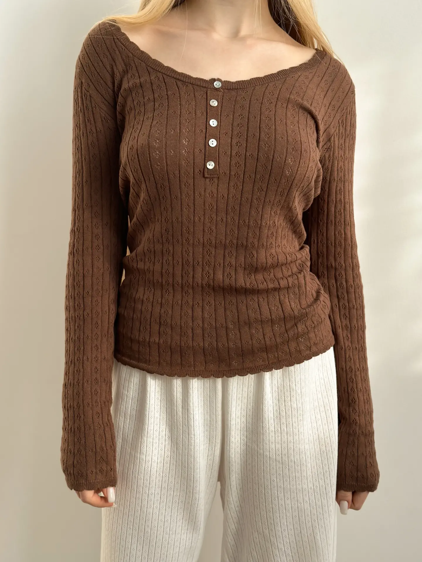 Koszulka dziana z długim rękawem, z bawełny, brązowa