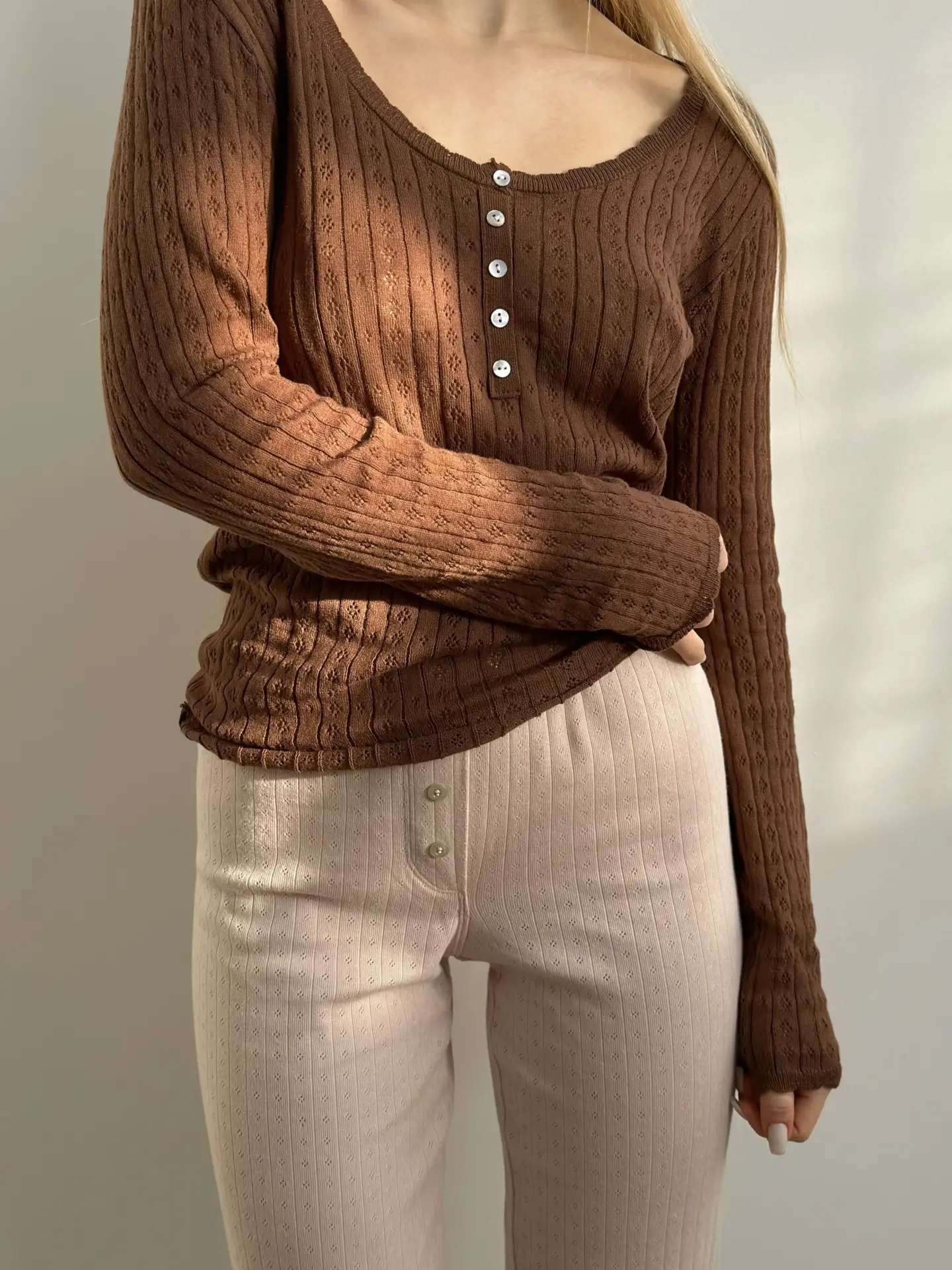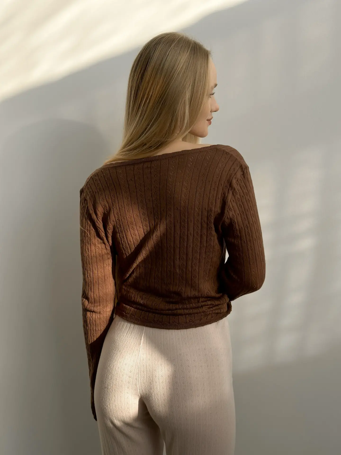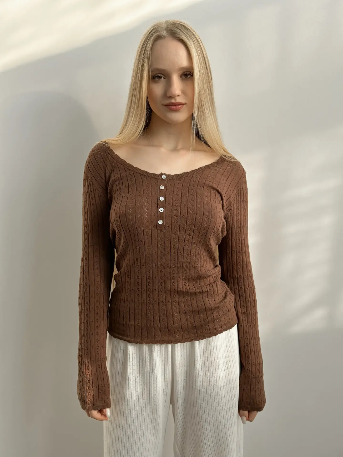 Koszulka dziana z długim rękawem, z bawełny, brązowa